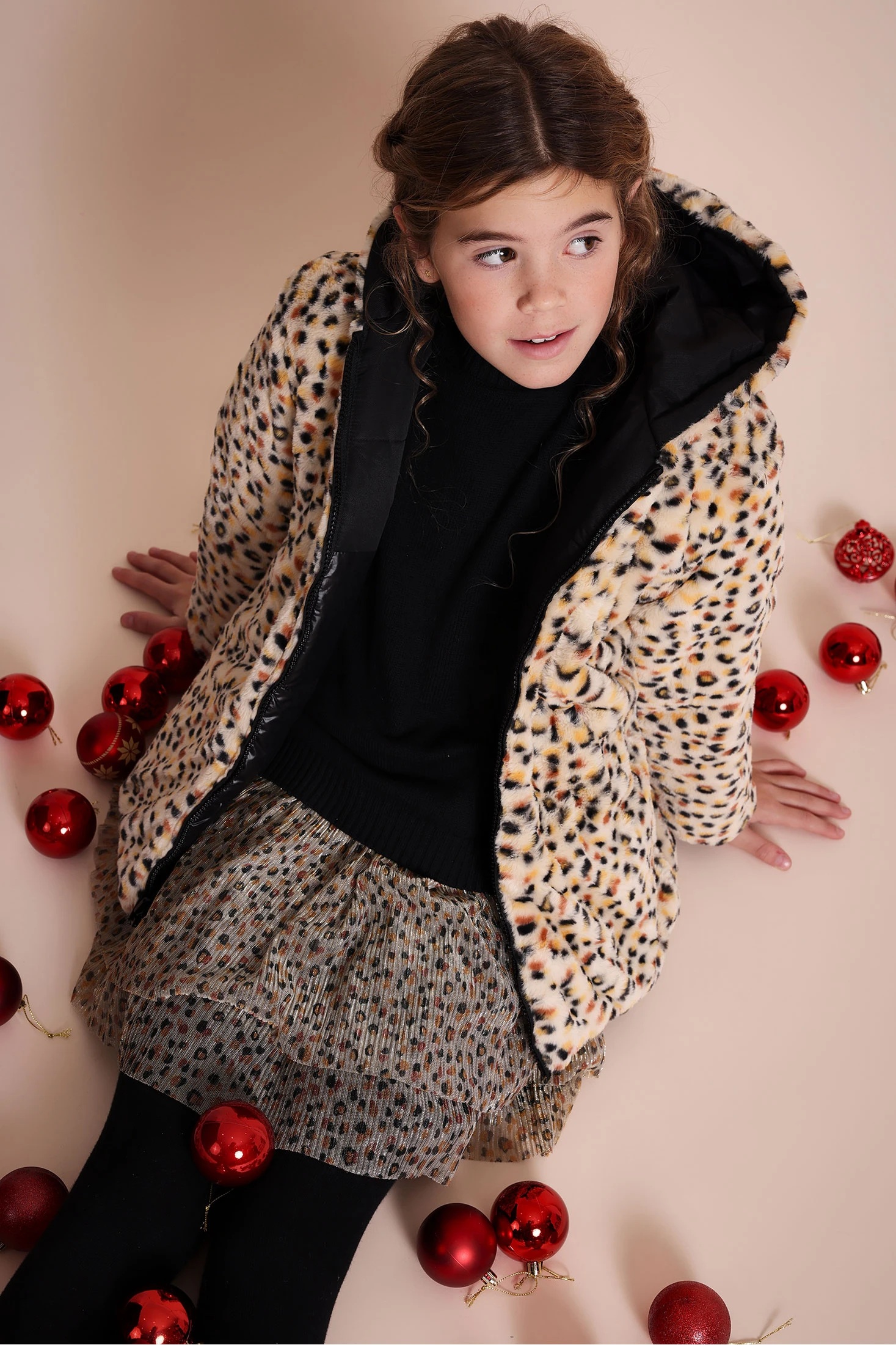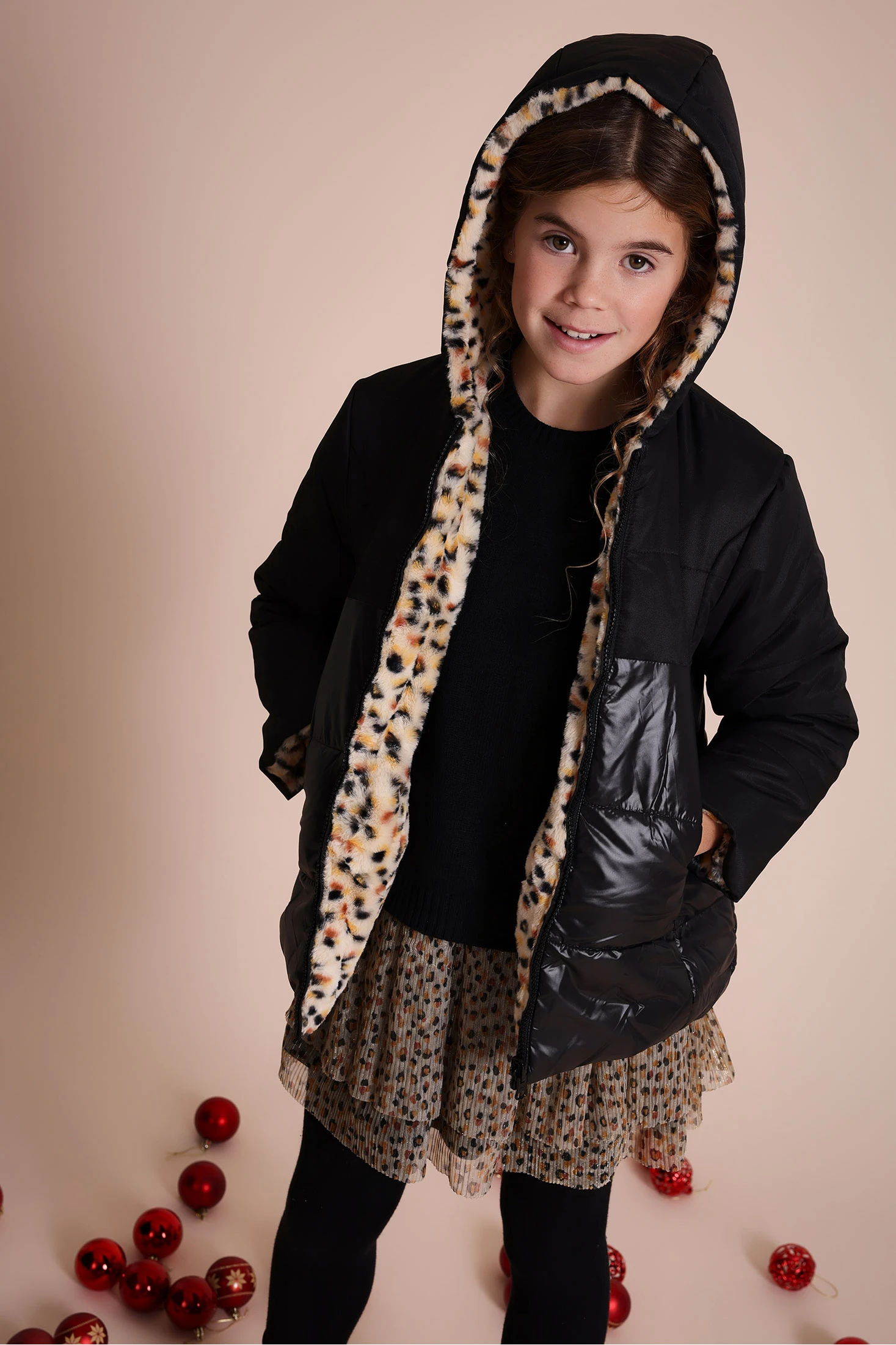 Parka reversível para menina, ideal para as temporadas de outono e inverno, combina um moderno interior de felpa negra com um exterior de estampado leopardo. Desenhada com capuz e fecho de correr, garante calor e conforto nos dias mais frios. Disponível em tamanhos de 2 a 14 anos, é uma peça versátil que complementa qualquer conjunto, adicionando um toque contemporâneo e distintivo. Confeccionada com materiais de alta qualidade, é perfeita para manter a sua filha protegida do frio enquanto está na moda.