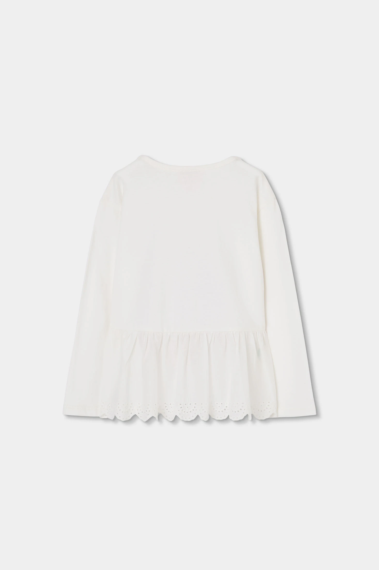 T-shirt de malha combinada com bata bordada nas costas. De cor branca, apresenta um design com uma estampa colorida e detalhes bordados. A t-shirt tem uma gola redonda e mangas compridas. Disponível em tamanhos desde 12 meses até 10 anos, é uma peça versátil que pode ser facilmente combinada com diferentes estilos de roupa para uma aparência casual e alegre.