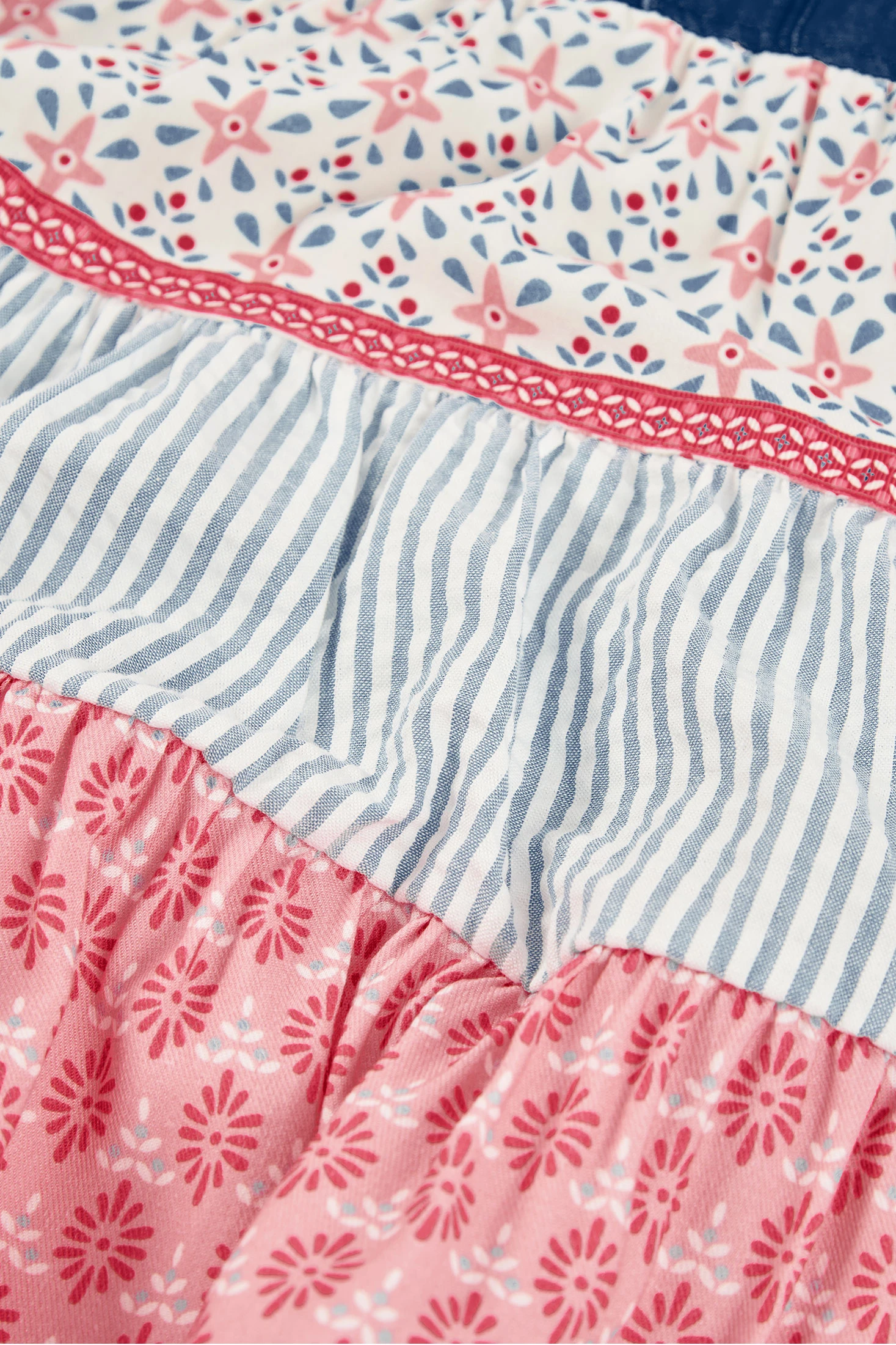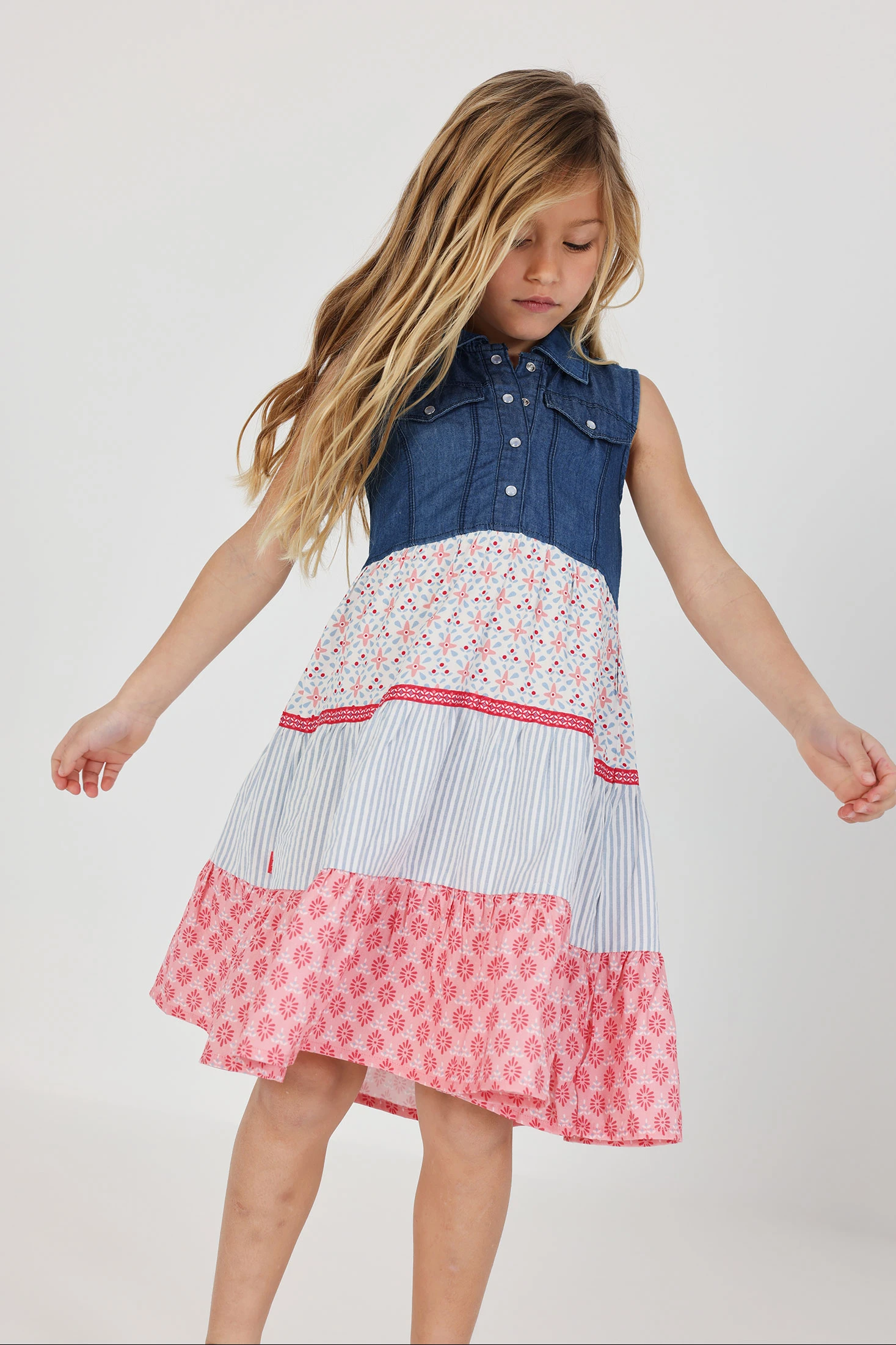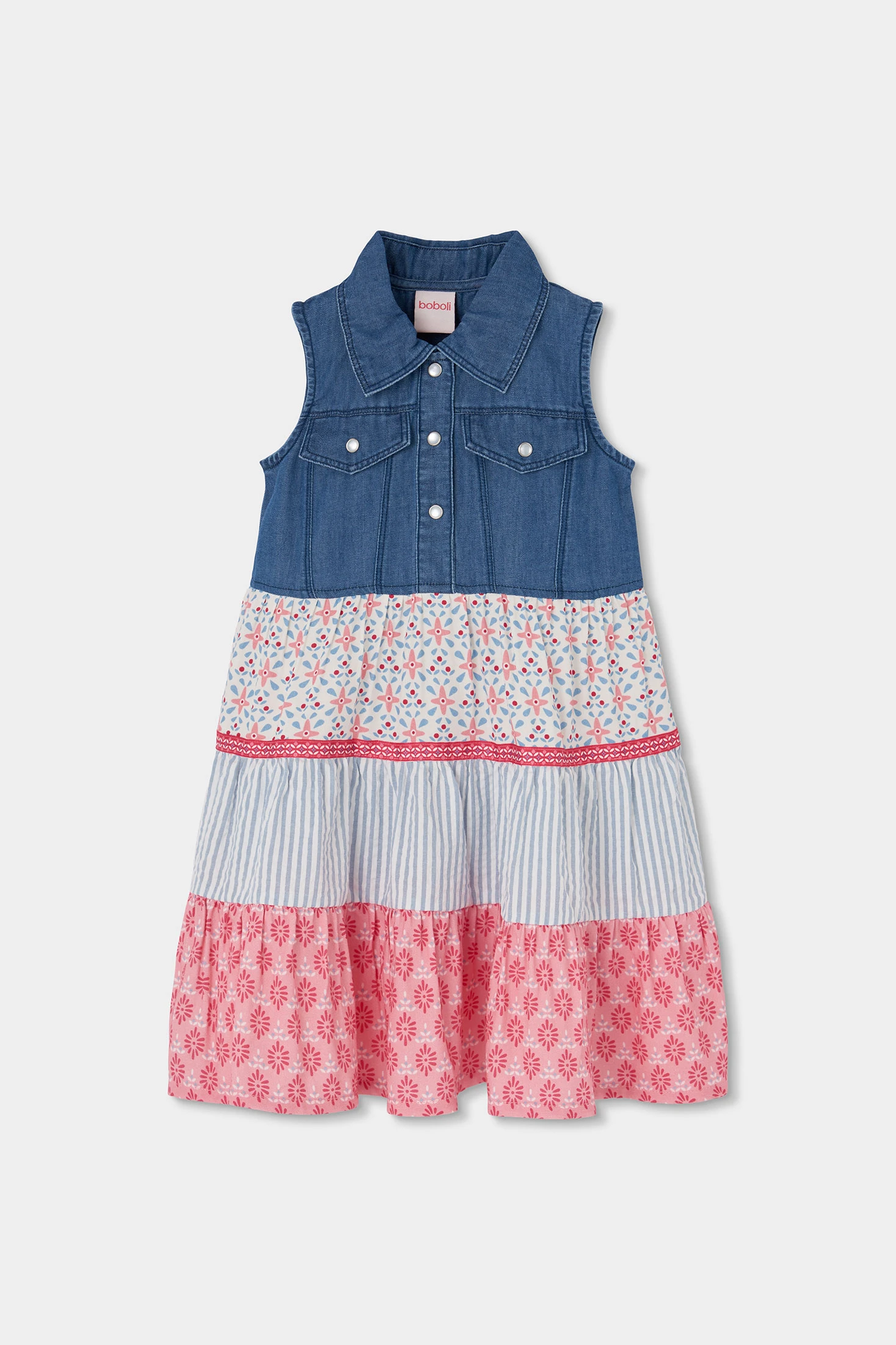 Vestido denim combinado, perfeito para um look de verão alegre. A parte superior é de tecido jeans com colarinho clássico e botões, enquanto a saia tem camadas de diferentes estampados e cores: flores e riscas em tons rosas e azuis. Disponível em tamanhos desde 12 meses até 10 anos, o seu design sem mangas permite liberdade de movimento. É uma peça versátil que combina estilo e conforto, adequada para dias ensolarados e ocasiões especiais.