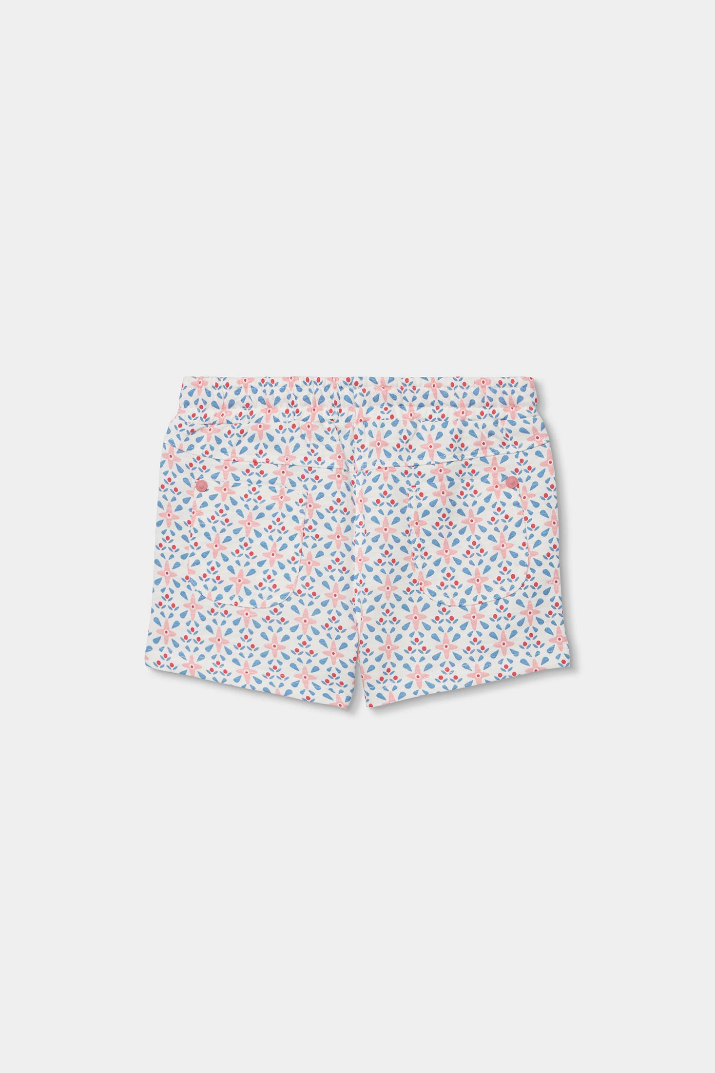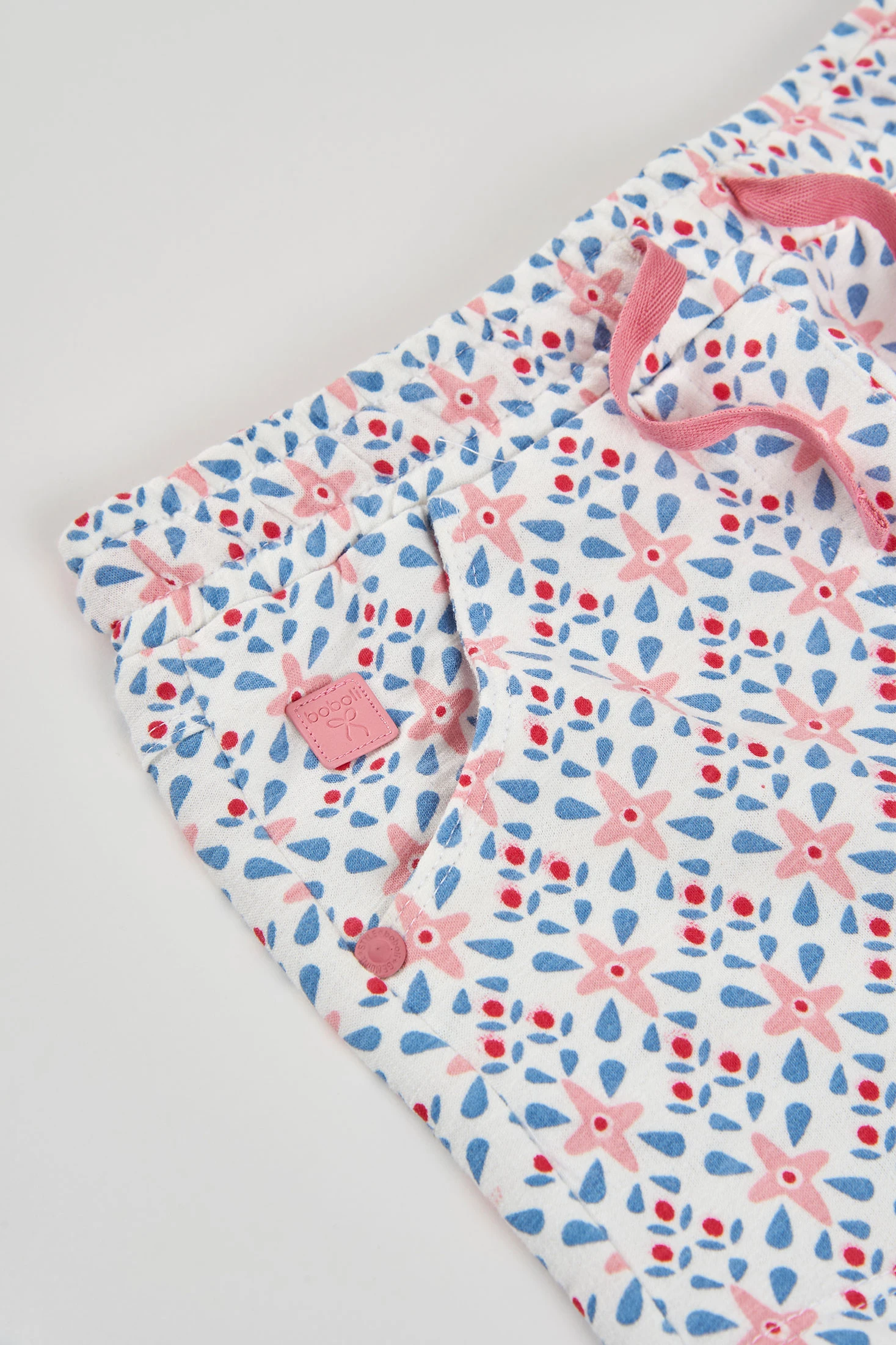 Calções de pelfa estampados, perfeitos para os meses mais quentes. O seu design apresenta um estampado alegre de flores em tons pastel, sobre um fundo branco. Confeccionados em tecido de pelfa suave, garantem conforto e liberdade de movimento. A cintura ajustável com laço rosa proporciona um ajuste seguro. Disponível em tamanhos desde 12 meses até 10 anos. Ideal para combinar com camisetas lisas para um look de verão fresco.