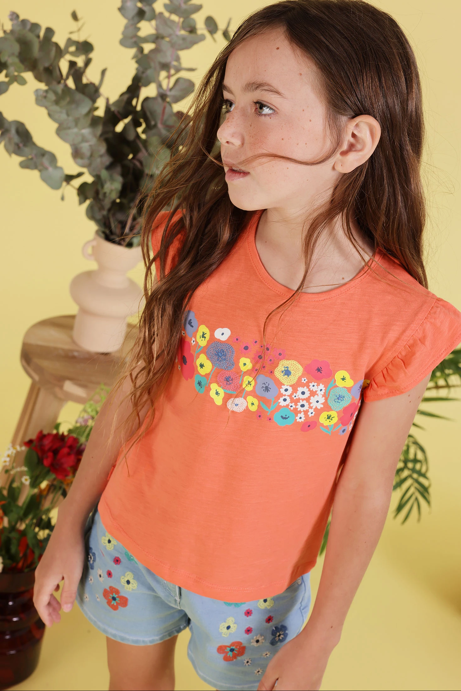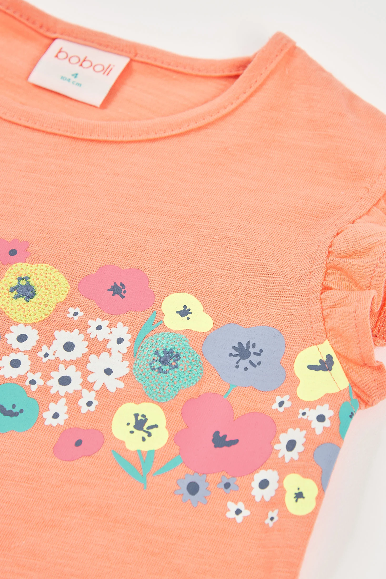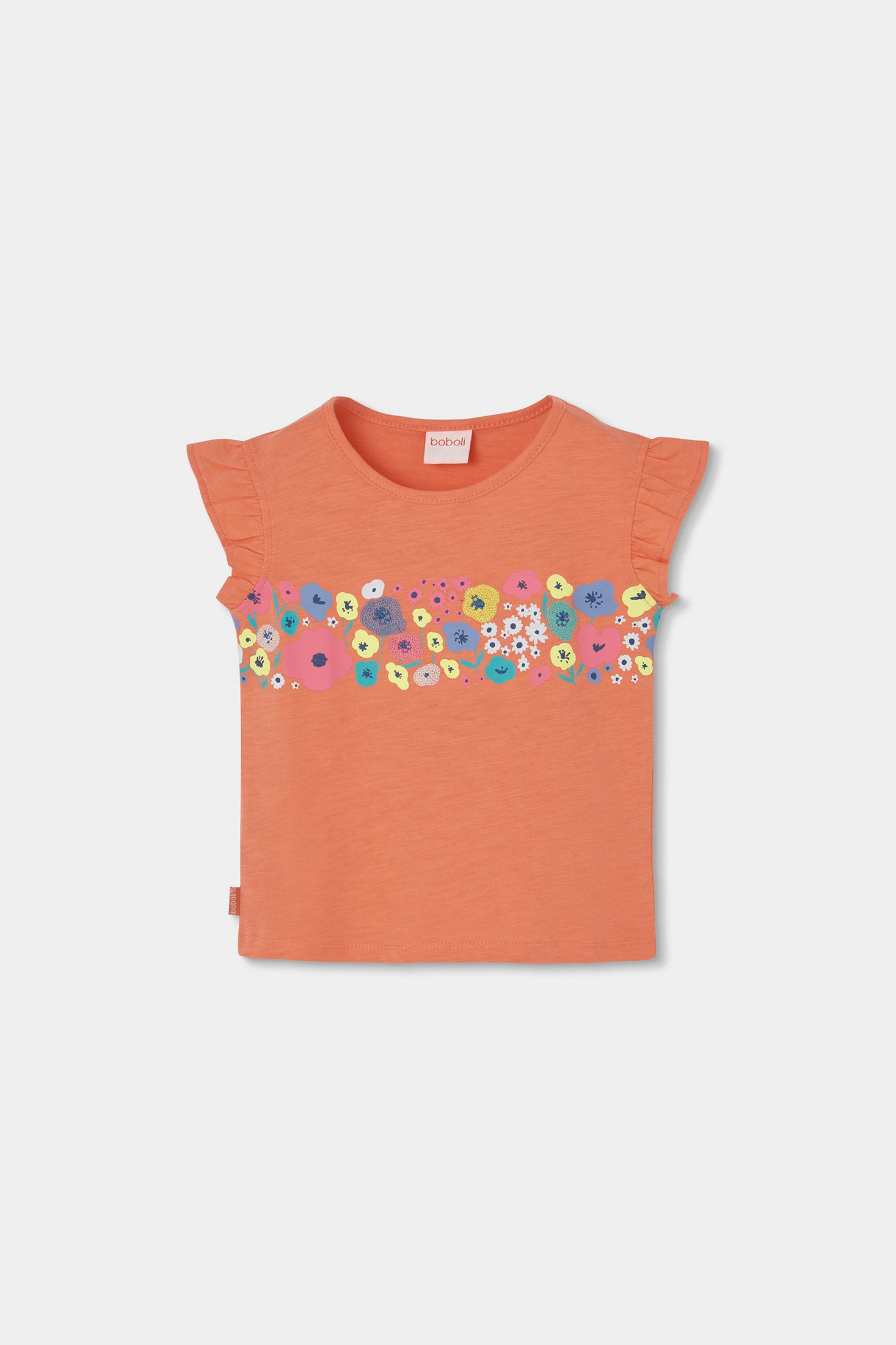 T-shirt de algodão para menina na cor laranja, perfeita para o dia a dia. O design apresenta uma estampa de flores coloridas que adicionam um toque alegre e divertido. As mangas são curtas com um detalhe franzido. Disponível em tamanhos desde 12 meses até 10 anos, ajusta-se confortavelmente ao crescimento da menina. Ideal para combinar com saias ou calças em dias quentes, esta t-shirt destaca-se pela sua suavidade e estilo encantador.