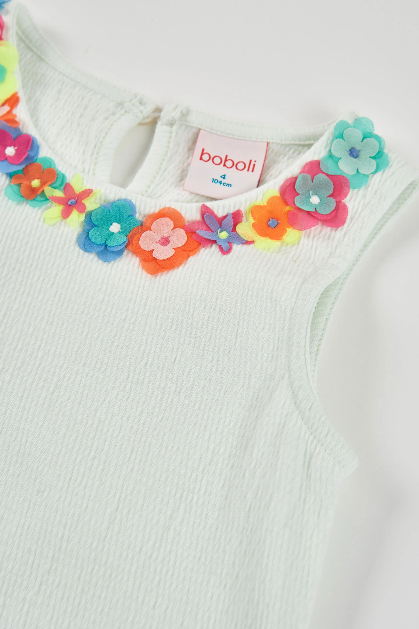 Camiseta de malha fantasia na cor pérola para menina. Apresenta um design simples com aplicações de flores multicolores na gola, que proporcionam um toque alegre. É uma peça versátil e confortável, perfeita para combinar com diferentes estilos. Está disponível em tamanhos desde 12 meses até aos 10 anos, adaptando-se ao crescimento. O seu tecido suave e leve garante conforto durante todo o dia. Uma opção encantadora para adicionar cor e estilo ao guarda-roupa de qualquer menina.