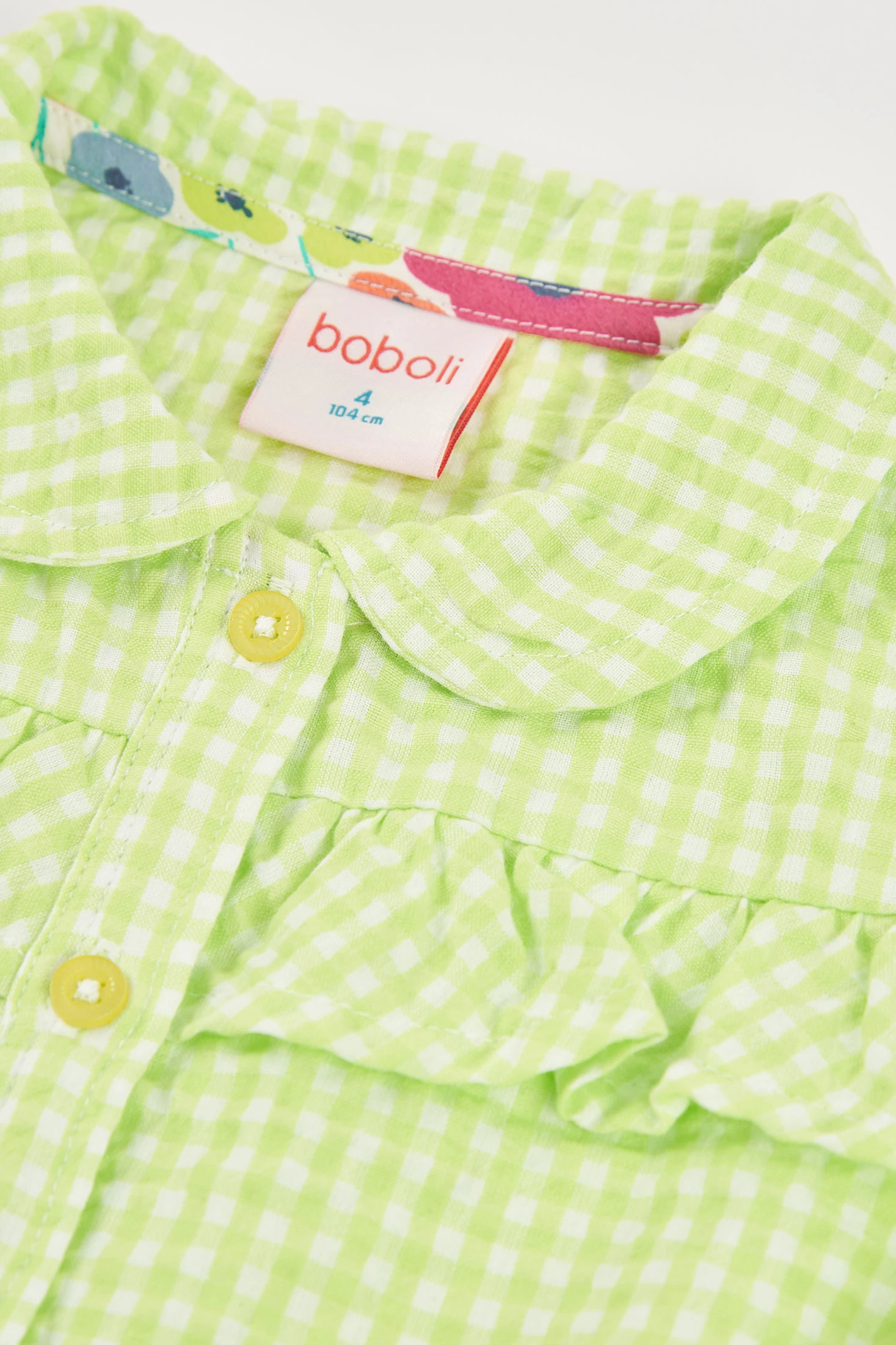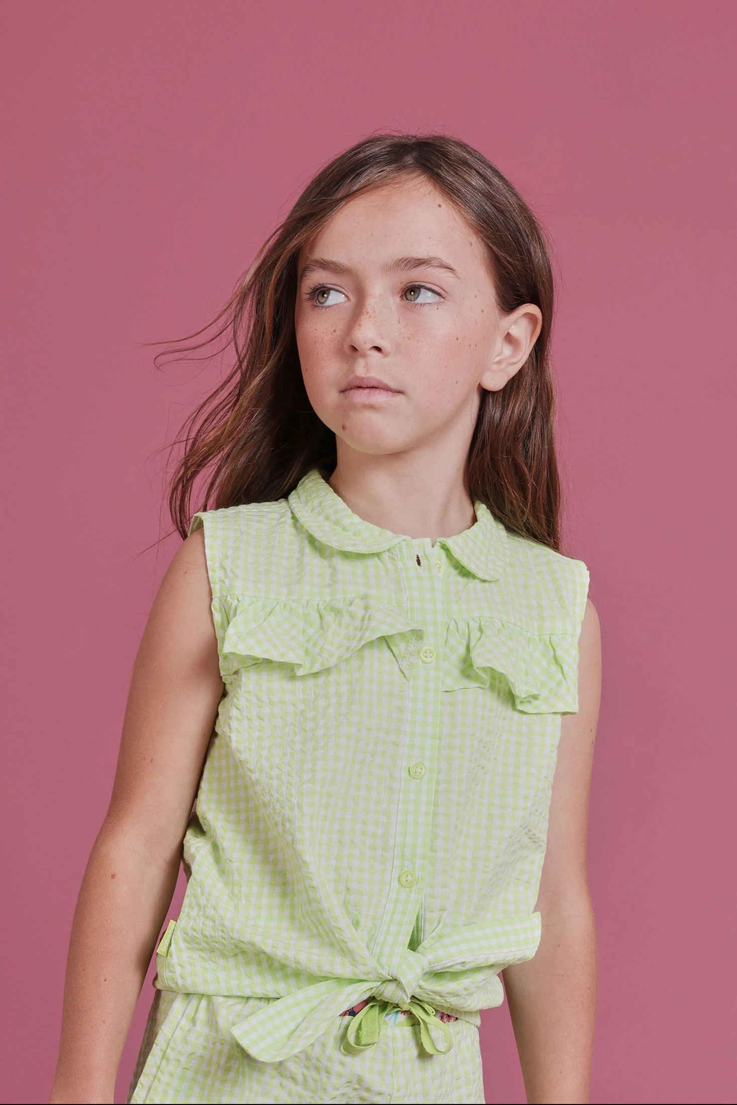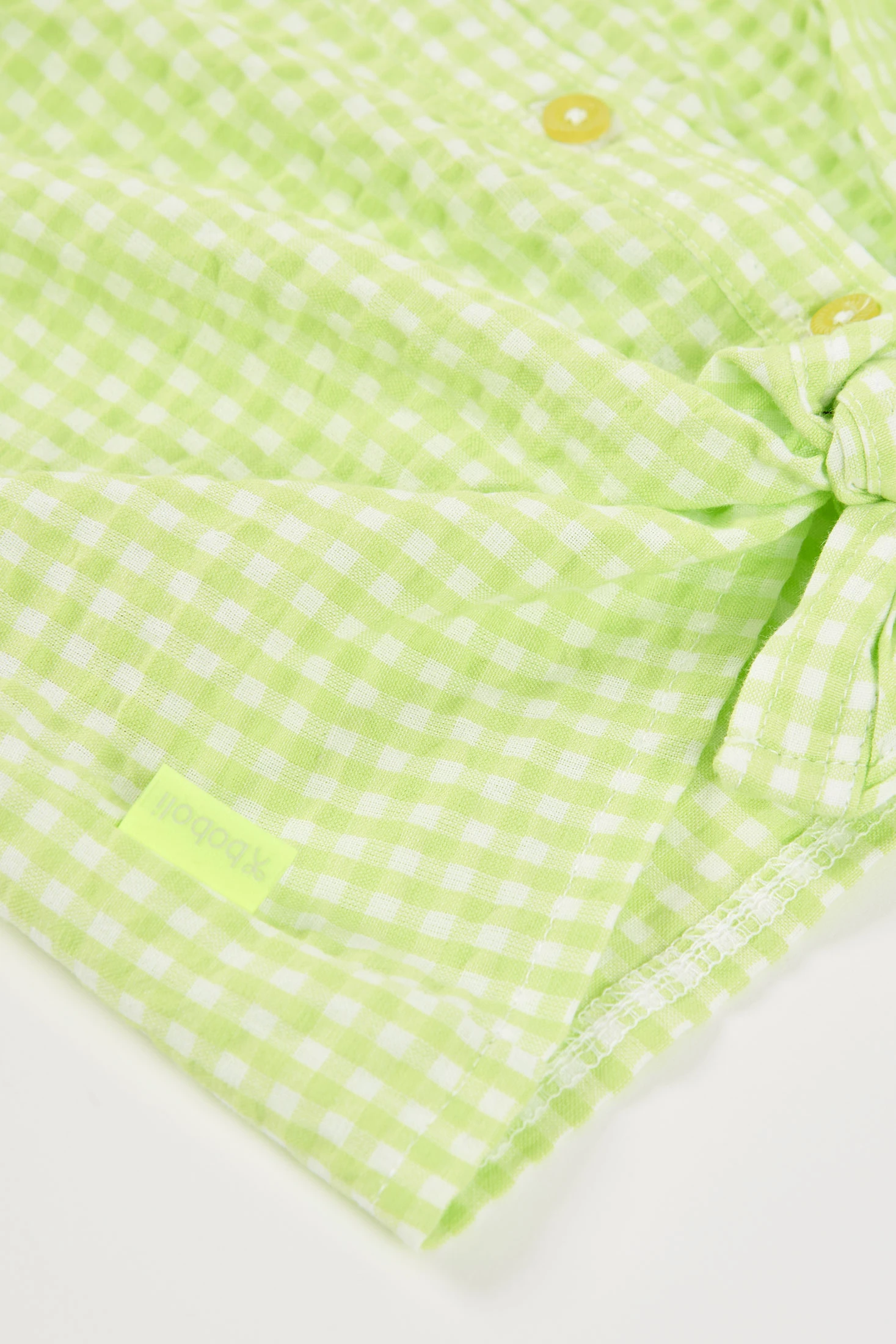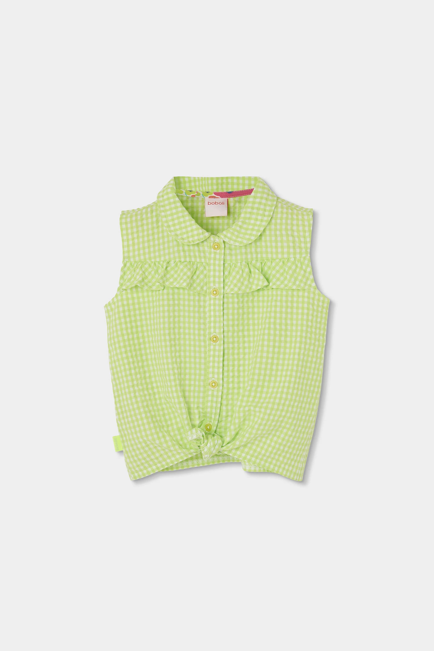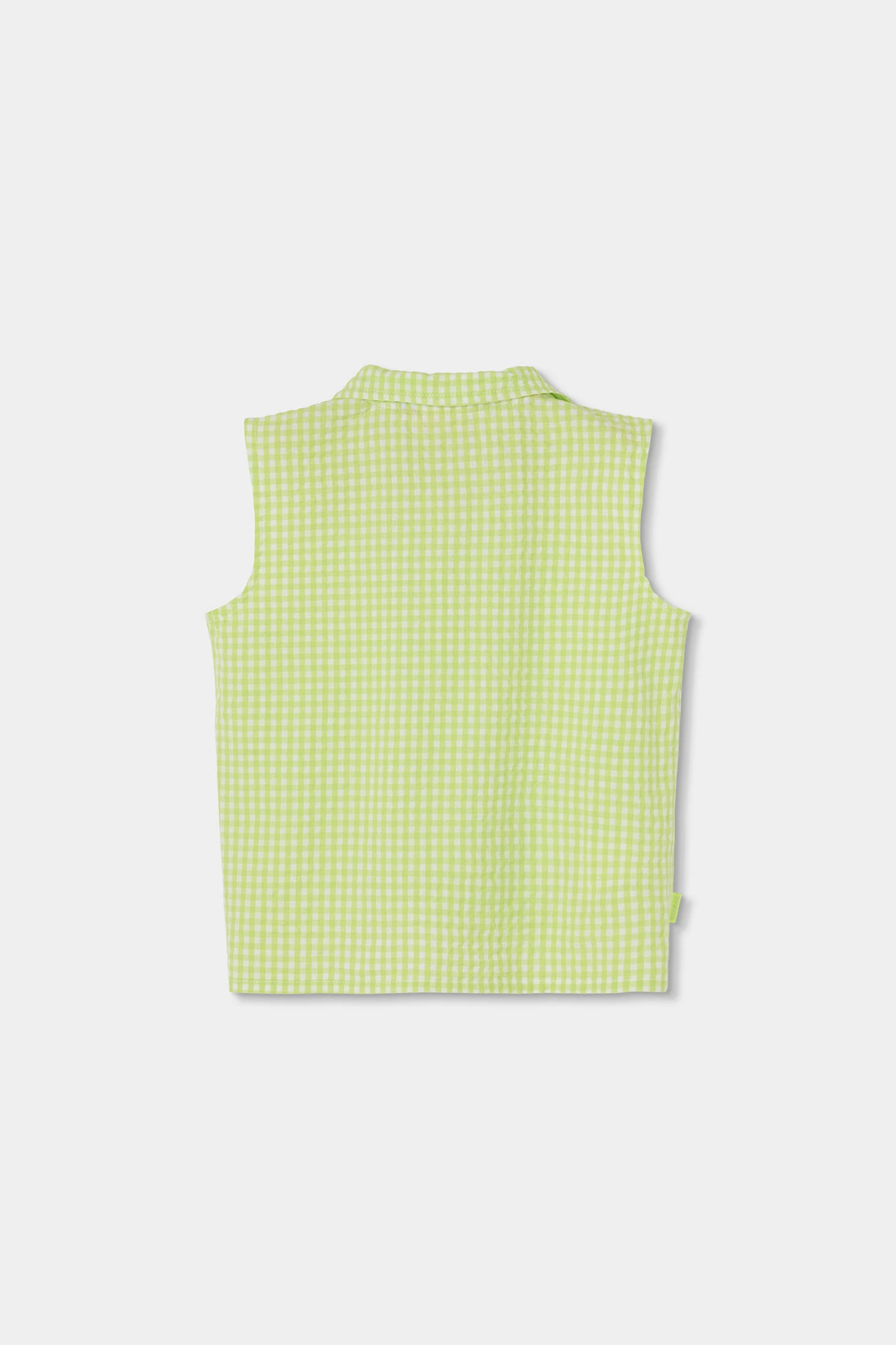 Camisa de popelina para menina perfeita para qualquer estação. Com um design de xadrez vichy em cor lima e pérola, oferece um estilo fresco e moderno. Apresenta uma gola clássica e botões frontais, complementados com um detalhe de laço na parte inferior. Sem mangas. Disponível em tamanhos de 12 meses até 10 anos, é uma peça versátil que se adapta a diversas idades e estilos, oferecendo conforto e elegância em cada uso.
