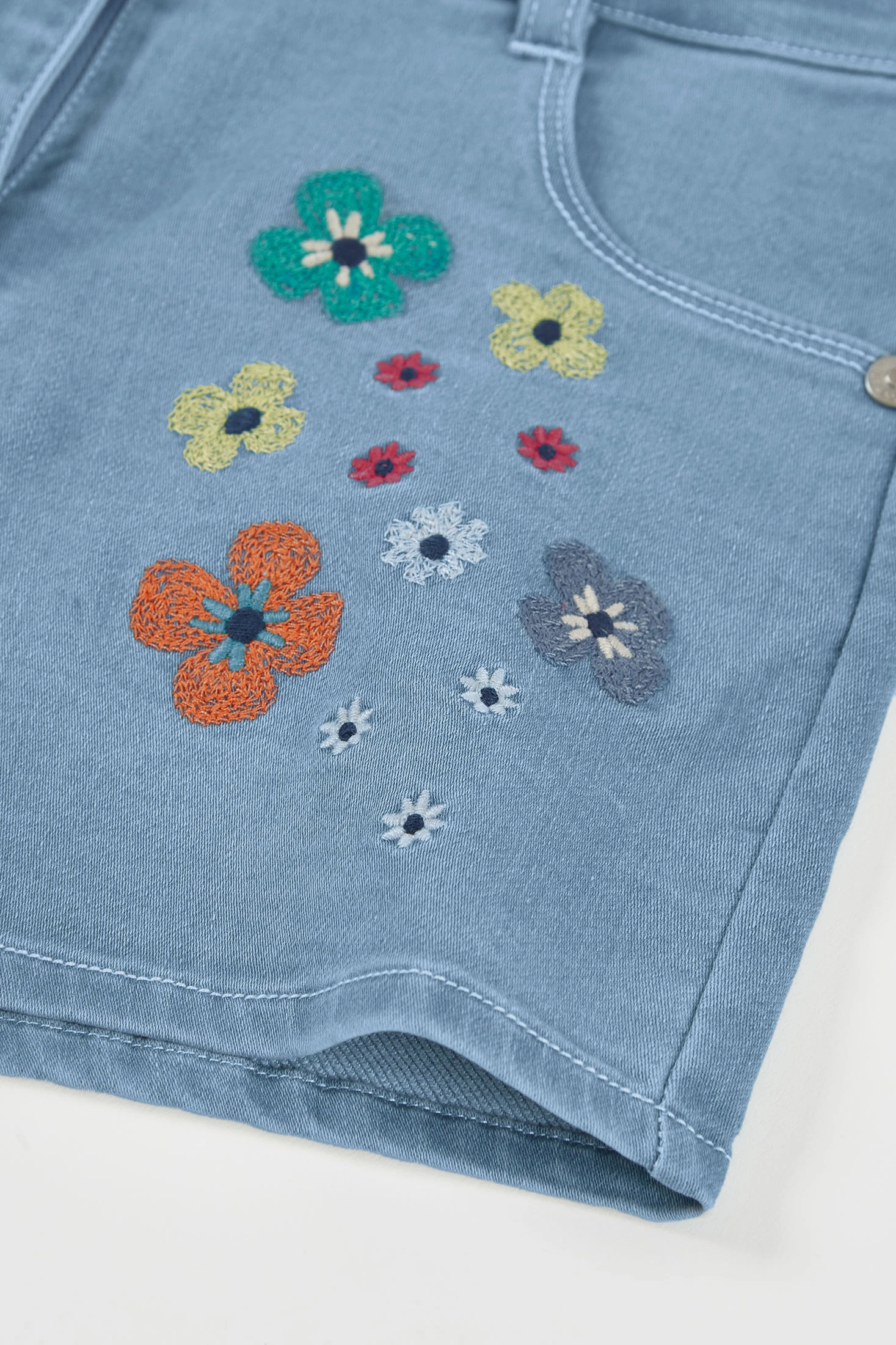 Short denim bleach para menina, ideal para o verão. Tem flores bordadas em várias cores que lhe conferem um toque alegre e divertido. Confeccionado em denim, e cintura ajustável com botão interior que oferece durabilidade e conforto para o uso diário. Disponível em tamanhos desde 12 meses até 10 anos, adapta-se a diferentes fases de crescimento. Combine-o com blusas lisas para destacar a sua estampa floral.