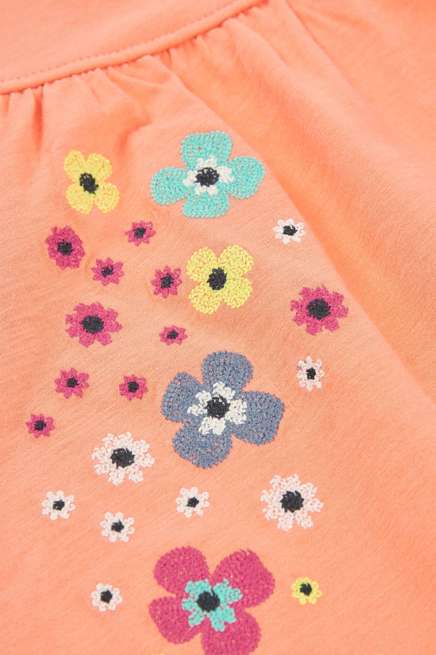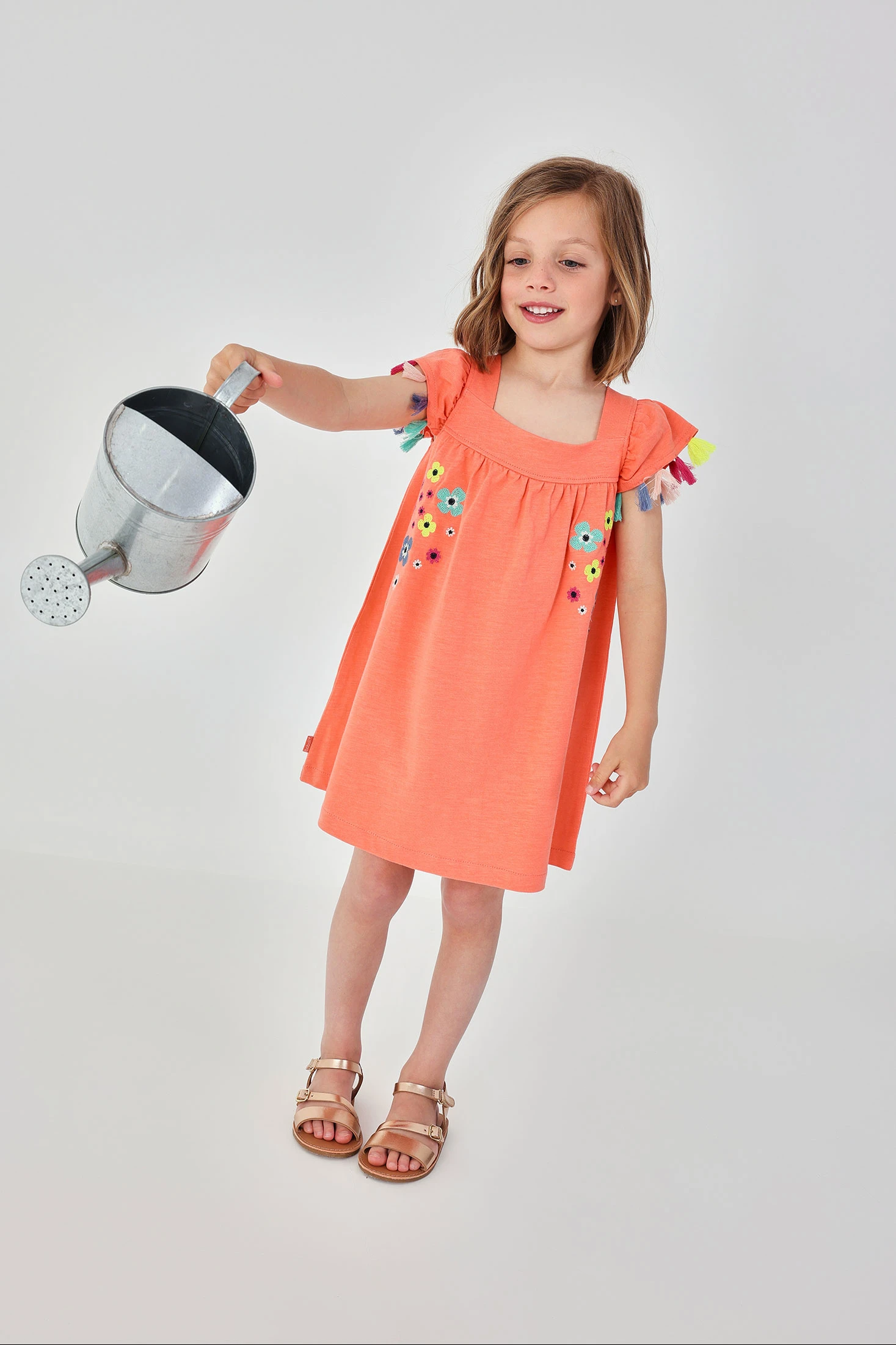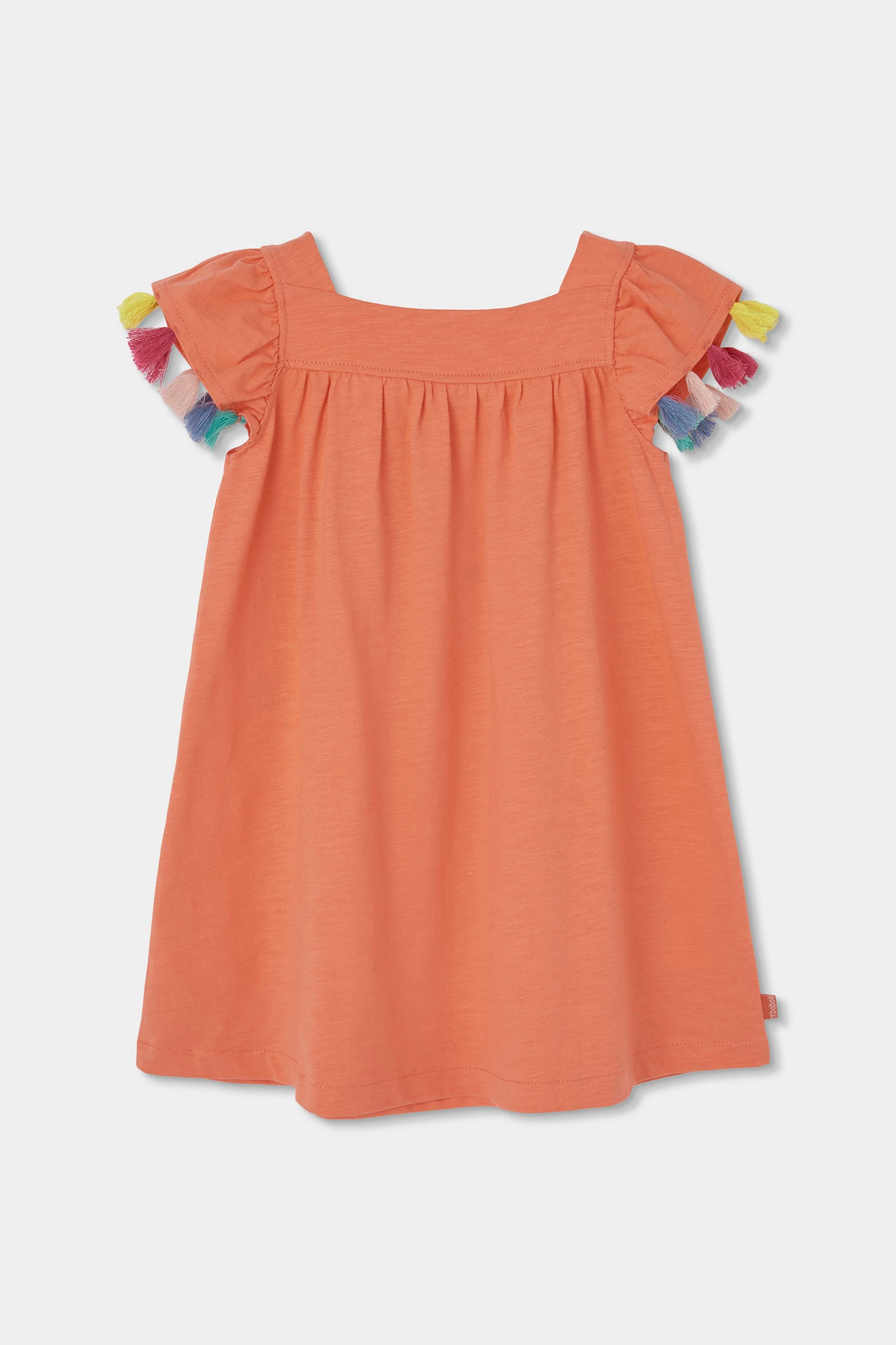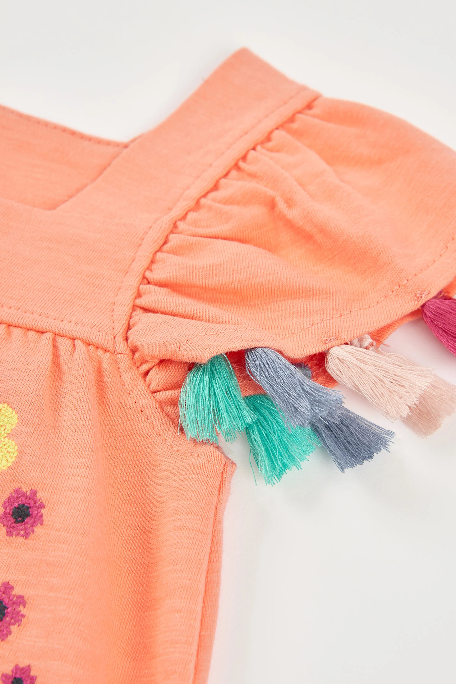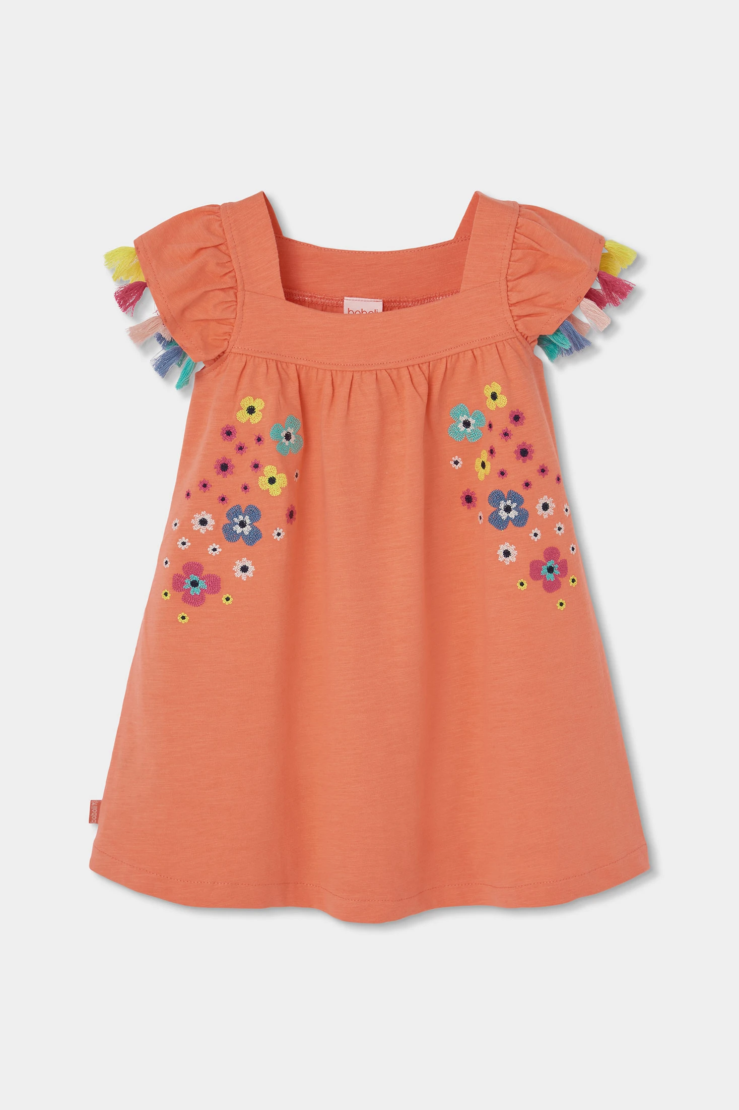 Vestido de malha flamé na cor laranja, perfeito para as pequenas da casa. Possui um alegre design de flores bordadas que acrescentam um toque colorido. Mangas curtas decoradas com pequenas borlas multicolores, oferece um estilo único. Fabricado em um material suave e confortável, é ideal para usar durante todo o dia. Disponível em tamanhos desde 12 meses até 10 anos. Este vestido é perfeito para diferentes ocasiões.