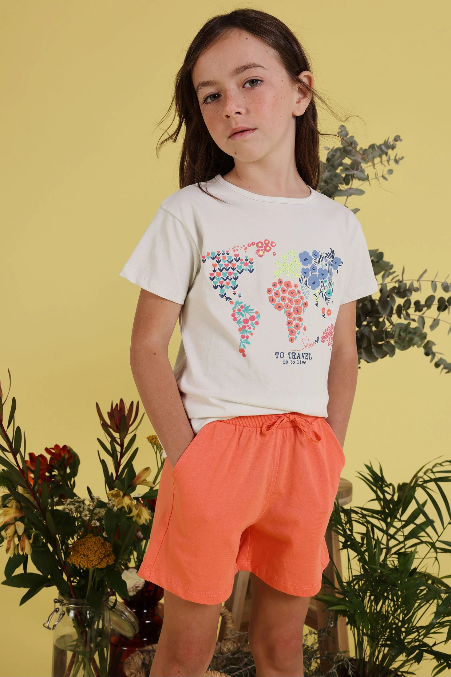 Conjunto de t-shirt e calções de algodão para menina, ideal para o verão. A t-shirt em cor pérola apresenta uma estampa animada em várias cores, adicionando um toque divertido. Os calções são de cor laranja. Disponível em tamanhos desde 12 meses até 10 anos, adapta-se a diferentes idades. Perfeito para dias quentes, este conjunto combina estilo e conforto, ideal para passeios casuais e momentos de brincadeira.