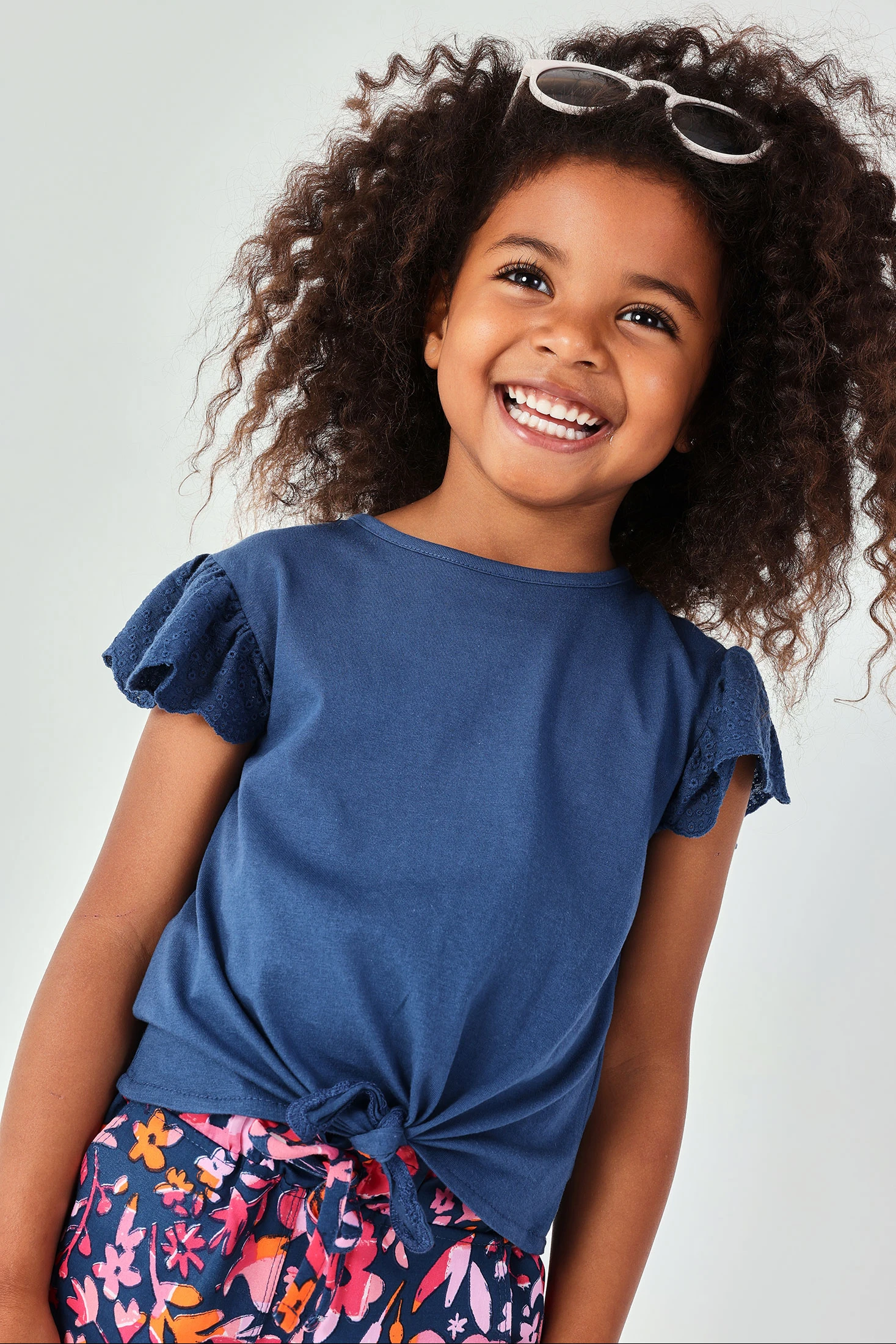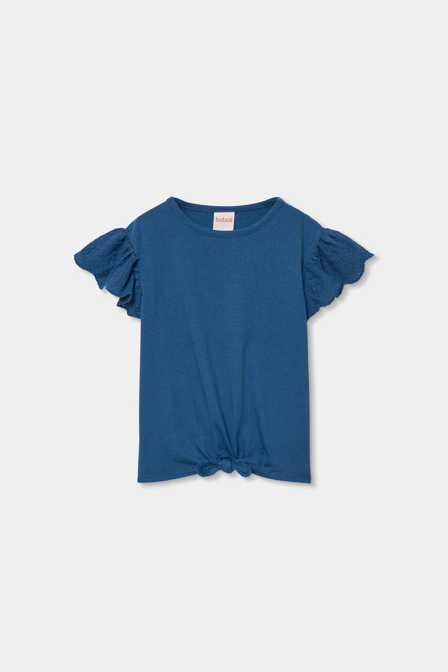 T-shirt azul para menina confeccionada em tecido suave e confortável, ideal para o dia a dia. Apresenta mangas curtas com detalhe de folhos e acabamento em bordado inglês, que acrescenta um toque delicado e feminino. O seu design simples facilita a combinação com peças estampadas ou lisas para looks de verão cheios de cor.