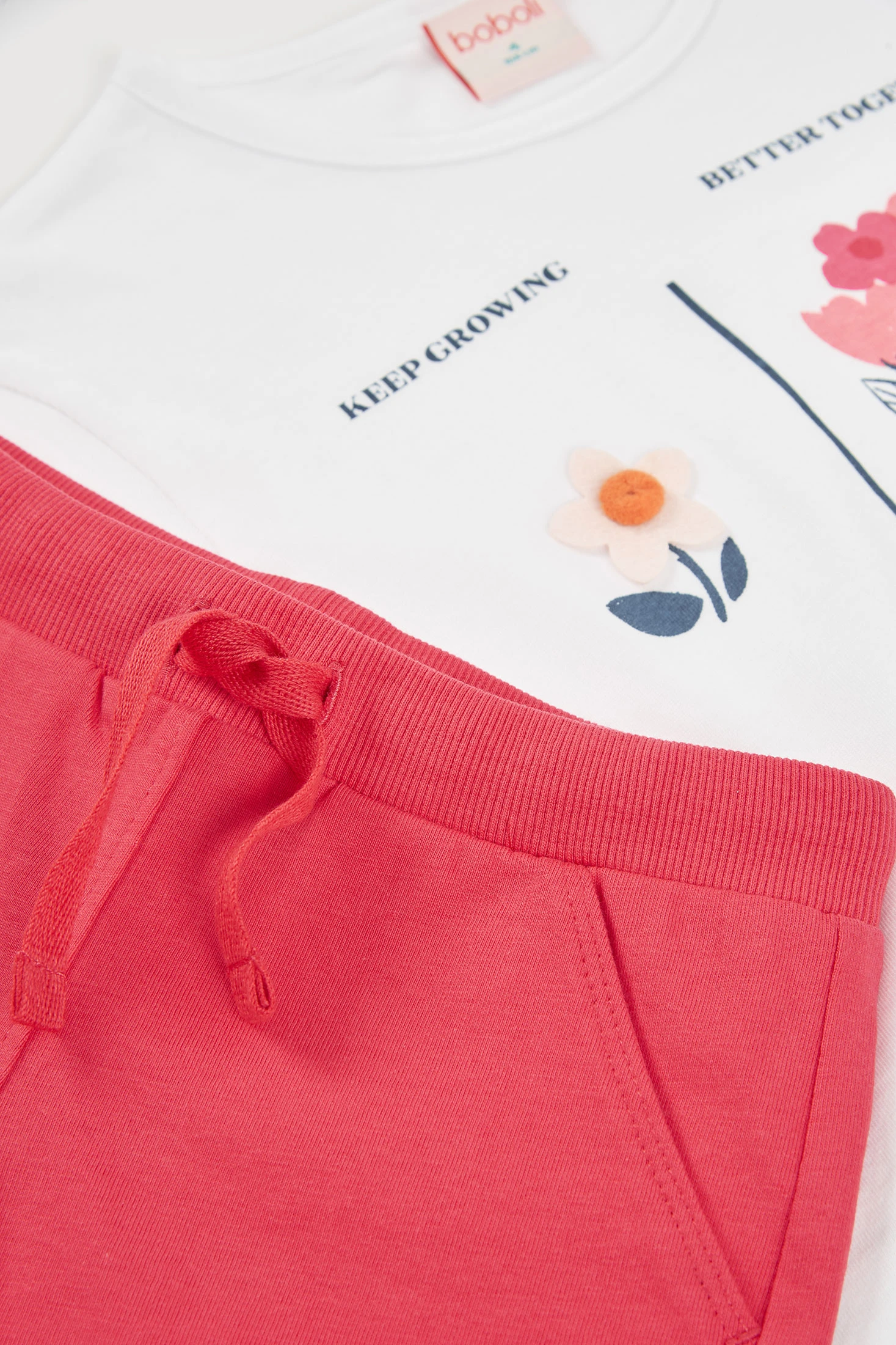 Conjunto de malha de algodão para menina, perfeito para o dia a dia. Apresenta uma t-shirt branca com uma fresca estampa floral em tons rosados e laranjas, acompanhada da frase "Keep Growing Better Together". Os calções são de uma vibrante cor rosa, conferindo um toque alegre. O material de malha assegura conforto e suavidade, ideal para climas quentes. Disponível em tamanhos desde 12 meses até 14 anos, este conjunto combina estilo e conforto, sendo uma opção prática e versátil para qualquer ocasião casual.