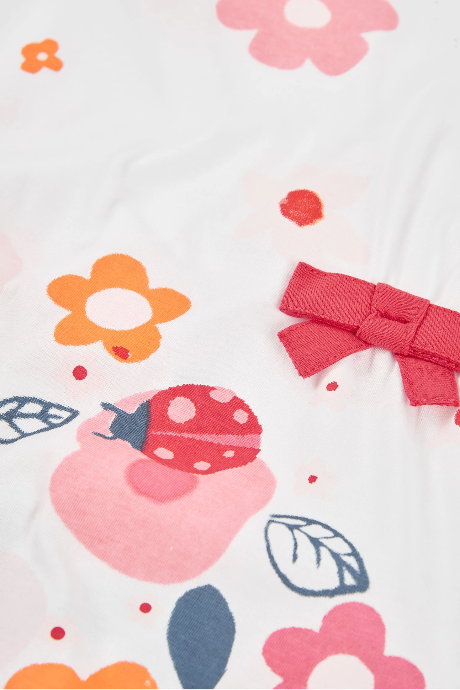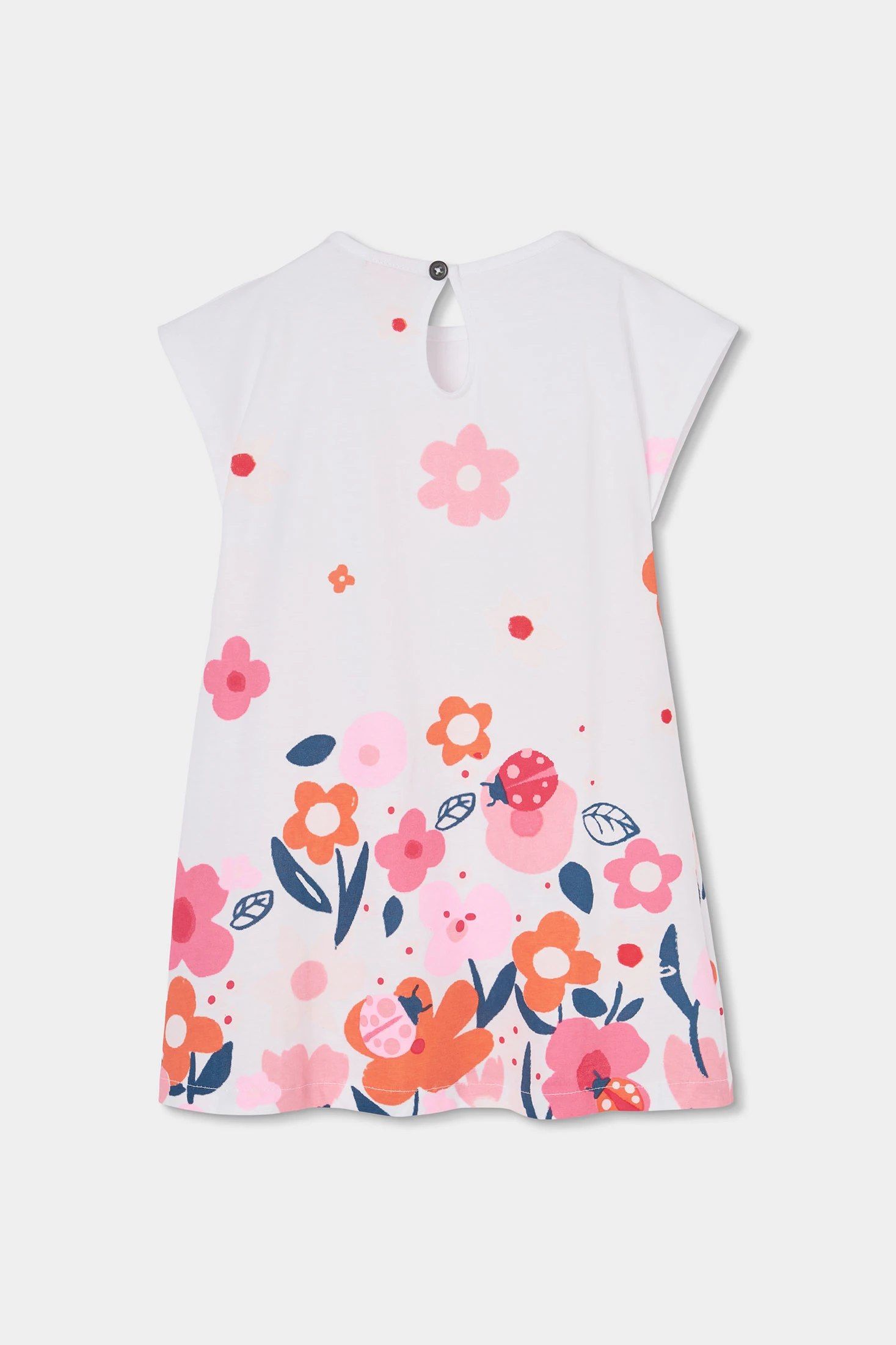 Vestido de malha branca ideal para as mais pequenas, com tamanhos disponíveis desde os 12 meses até aos 14 anos. O seu design apresenta um estampado colorido de flores em tons rosa, laranja e azul, juntamente com adoráveis joaninhas. O material de malha é suave e confortável, perfeito para uso diário. O detalhe de um laço na cintura acrescenta um toque de encanto. Com decote redondo e mangas curtas, é uma opção versátil e alegre para qualquer ocasião.