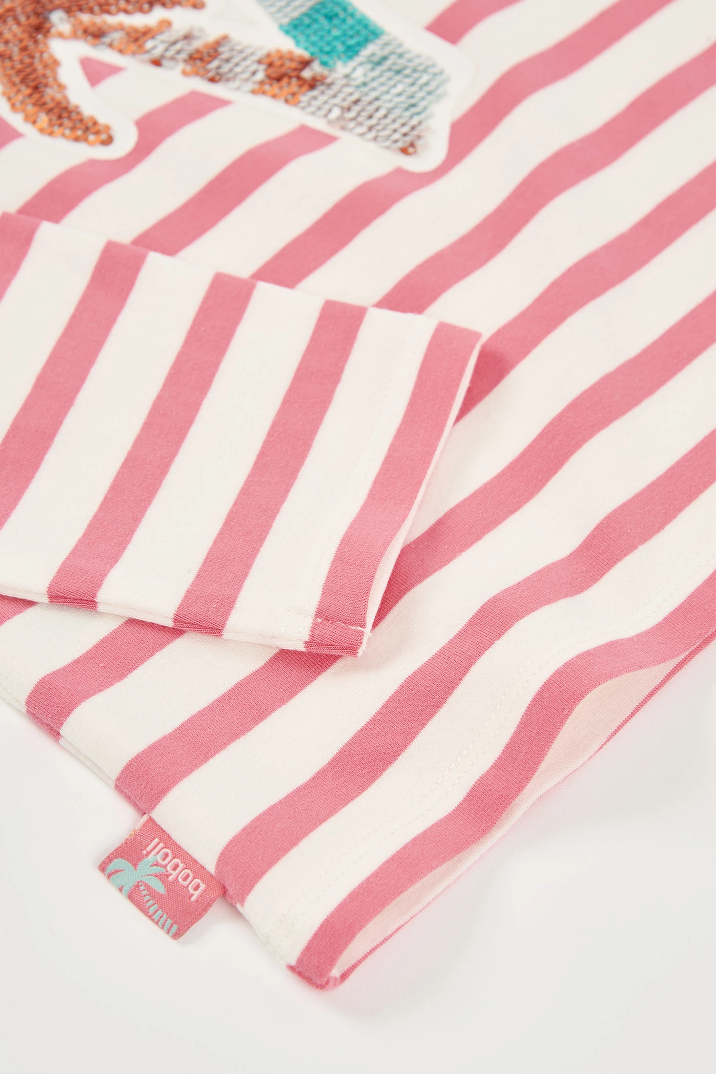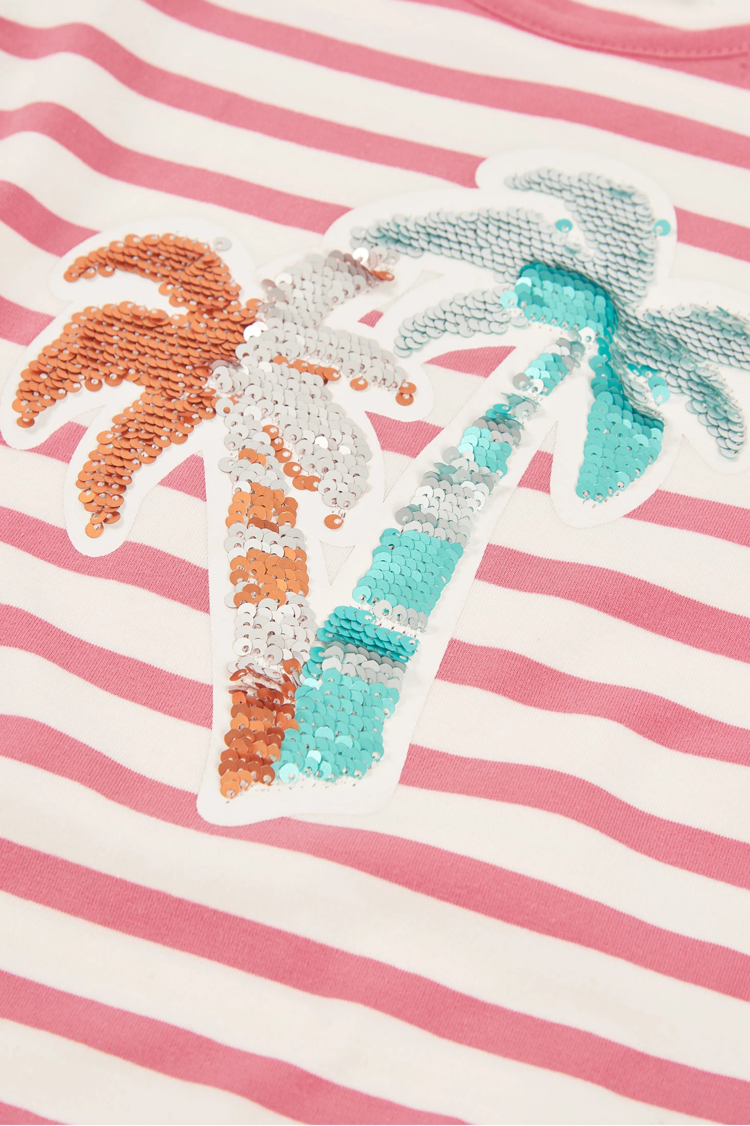 T-shirt de malha elástica de algodão para menina, perfeita para qualquer ocasião. Com um design de riscas em branco e rosa e um divertido bordado com lantejoulas reversíveis de palmeiras no centro. As mangas compridas e a gola redonda proporcionam conforto durante os dias frescos. Disponível em tamanhos desde 12 meses até 10 anos, esta peça combina facilmente com calças ou saias para um look casual e confortável. Ideal para adicionar um toque de cor e diversão ao guarda-roupa das mais pequenas.