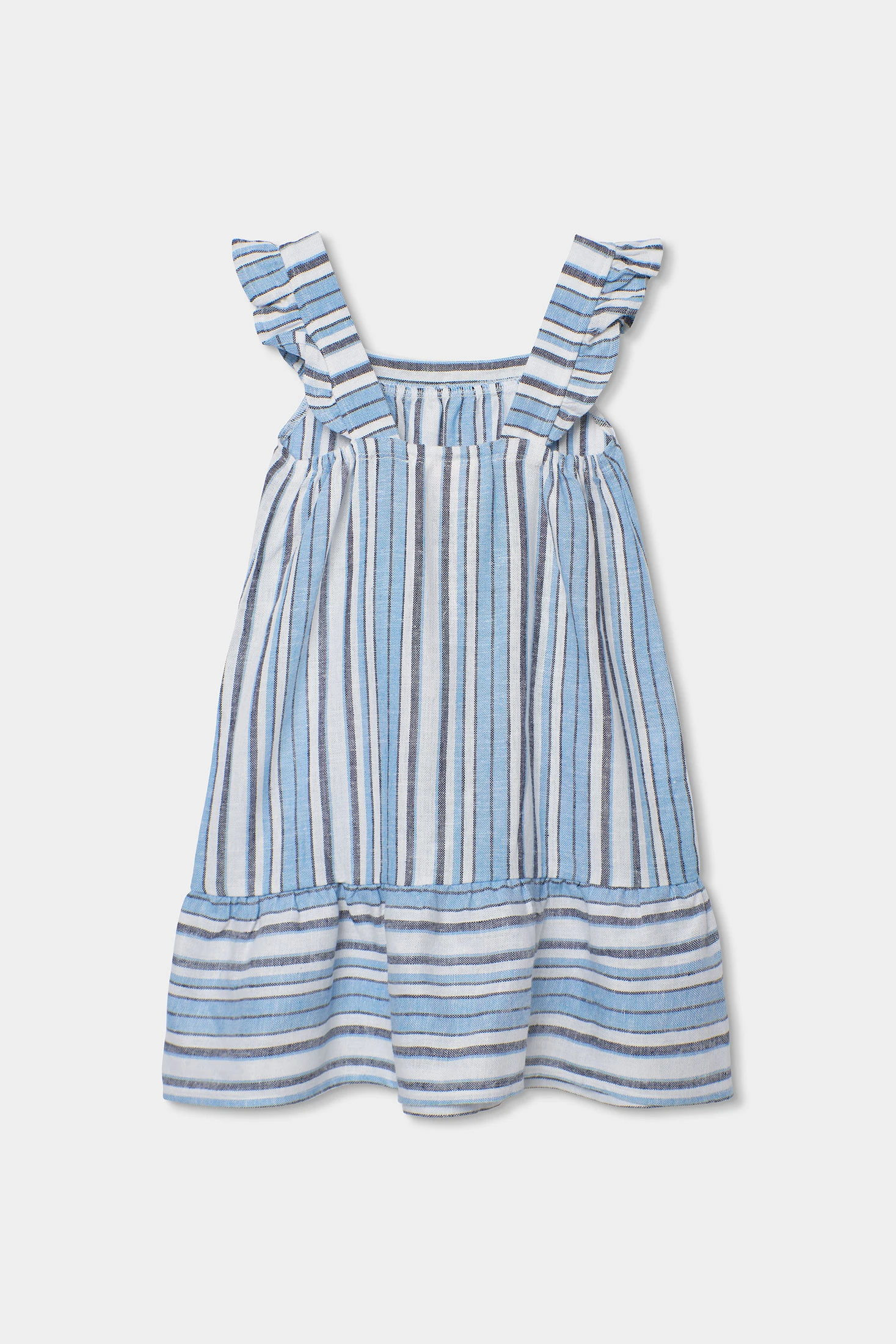 Vestido de linho listado ideal para meninas, disponível desde 12 meses até 14 anos. O seu design com riscas em tons azuis e brancos oferece um estilo fresco e de verão. Com alças largas e detalhes de folhos, é perfeito para os dias quentes. A leveza do linho proporciona conforto e respirabilidade. O seu corte ligeiramente evasé oferece liberdade de movimento, sendo uma opção versátil para combinar com acessórios simples para um look casual e com estilo durante a temporada de verão.
