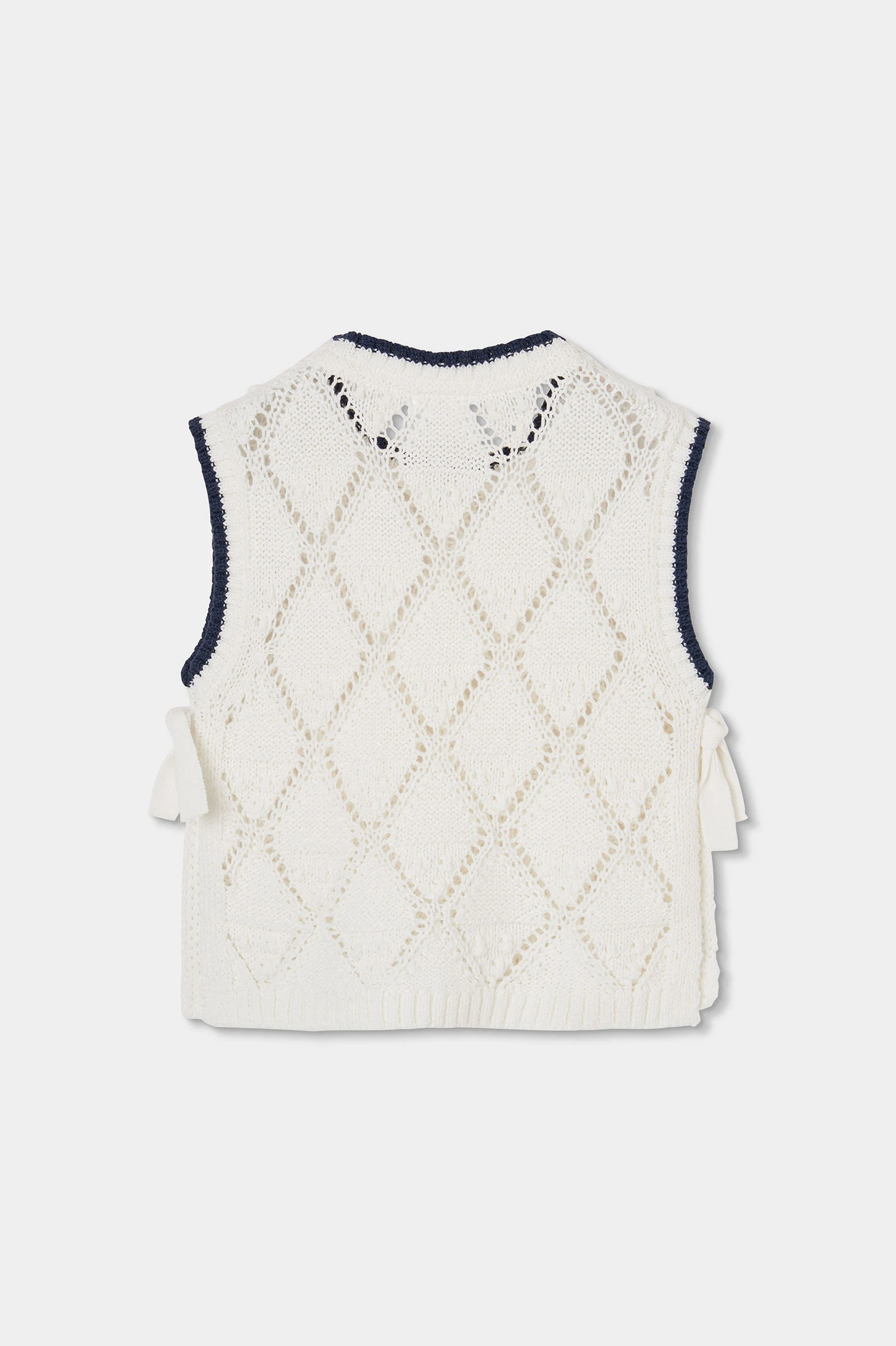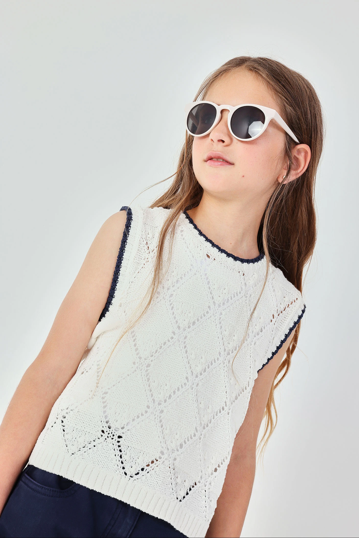 Colete de menina em cor branca, elaborado em algodão, oferece uma textura suave e confortável. O seu design apresenta um padrão tecido tipo rendado que adiciona um estilo clássico e elegante. As terminações em cor contrastante destacam a sua estrutura. Ideal para usar por camadas durante a estação de meia-estação, sua versatilidade permite combiná-lo facilmente com camisas ou blusas. Está disponível em tamanhos desde 12 meses até 14 anos, adaptando-se ao crescimento da menina. Perfeito para adicionar um toque de sofisticação a qualquer conjunto casual ou formal.