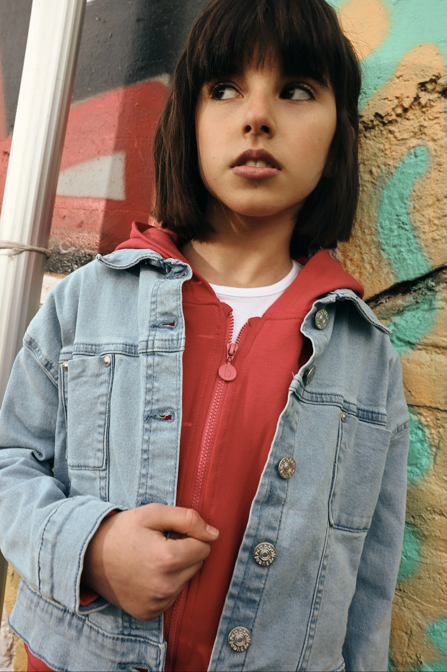 Jaqueta de ganga para menina, na cor azul claro, perfeita para um look casual e moderno. Feita de algodão, oferece conforto e resistência. Apresenta um design clássico com botões na parte frontal e bolsos funcionais. Os tamanhos disponíveis vão dos 12 meses aos 14 anos, adaptando-se a diferentes idades. O seu estilo versátil permite combiná-la facilmente com vestidos ou calças, ideal para a meia-estação.