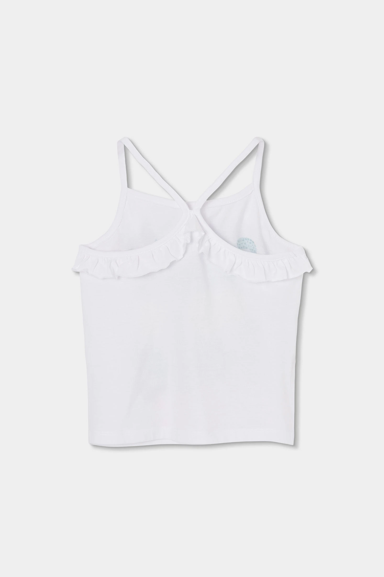 Camisola de alças para menina confecionada em malha branca, ideal para os meses mais quentes. Apresenta uma estampagem chamativa e colorida com texto e flores, proporcionando um estilo fresco e alegre. Desenhada para meninas dos 2 aos 14 anos, garante um ajuste perfeito em cada fase. Alças finas e material leve garantem conforto durante todo o dia. Perfeita para combinar com calções ou saias, adicionando um toque de verão a qualquer conjunto.