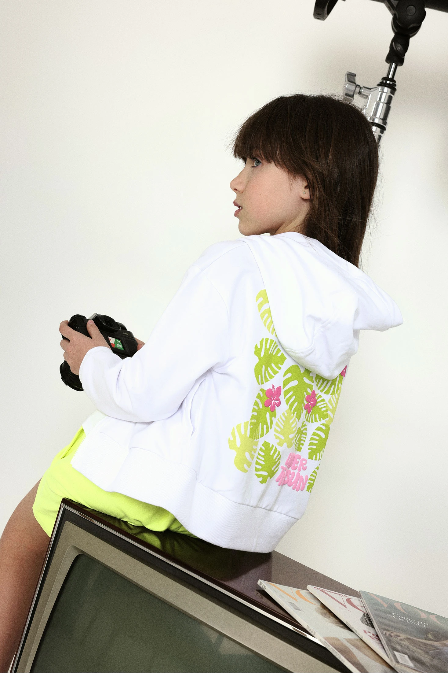 Casaco de felpo em branco para menina. Perfeito para os primeiros dias de primavera ou as noites de verão quando ainda está fresco. Confeccionado com um tecido suave, garante conforto e liberdade de movimento. Apresenta um design com folhas verdes enormes nas costas e uma pequena assinatura no peito. Disponível em tamanhos desde 2 anos até 14 anos, adaptando-se ao crescimento de cada menina.