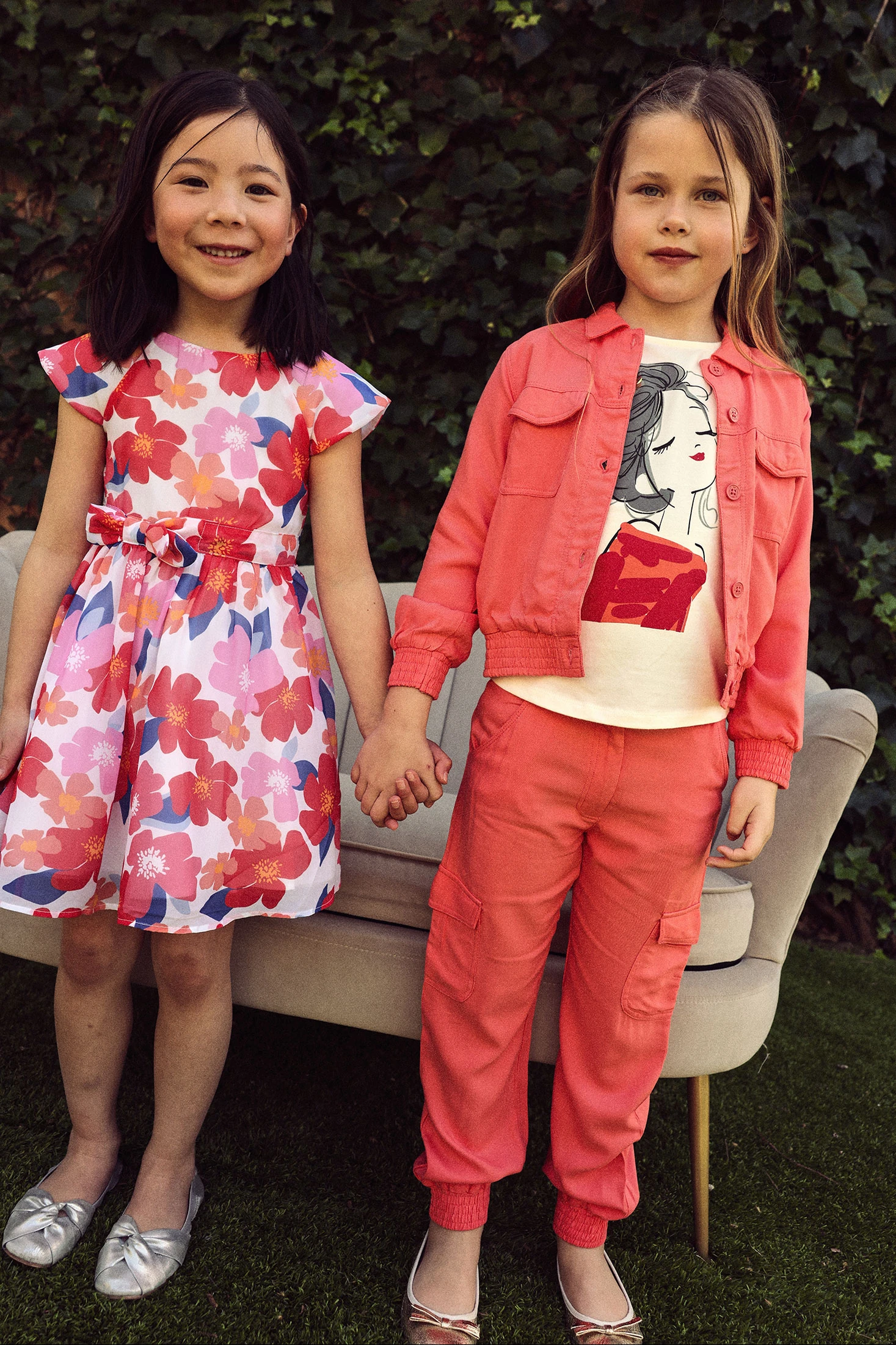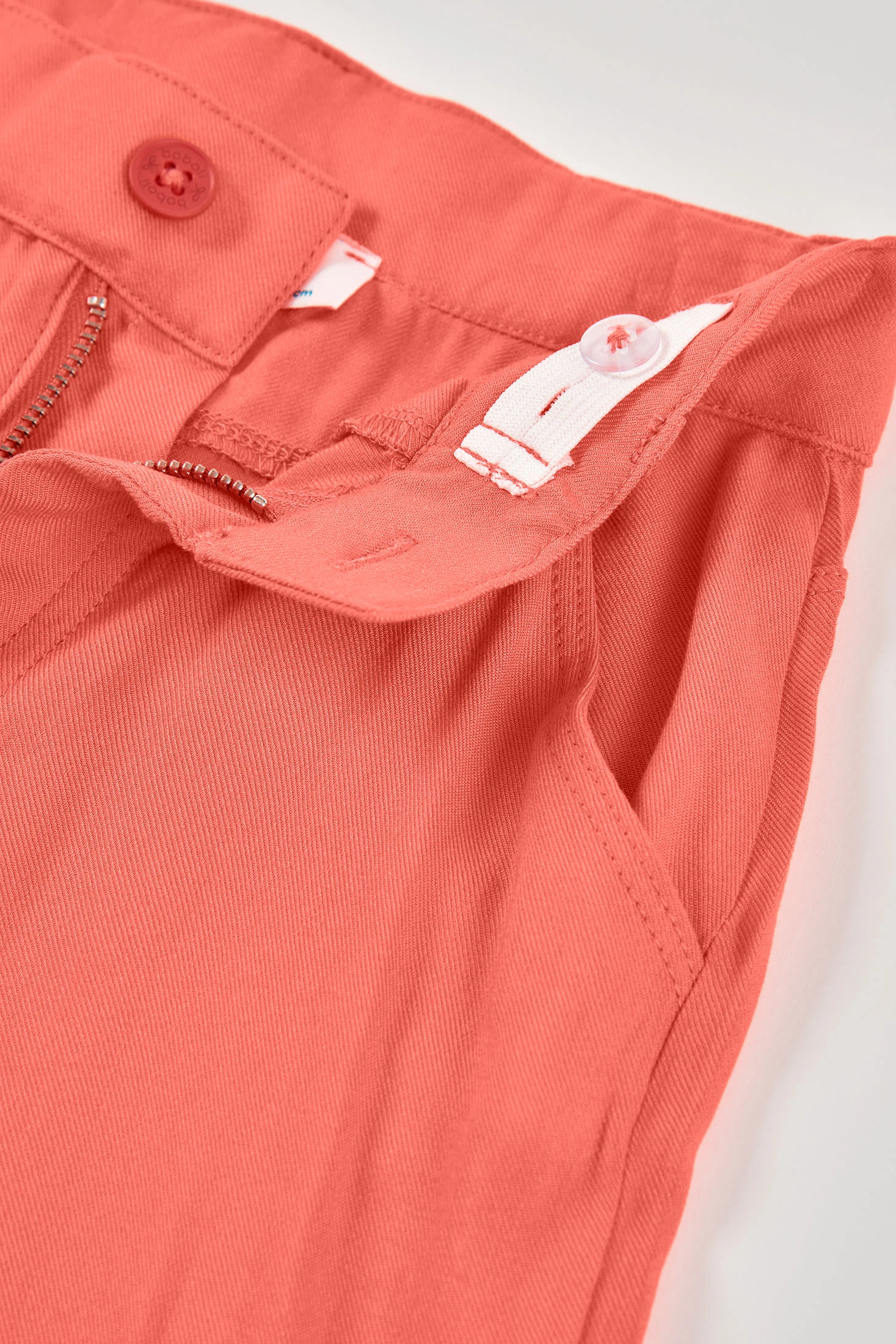 Calças de viscose em cor de morango para menina. As calças têm um padrão estilo cargo com bolsos laterais e punho na parte inferior. Confeccionadas com materiais suaves, oferecem conforto durante todo o dia. Os tamanhos disponíveis vão dos 2 anos aos 14 anos, garantindo um ajuste adequado para diferentes fases de crescimento. Uma opção versátil e atraente para qualquer estilo casual.