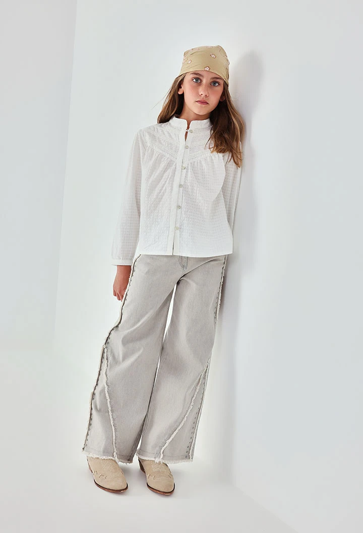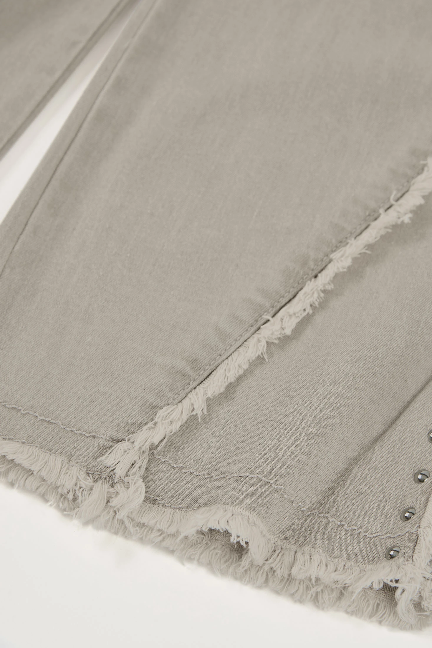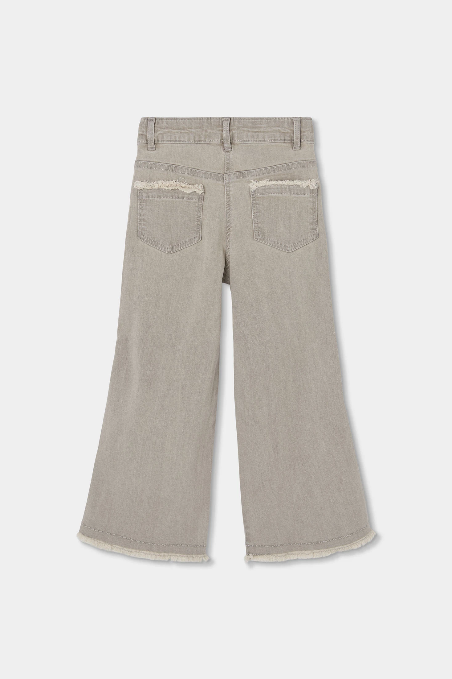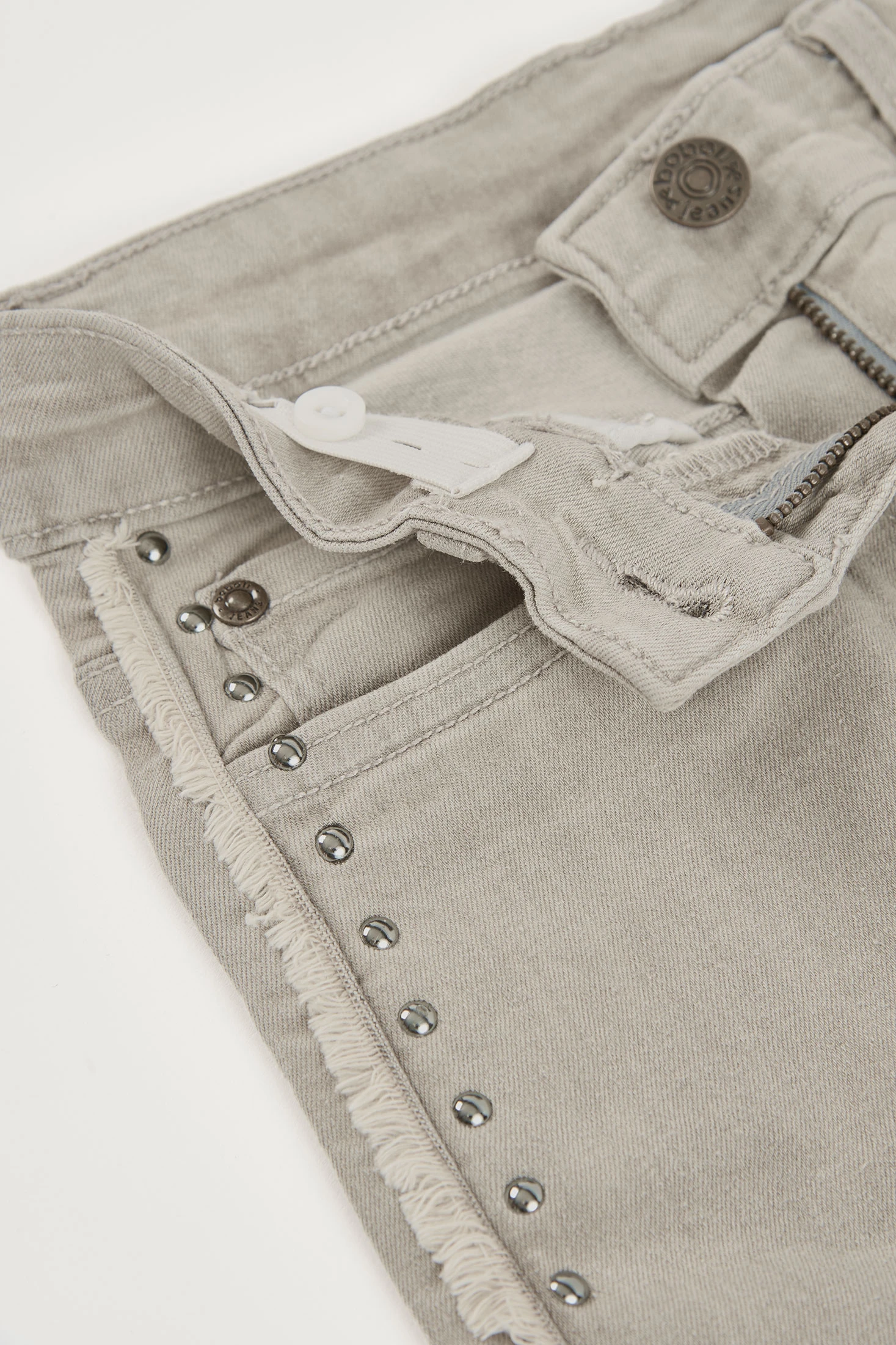 Calças de ganga cinzentas para menina, ideais para um look moderno e versátil. Confecionadas em material de alta qualidade, oferecem durabilidade e conforto. O design destaca-se com detalhes de tachas metálicas decorativas e um acabamento desfiado nas bordas, perfeito para um estilo casual chique. Disponíveis em tamanhos desde 2 até 14 anos, adaptam-se a diferentes idades. A sua cor neutra facilita as combinações com camisetas e camisolas de vários estilos. É uma opção prática e estilizada para o uso diário.