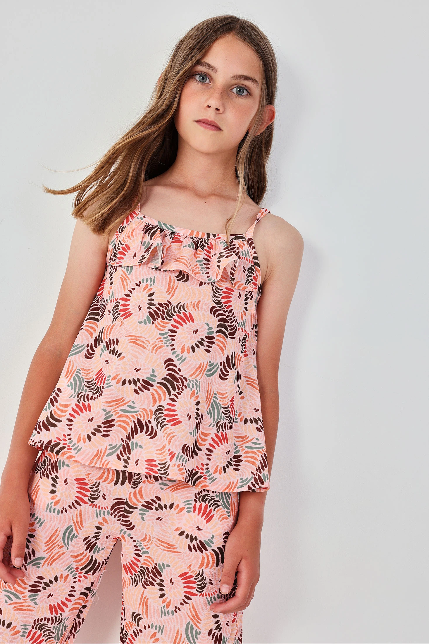 Top de tecido crepe para menina ideal para a temporada quente. Numa delicada cor salmão com estampado abstrato, combina conforto e estilo. O material garante frescura e leveza. Inclui alças finas e um folho no decote da peça. Disponível em tamanhos desde 2 anos até 12 anos, adapta-se perfeitamente a diferentes idades. Perfeito para combinar com calças ou saias.