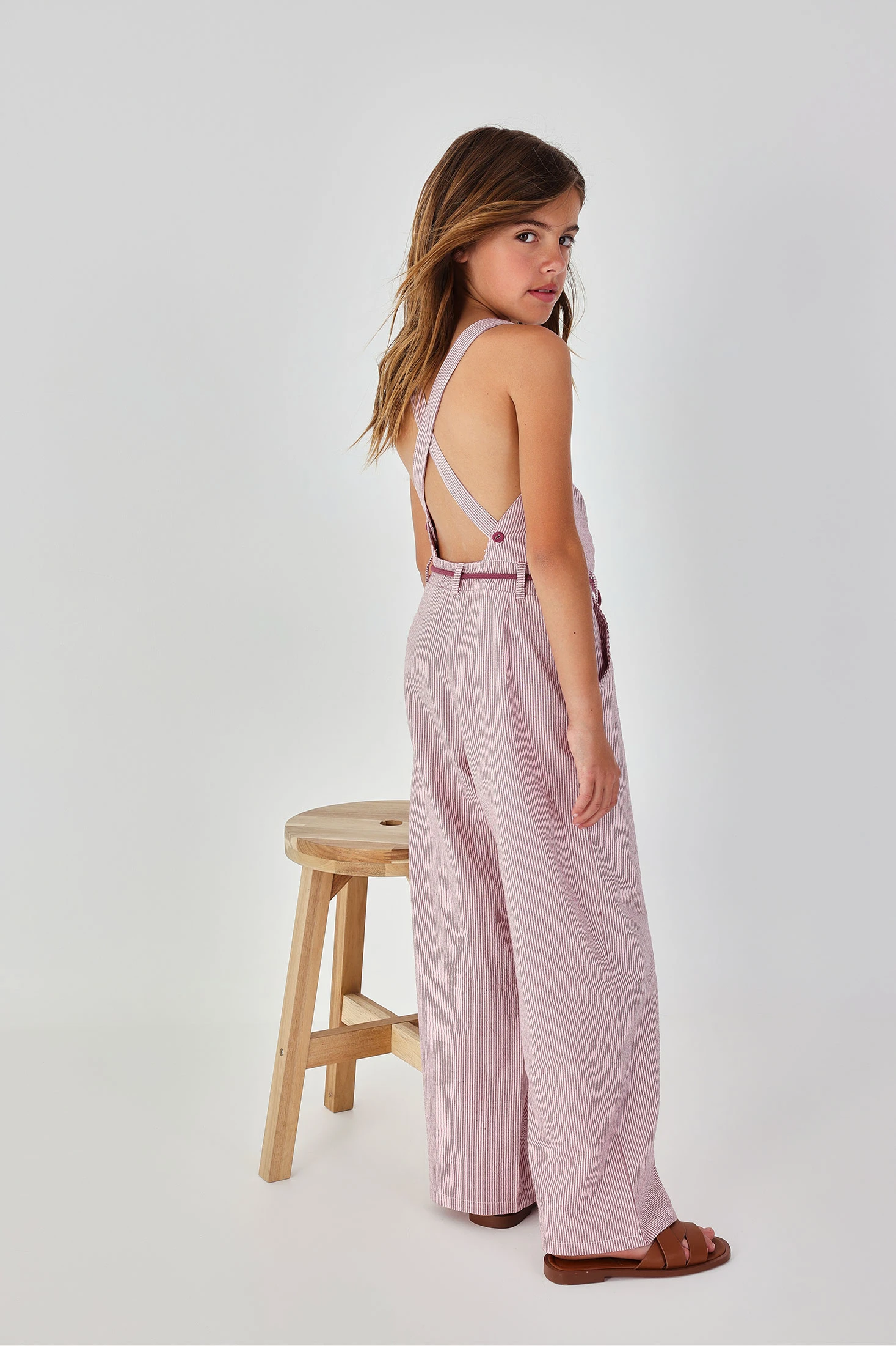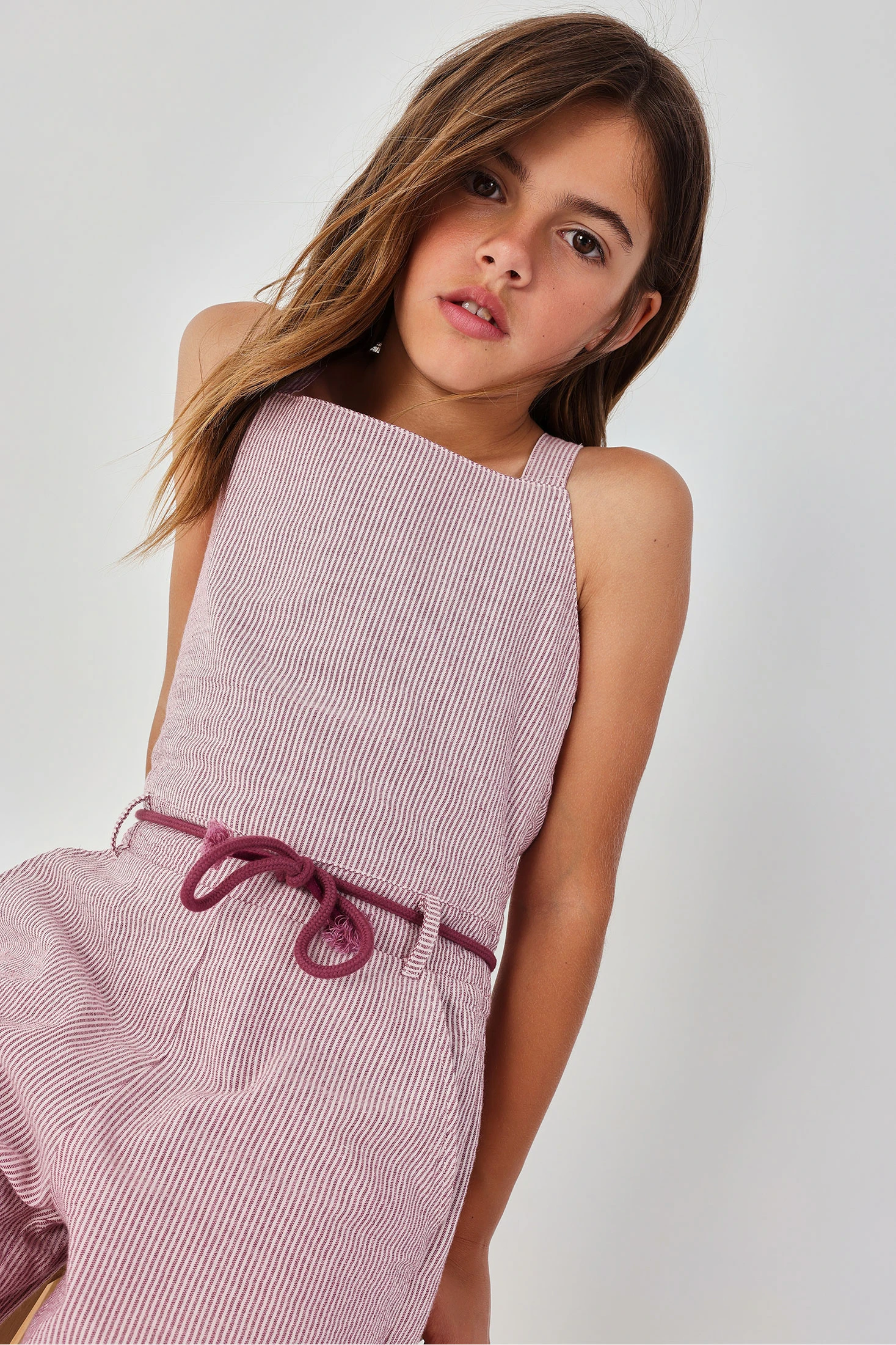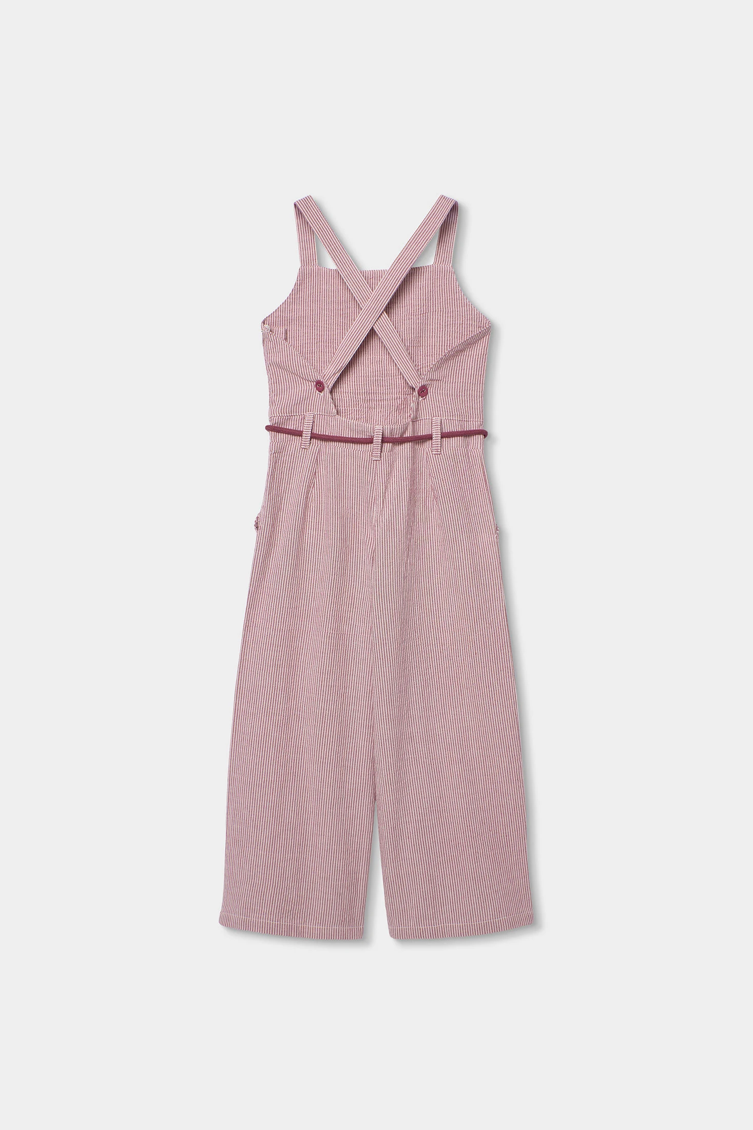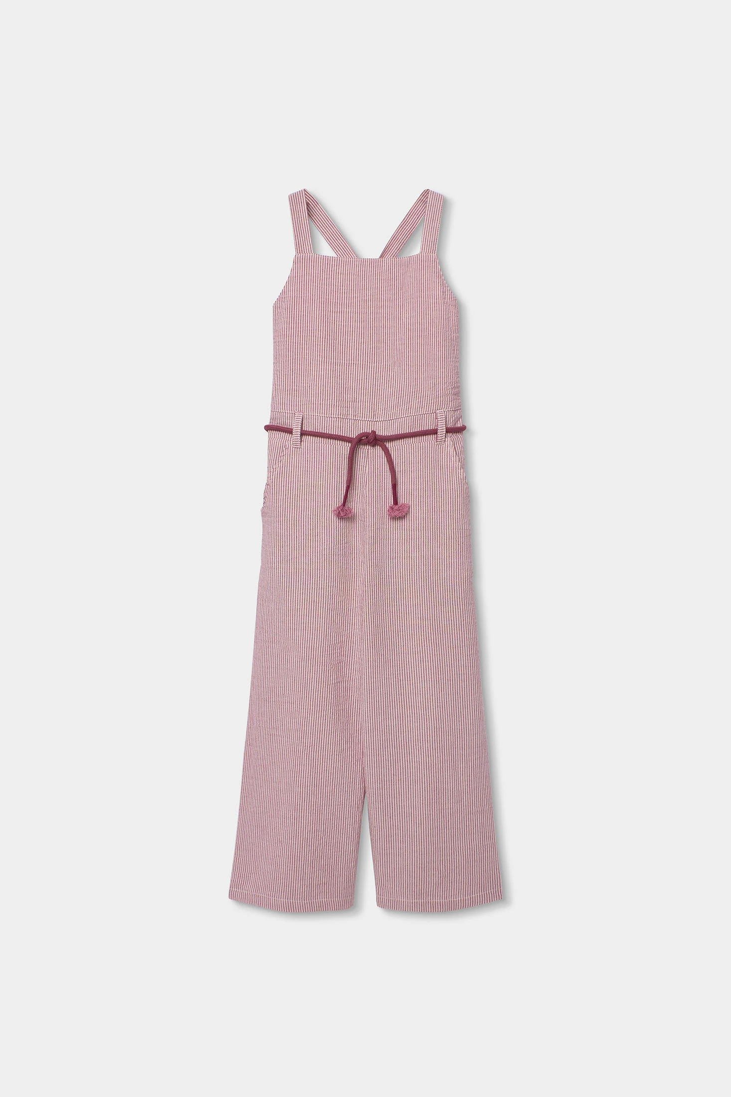Macacão de popelina listado em seersucker, ideal para meninas e disponível em tamanhos desde 2 anos até 14 anos. O seu design apresenta um delicado padrão de riscas verticais em tons rosa e cru, oferecendo um estilo fresco e moderno. Fabricado em material leve de popelina, garante conforto e respirabilidade. As alças em forma de "V" nas costas e um cordão ajustável na cintura proporcionam funcionalidade e um ajuste perfeito. Este macacão é perfeito para dias quentes, combinando estilo e conforto de maneira excepcional.