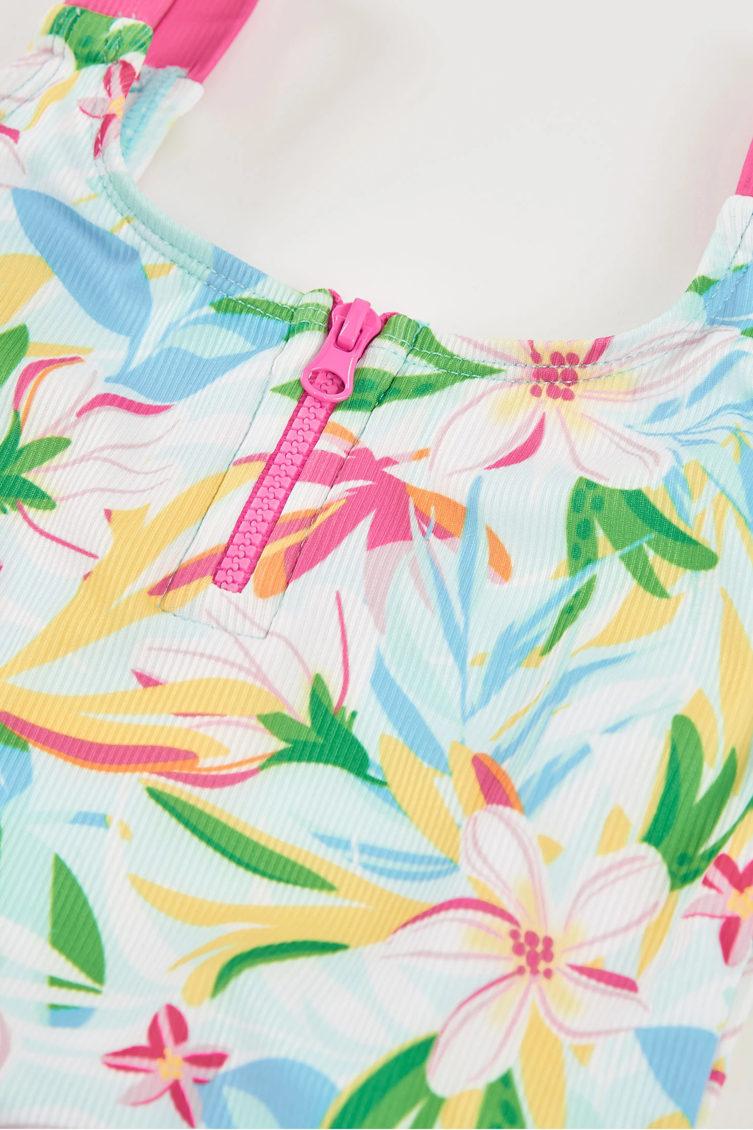 Fato de banho estampado com flores para menina que combina cor e estilo. O seu design vibrante inclui tons de rosa, azul e verde, ideal para se destacar na água. As alças largas proporcionam conforto e suporte. Fabricado com material elástico e proteção solar UPF50, ajusta-se perfeitamente ao corpo permitindo liberdade de movimento. Disponível em tamanhos desde 2 anos até 14 anos. Perfeito para os dias de praia ou piscina, o seu estampado floral acrescenta um toque fresco e de verão. Esta peça é uma escolha alegre e prática para desfrutar da água com estilo.