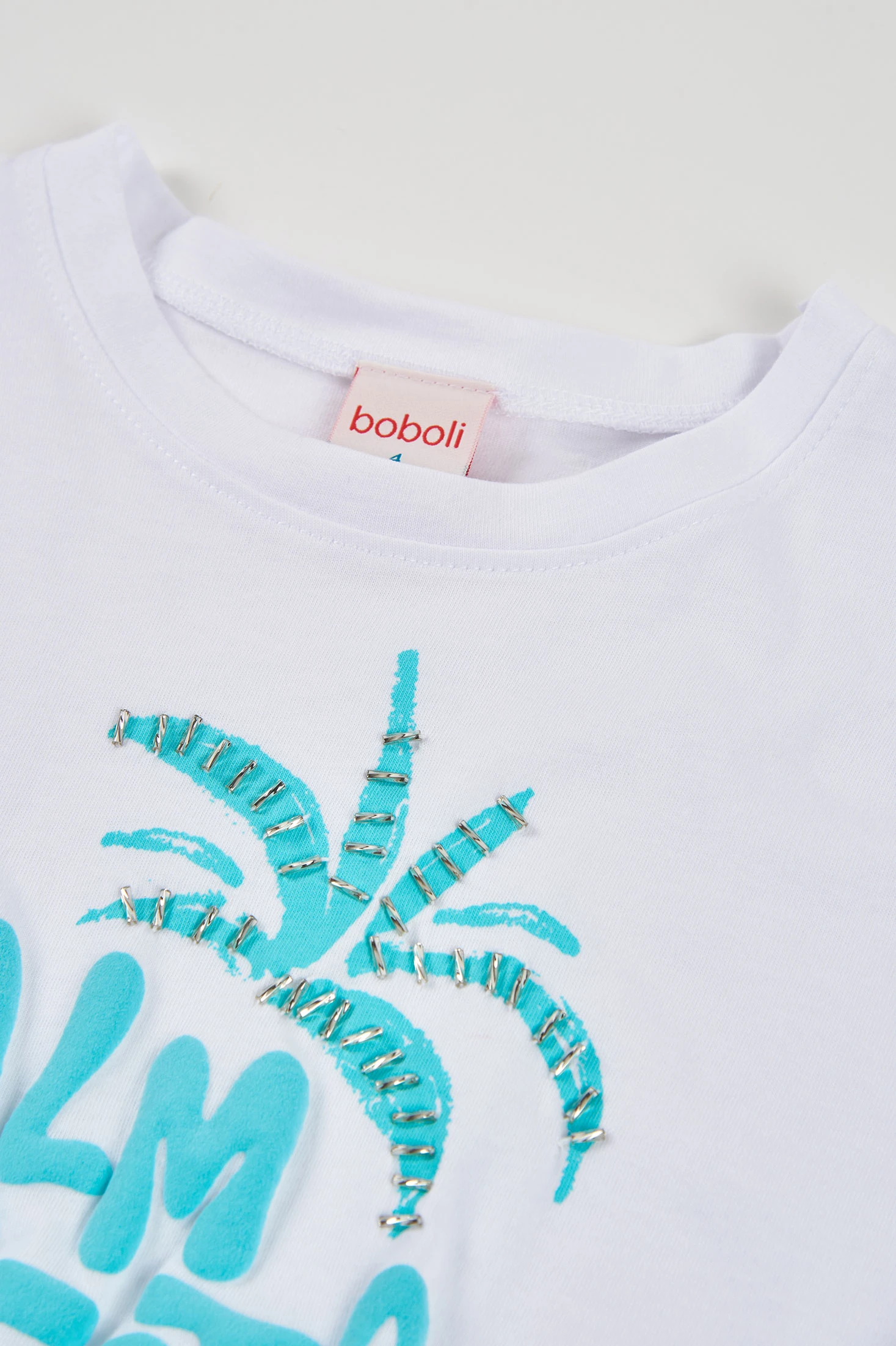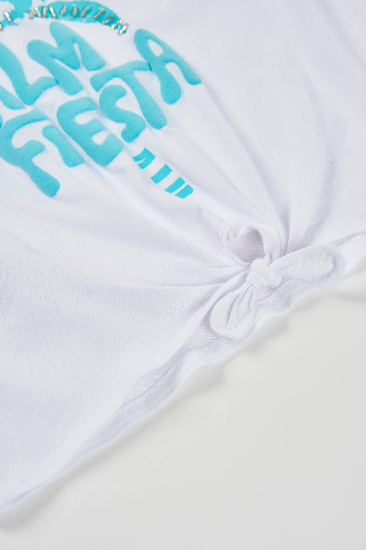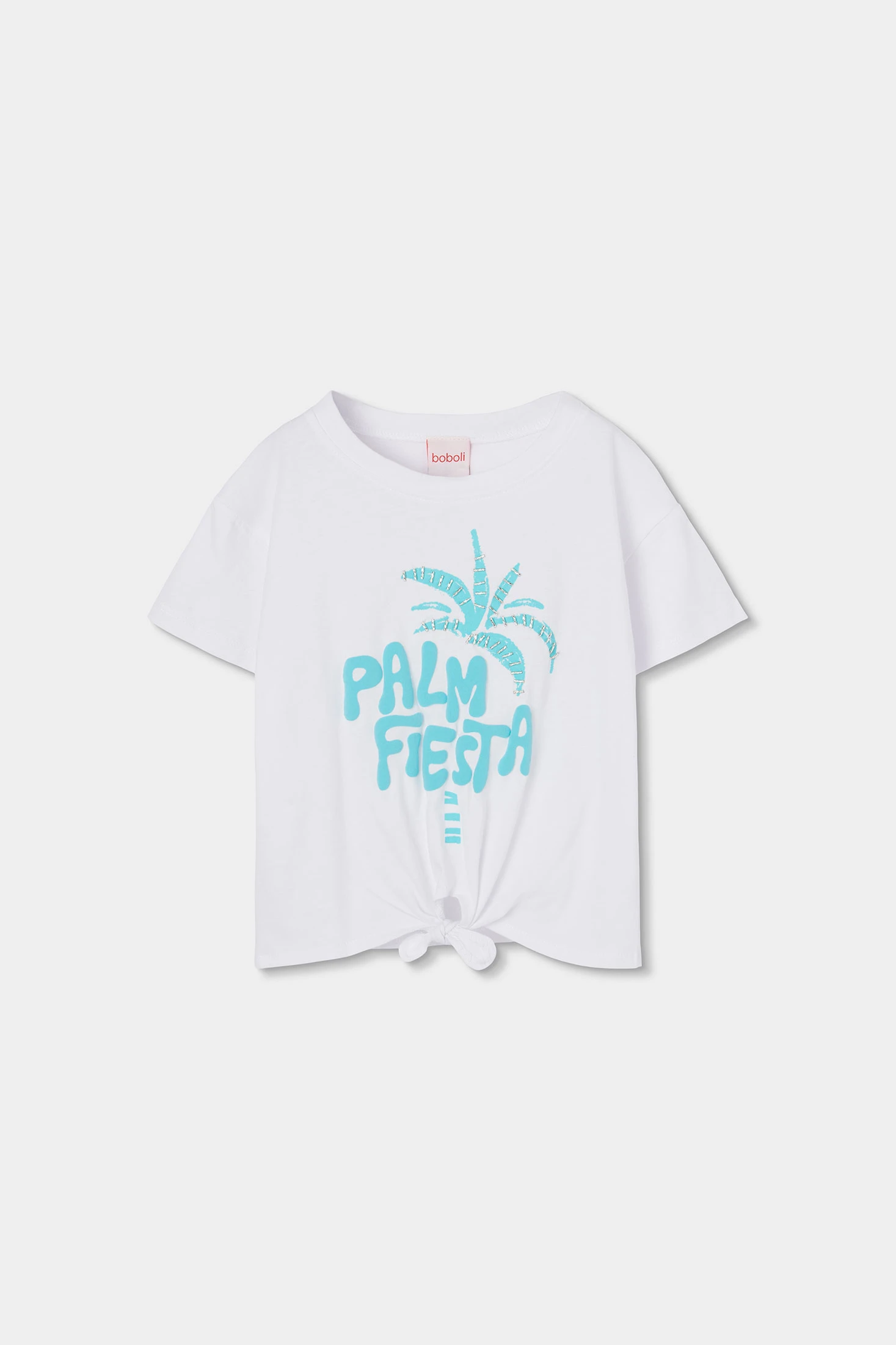 T-shirt de manga curta para menina feita de malha de algodão branca, ideal para dias quentes. O design apresenta uma ilustração de uma palmeira em azul com o texto "Palm Fiesta", oferecendo um toque de verão e divertido. Confortável e leve, é perfeita para atividades ao ar livre. Disponível em tamanhos de 2 anos a 14 anos, adapta-se a diferentes idades. Um nó na parte frontal adiciona um estilo único que combina com jeans ou calções para um look casual perfeito.