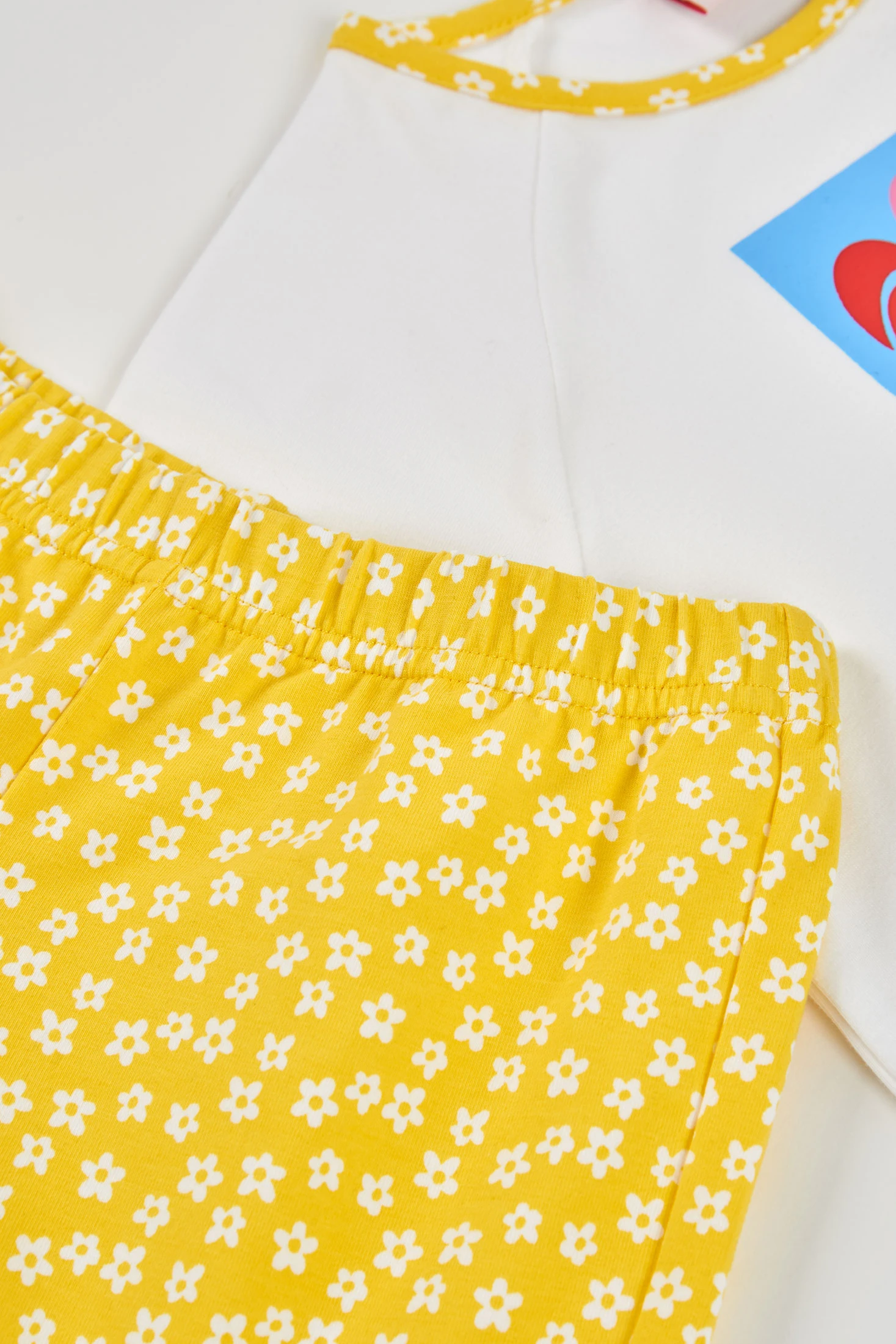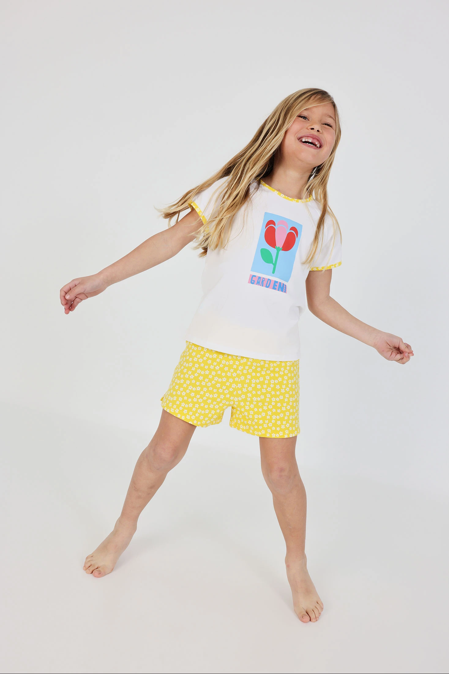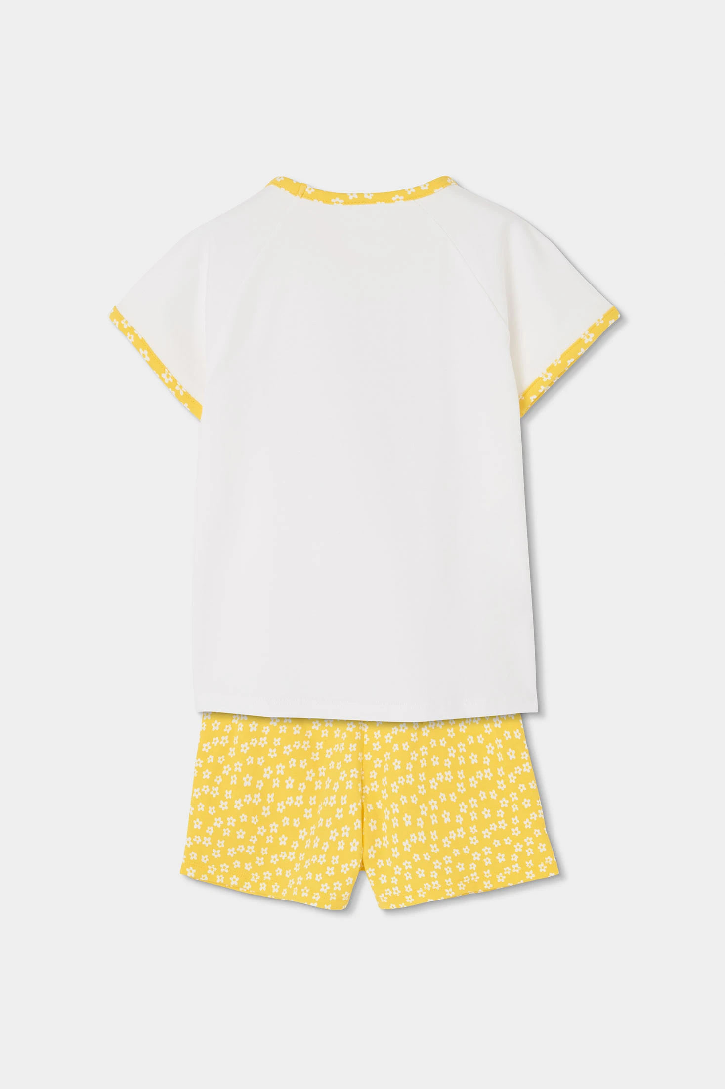 Pijama de menina ideal para a temporada quente, confeccionado em malha de algodão suave, garante conforto. O design apresenta uma camisola branca de manga curta com uma estampa colorida de flor no centro, adicionando um toque alegre. As bordas têm detalhes em amarelo com pequenas estampas florais, que se combinam com uns calções amarelos. Disponível em tamanhos para meninas dos 2 aos 14 anos, é perfeito para manter frescura e estilo na hora de dormir.