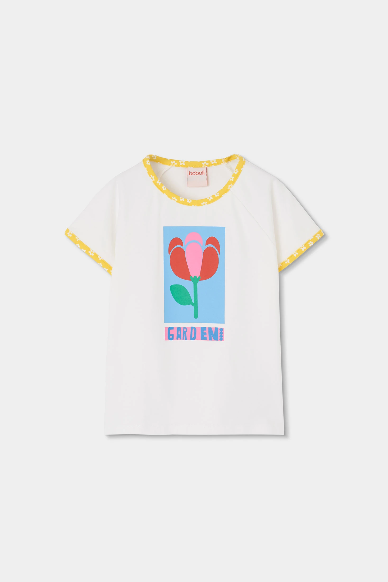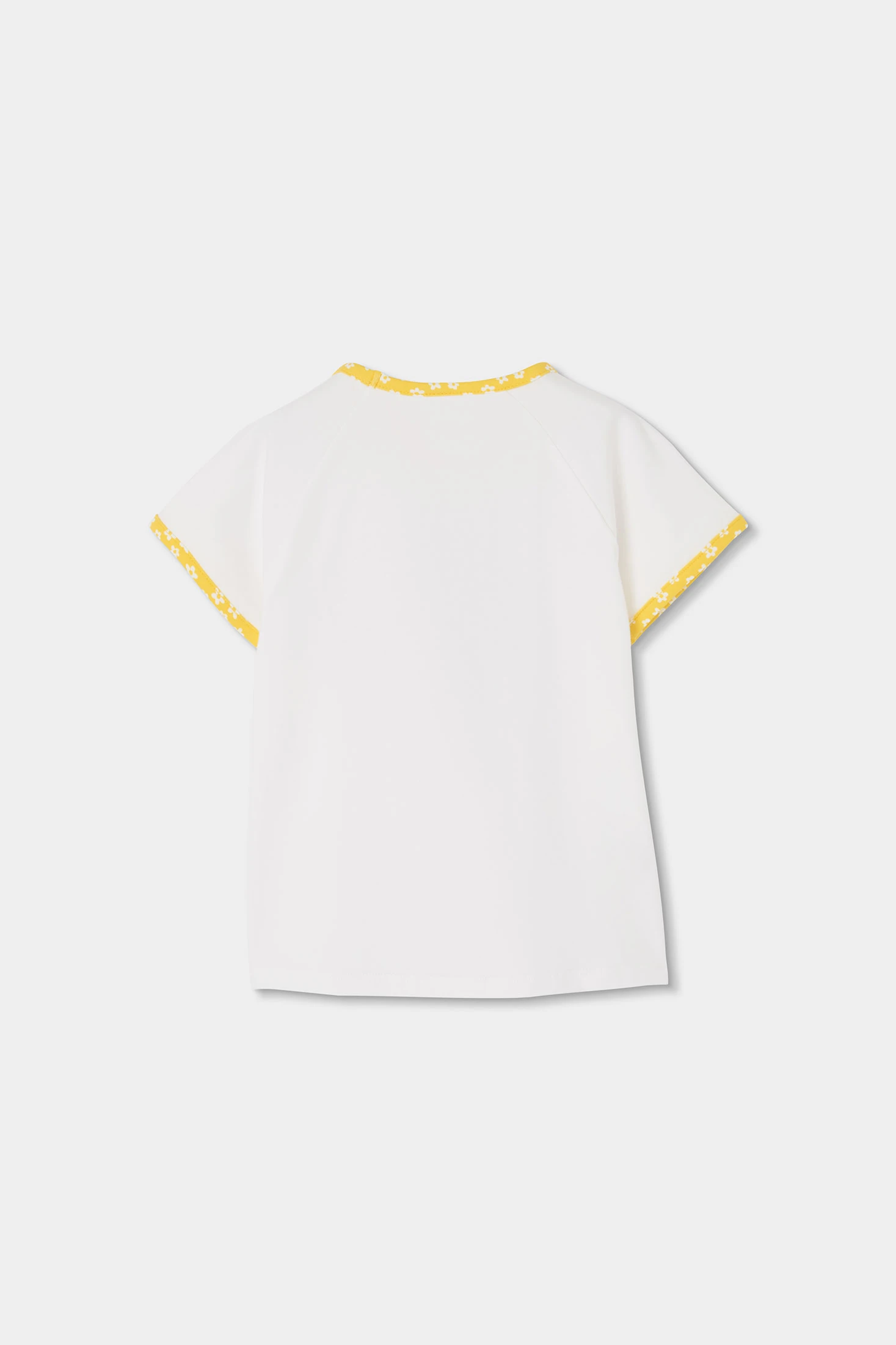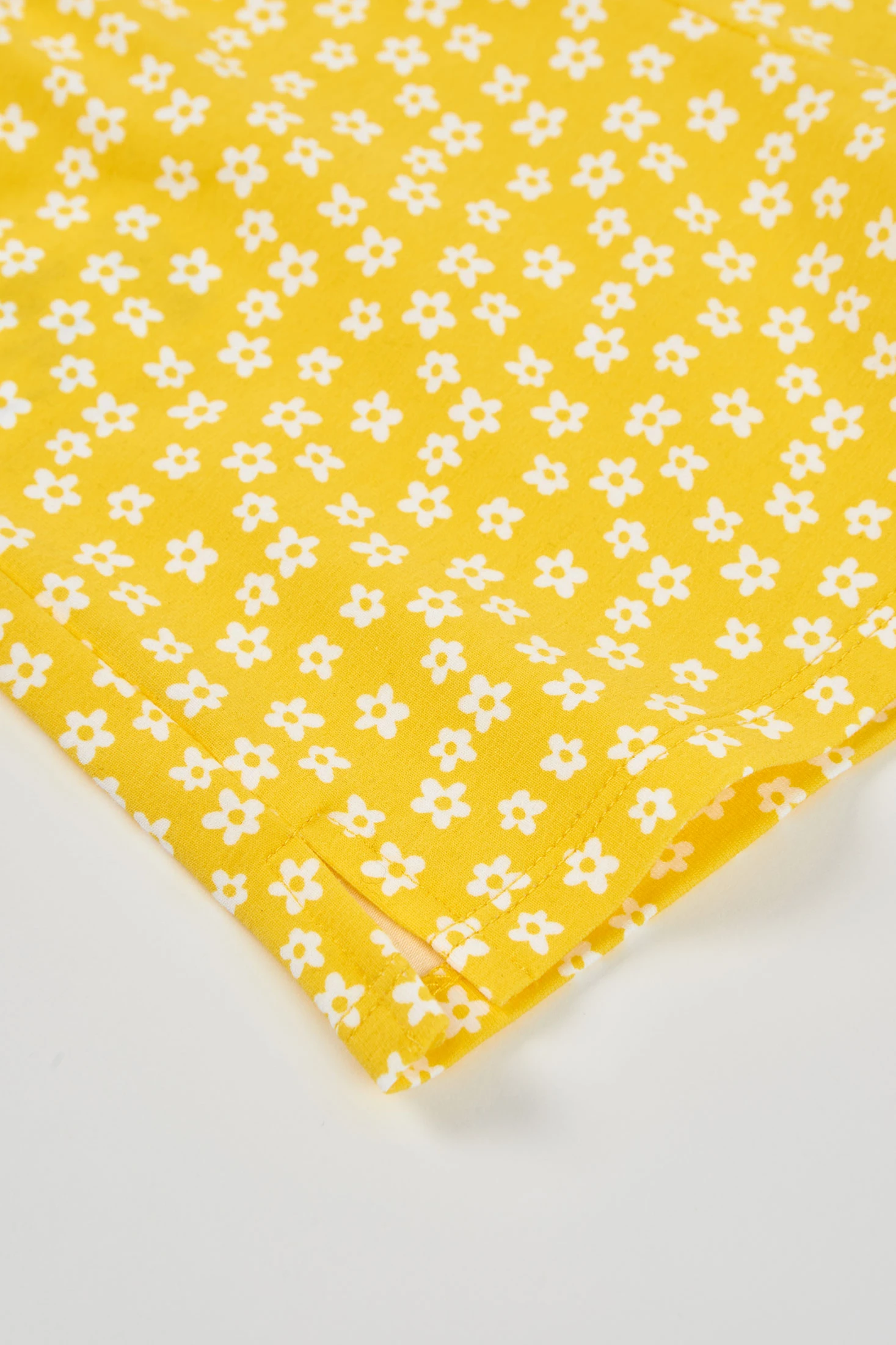Pijama de menina ideal para a temporada quente, confeccionado em malha de algodão suave, garante conforto. O design apresenta uma camisola branca de manga curta com uma estampa colorida de flor no centro, adicionando um toque alegre. As bordas têm detalhes em amarelo com pequenas estampas florais, que se combinam com uns calções amarelos. Disponível em tamanhos para meninas dos 2 aos 14 anos, é perfeito para manter frescura e estilo na hora de dormir.