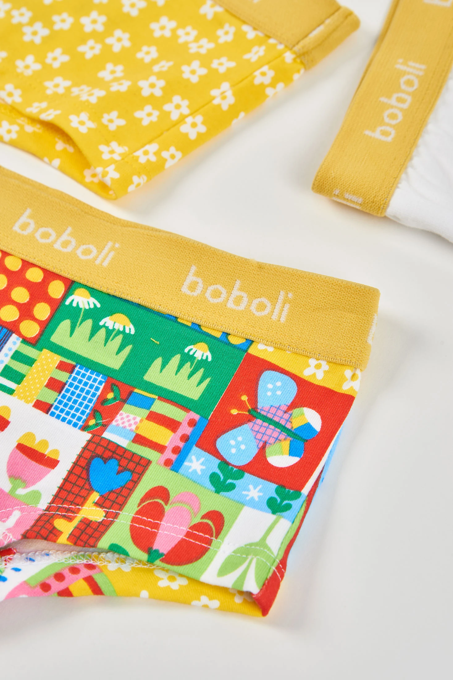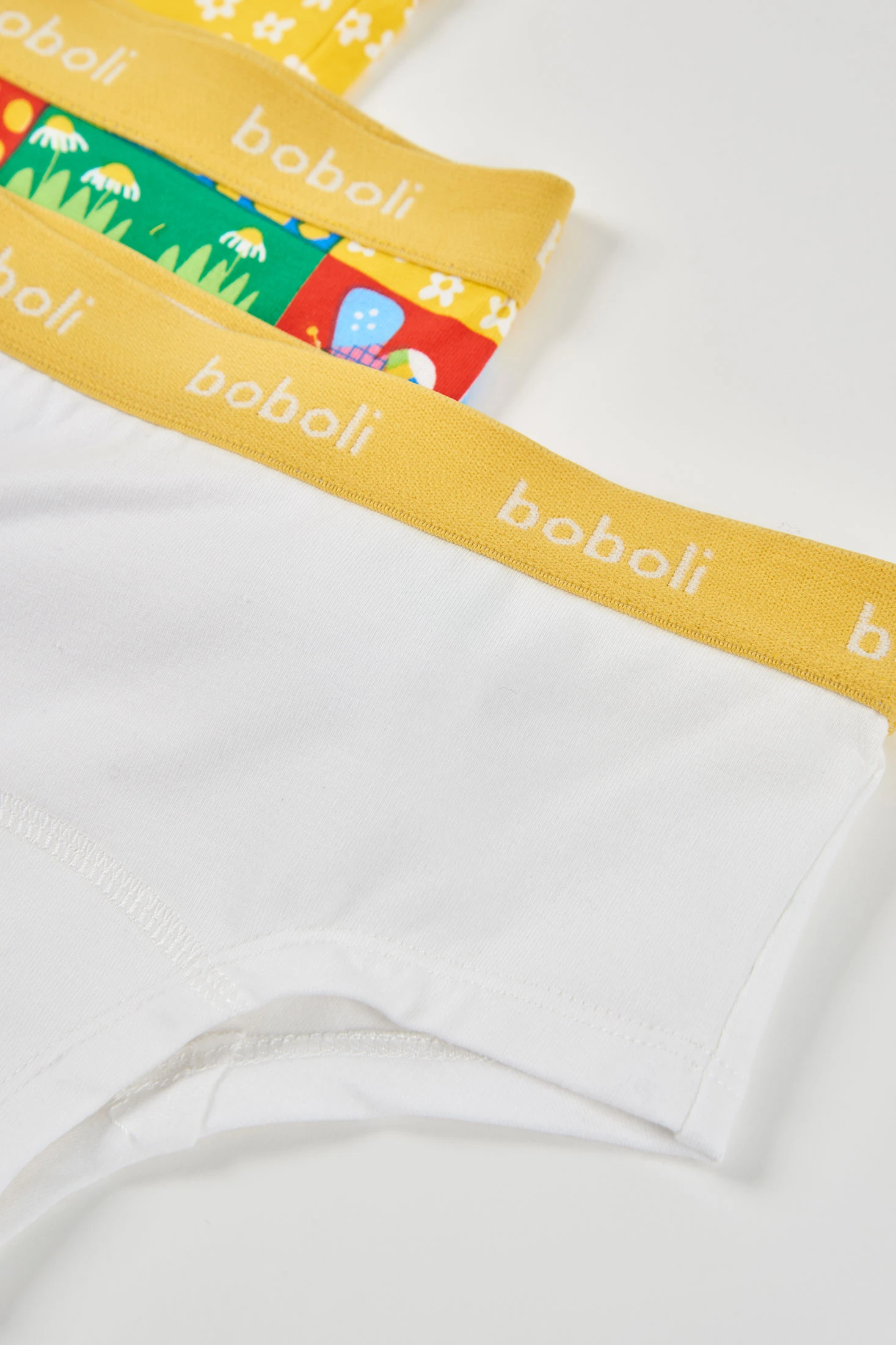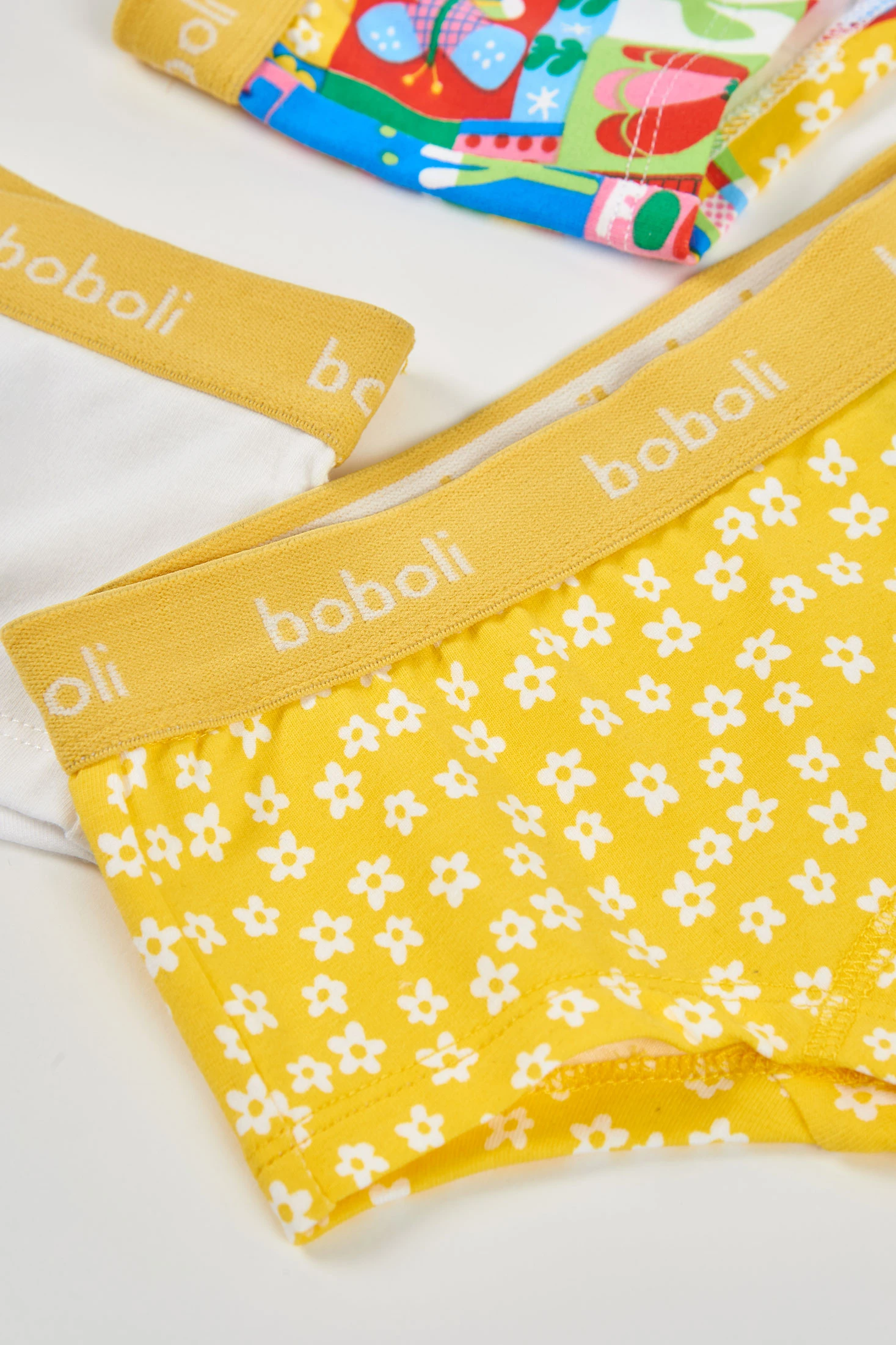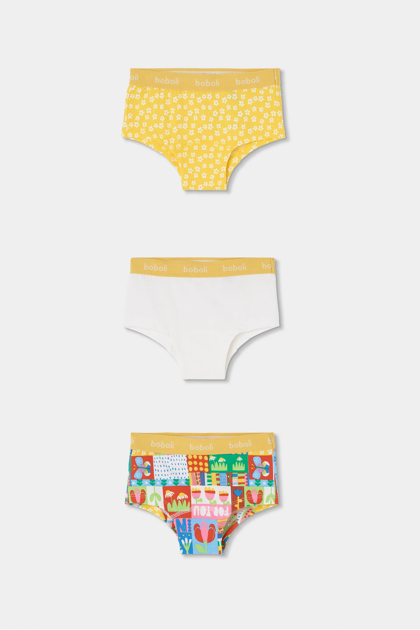 Pack de 3 cuecas para menina confeccionado em suave algodão, ideal para proporcionar conforto diário. O conjunto inclui um design amarelo com flores brancas, outro branco liso e um multicolorido com estampados geométricos e divertidos. Perfeitas para idades desde 2 até 14 anos, estas cuecas oferecem um ajuste confortável e seguro. São ideais para uso diário, acrescentando estilo e diversão ao guarda-roupa infantil.