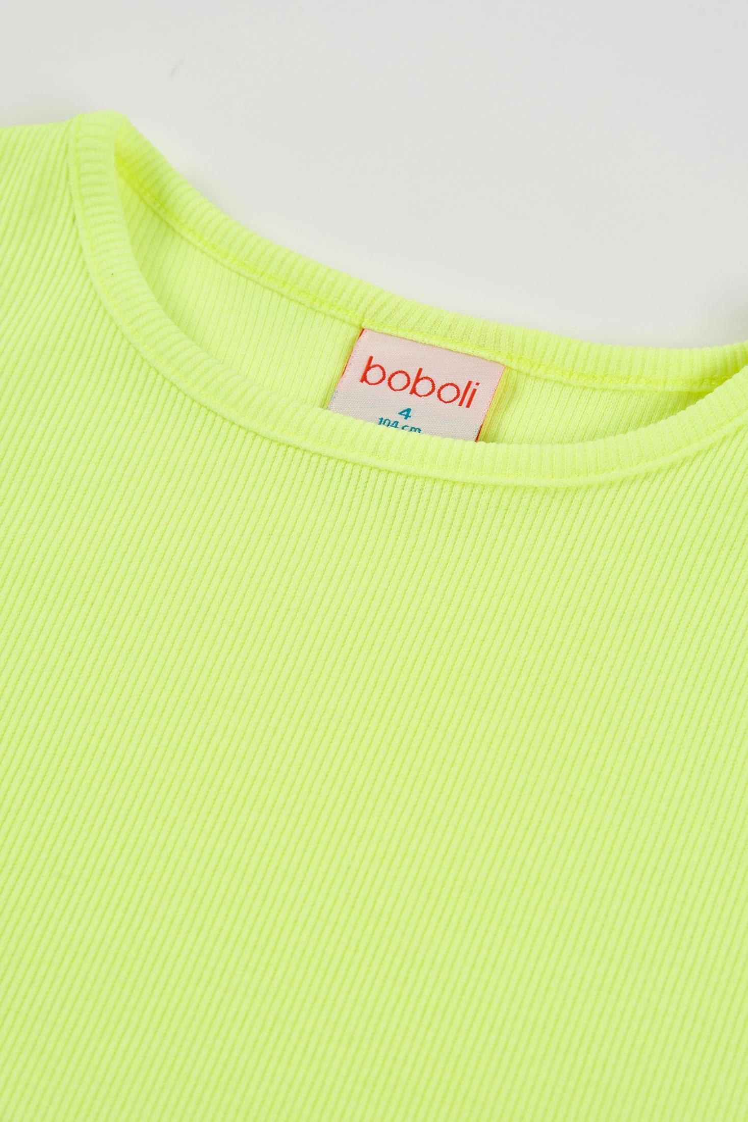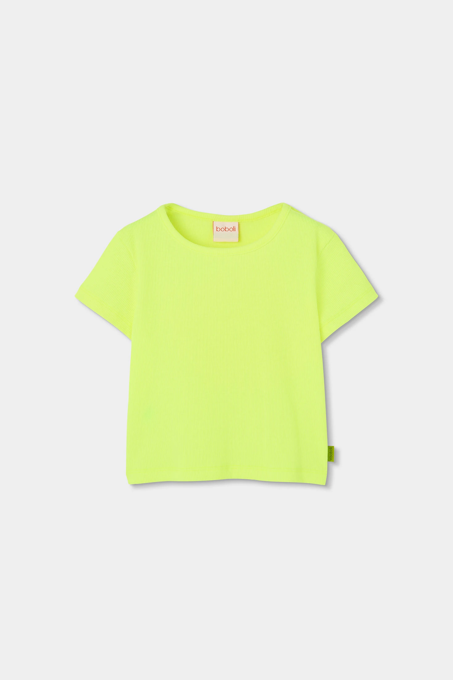 T-shirt de malha canelada para menina, ideal para a temporada de meia-estação. Fabricada em suave algodão, oferece conforto e flexibilidade para o dia a dia. Disponível numa cor verde chamativa que acrescenta um toque vibrante ao conjunto. O seu design com gola redonda e mangas curtas é perfeito para combinar com casacos ou saias. Os tamanhos disponíveis vão desde os 12 meses até aos 14 anos, adaptando-se ao crescimento das mais pequenas. Uma peça versátil e moderna para qualquer ocasião casual.