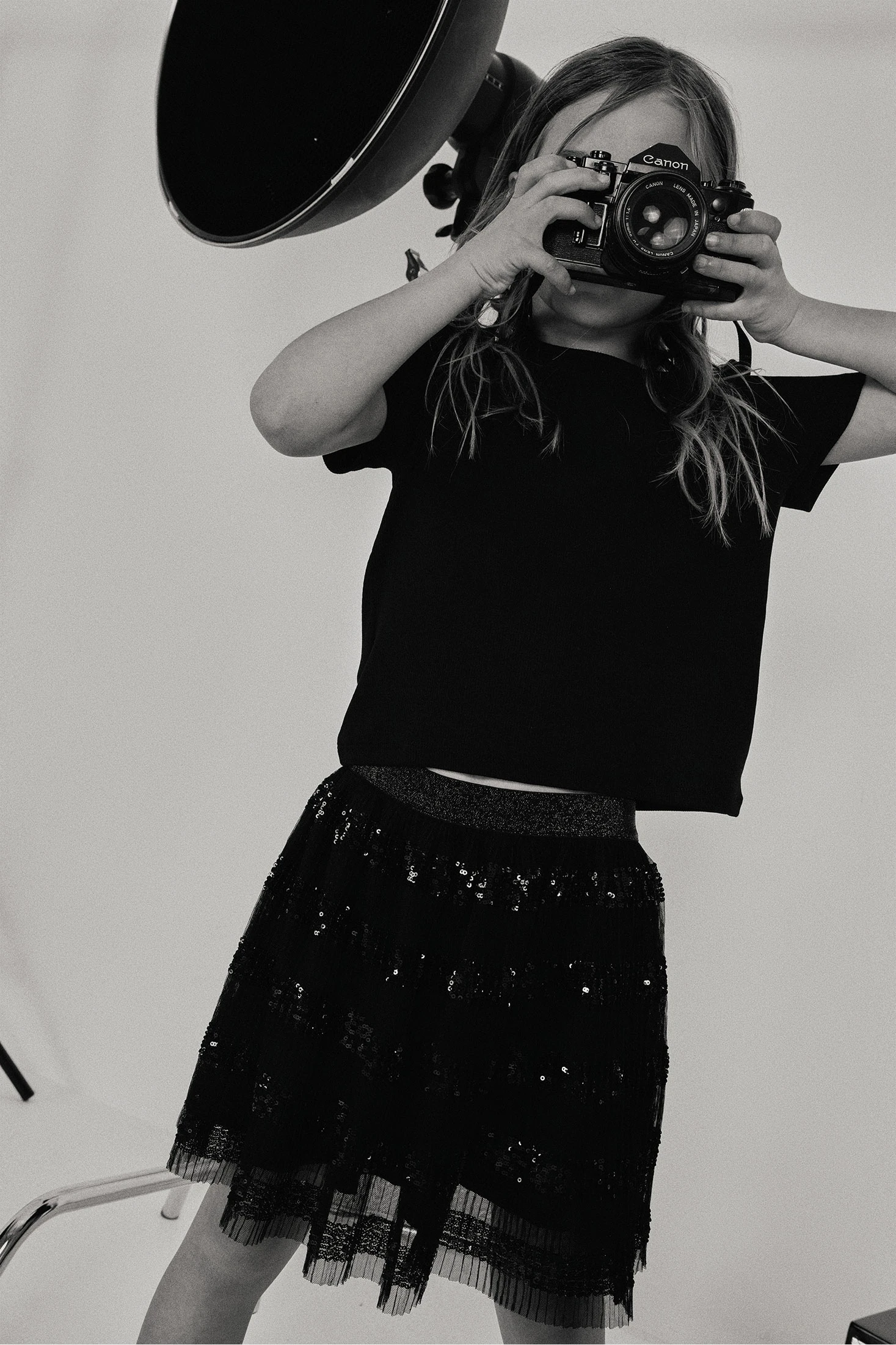Camiseta de malha canelada para menina ideal para qualquer estação. Feita em algodão de cor preta, oferece conforto e suavidade. O seu design simples e clássico inclui uma gola redonda e mangas curtas, perfeita para combinar com saias ou calças. Disponível em tamanhos desde 12 meses até 14 anos, adaptando-se ao crescimento da menina. As linhas de malha canelada adicionam um toque texturizado que aporta estilo à sua aparência. Peça básica e versátil para qualquer guarda-roupa infantil.
