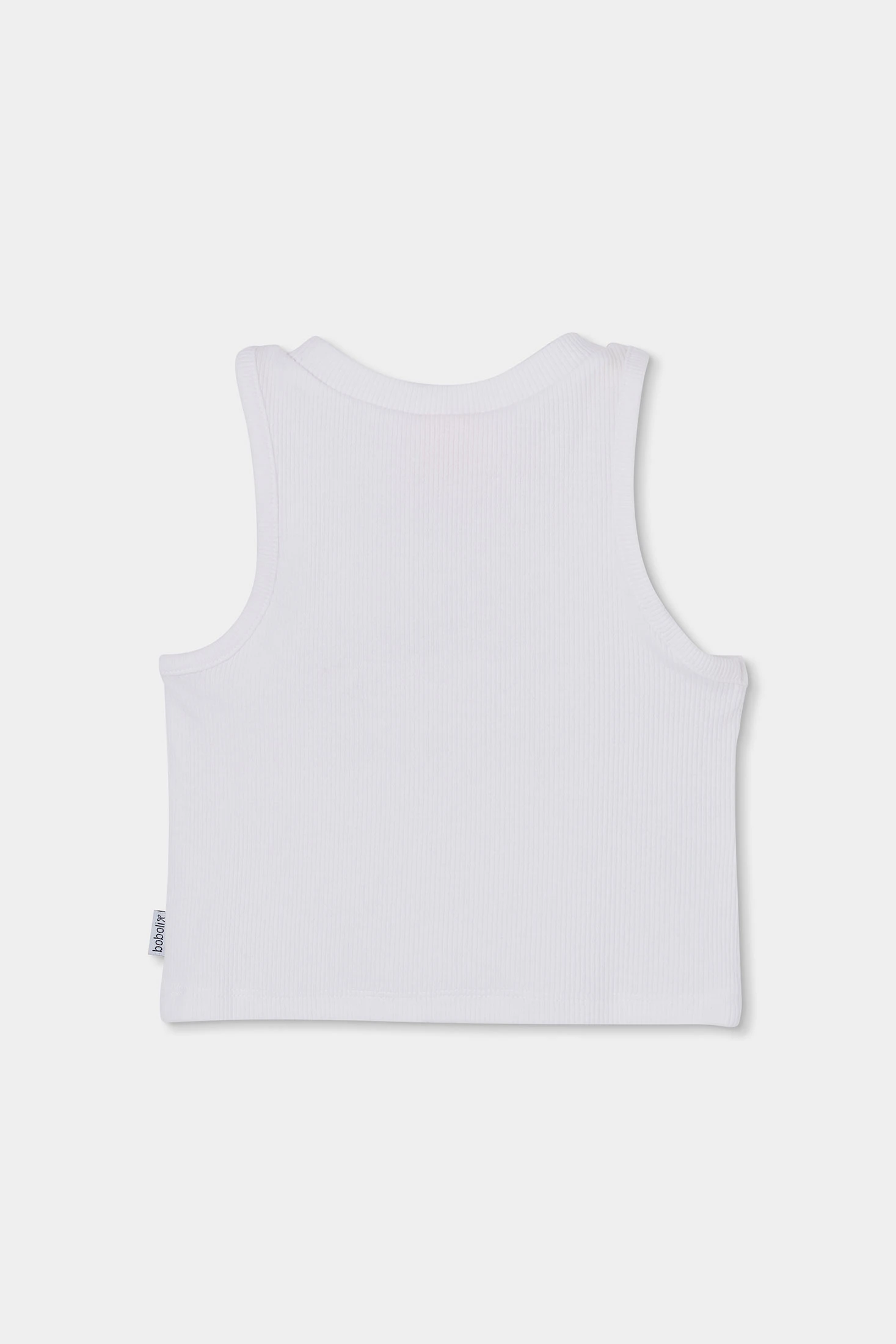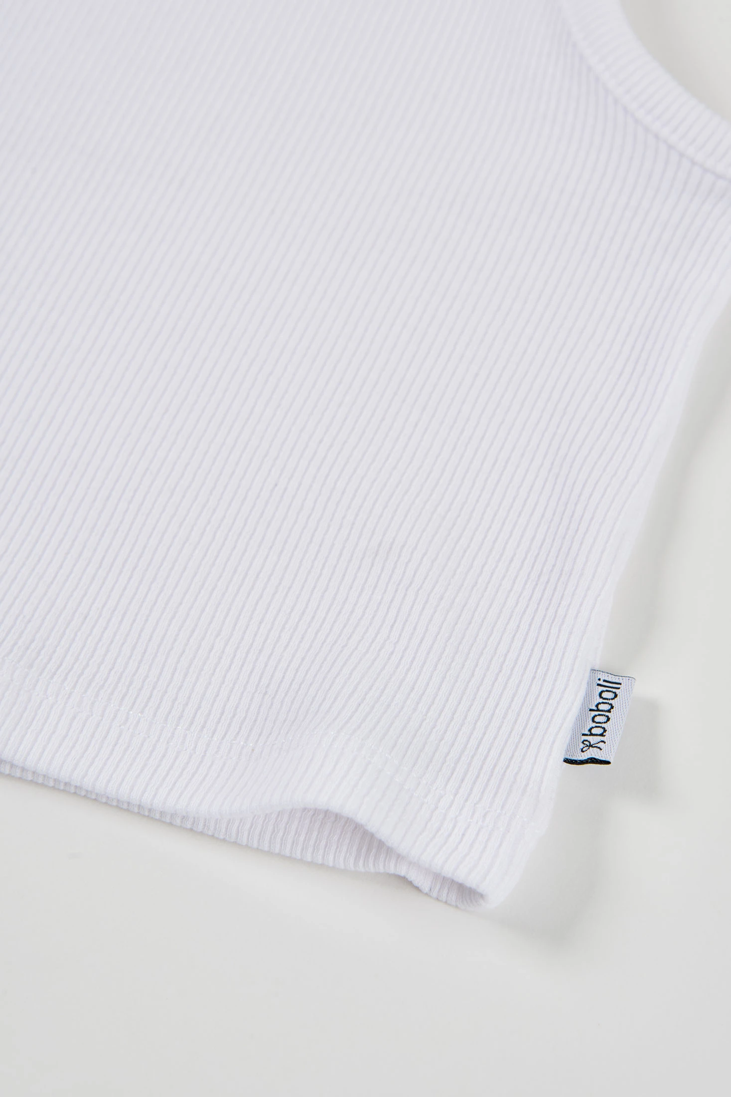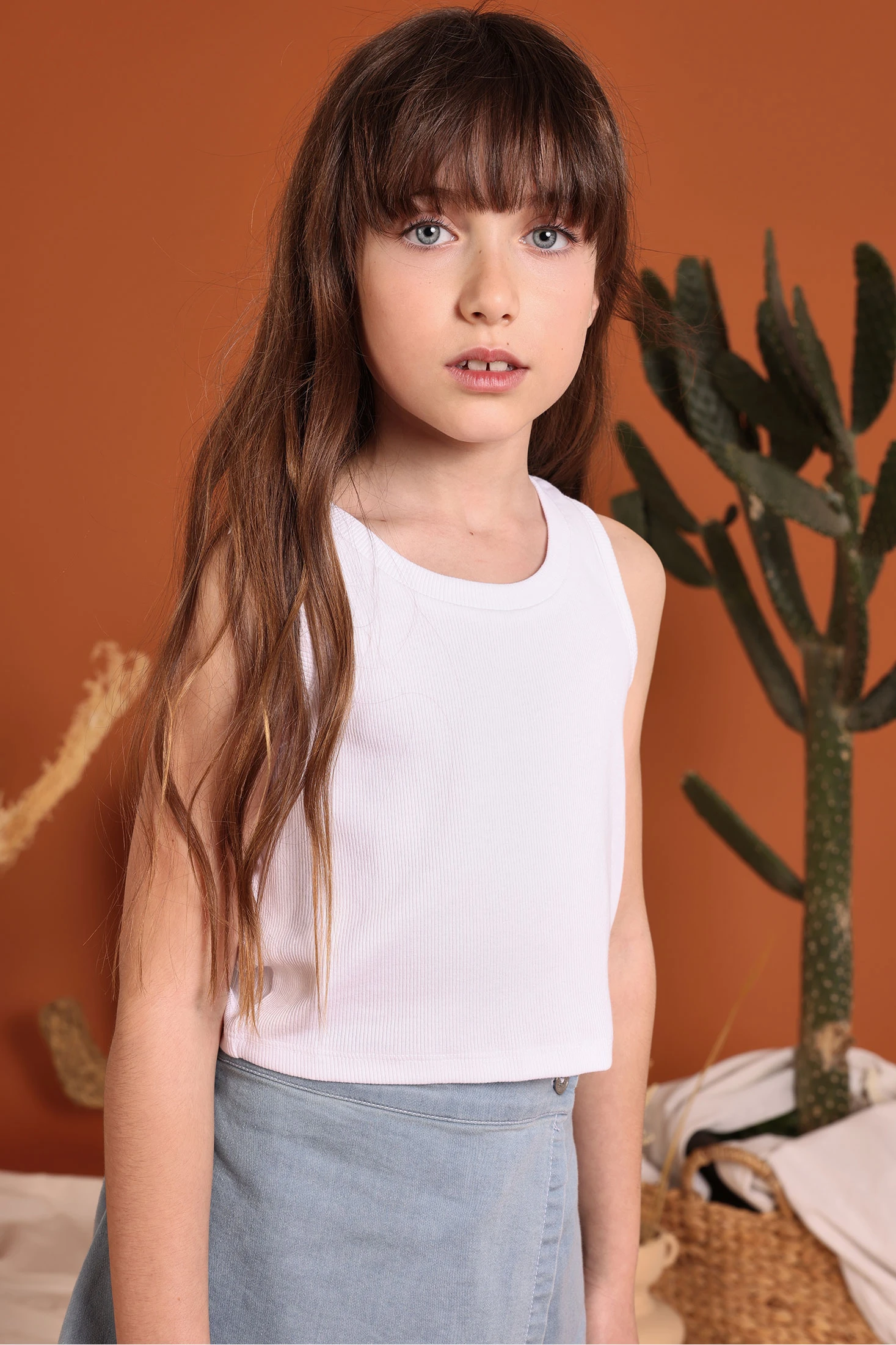 Camisola sem mangas em cor branca, ideal para meninas na temporada de verão. O seu design simples e elegante adapta-se a qualquer ocasião. Confecionada num tecido de malha canelada, oferece conforto e frescura nos dias quentes. Tamanhos disponíveis para idades desde 12 meses até 12 anos, fazendo desta peça uma opção versátil que pode ser combinada facilmente com outras roupas. O estilo clássico torna-a numa opção essencial no guarda-roupa de qualquer criança.