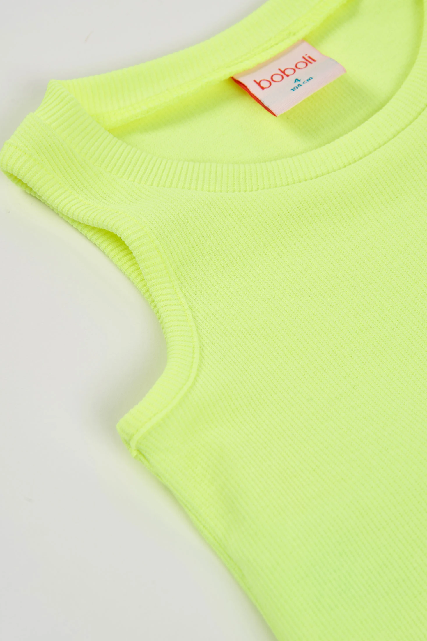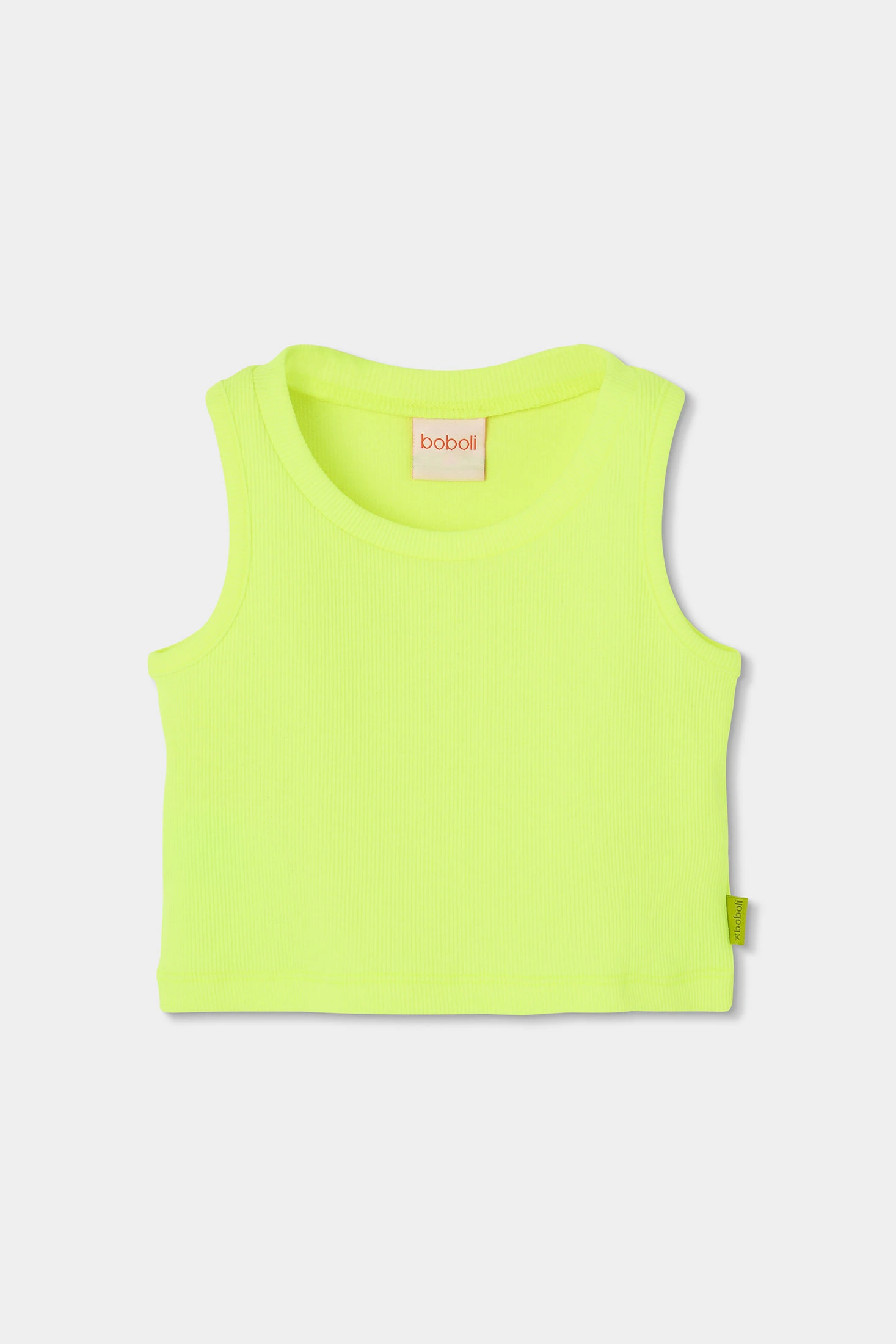 Camiseta sem mangas de malha canelada de algodão para menina, ideal para o verão. A sua cor verde néon oferece um estilo vibrante e moderno. O material de malha elástica proporciona conforto e frescura, perfeita para dias quentes. Disponível em tamanhos desde 12 meses até 14 anos, adapta-se a diferentes etapas de crescimento. Sendo de corte simples, é versátil e facilmente combinável com calções ou saias para um look casual e confortável.