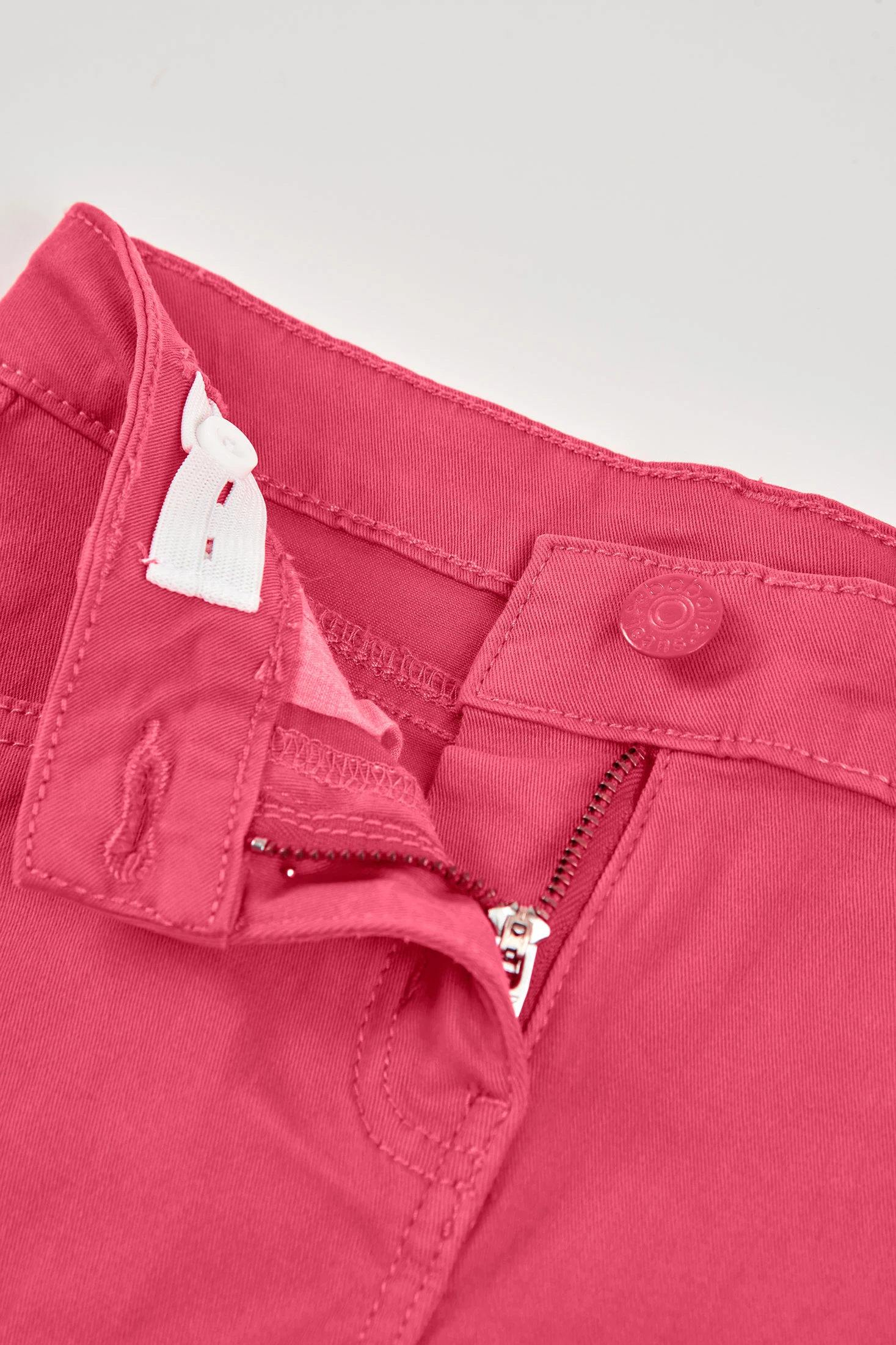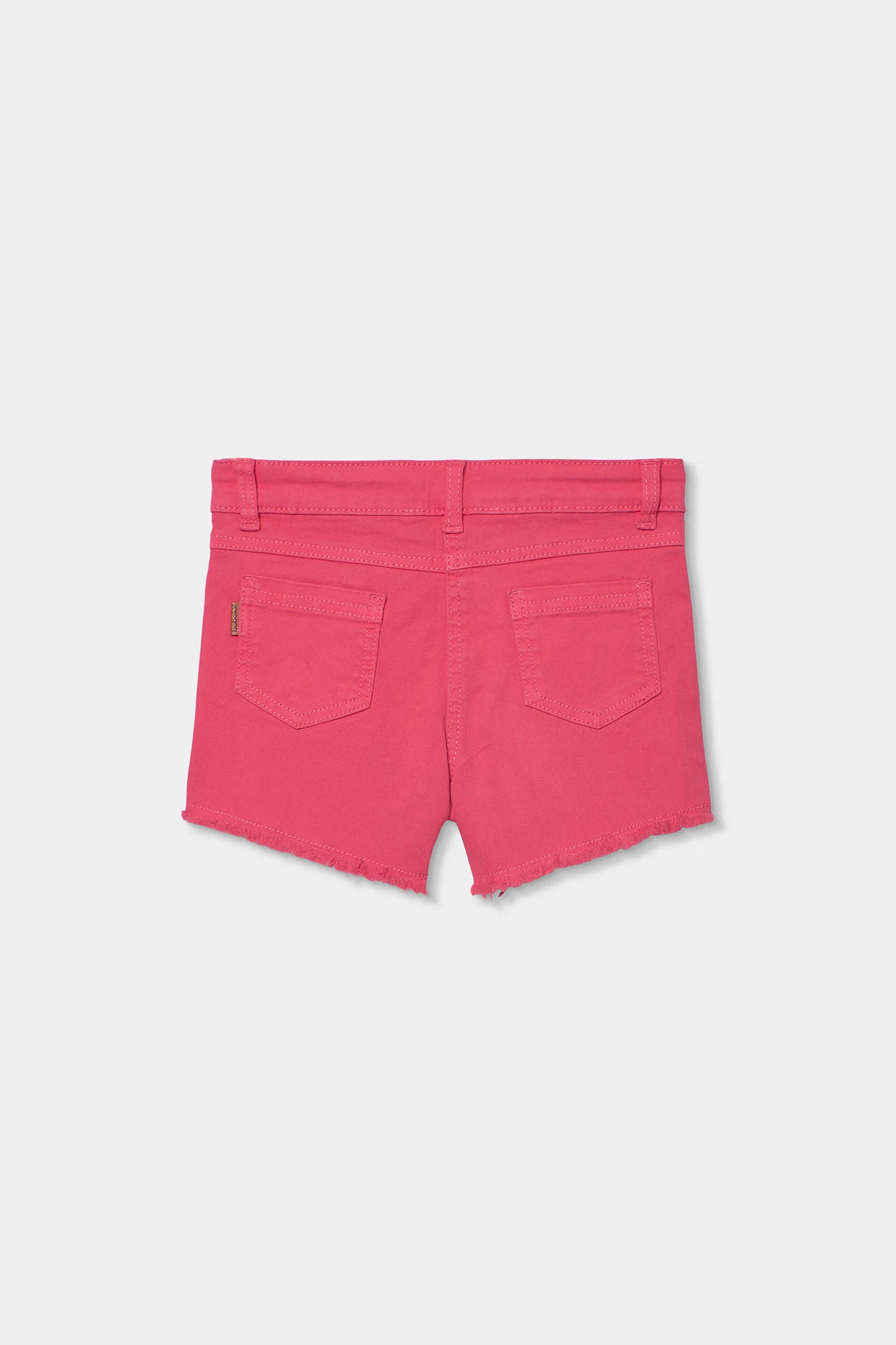 Calções de sarja elástica para menina, num tom vibrante de cor de morango, ideal para o verão. O seu tecido elástico garante conforto e liberdade de movimento, perfeito para as brincadeiras diárias. Com um design simples, é versátil e fácil de combinar com camisetas ou blusas. Disponível em tamanhos desde 12 meses até 14 anos, adapta-se ao crescimento da sua pequena. Os detalhes de desfiado nas bordas conferem-lhe um toque moderno e descontraído. Peça imprescindível para os dias quentes que garante estilo e conforto.