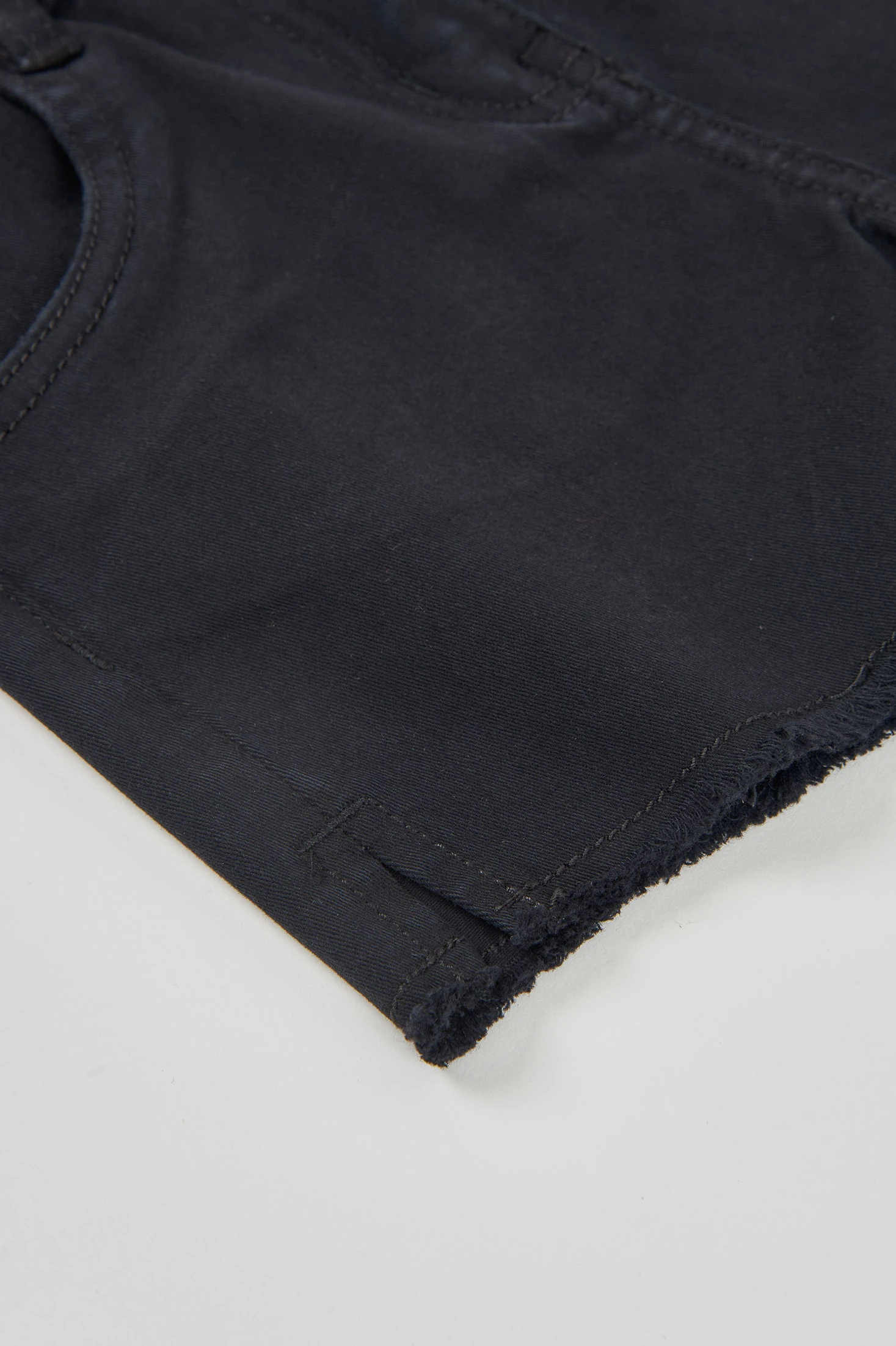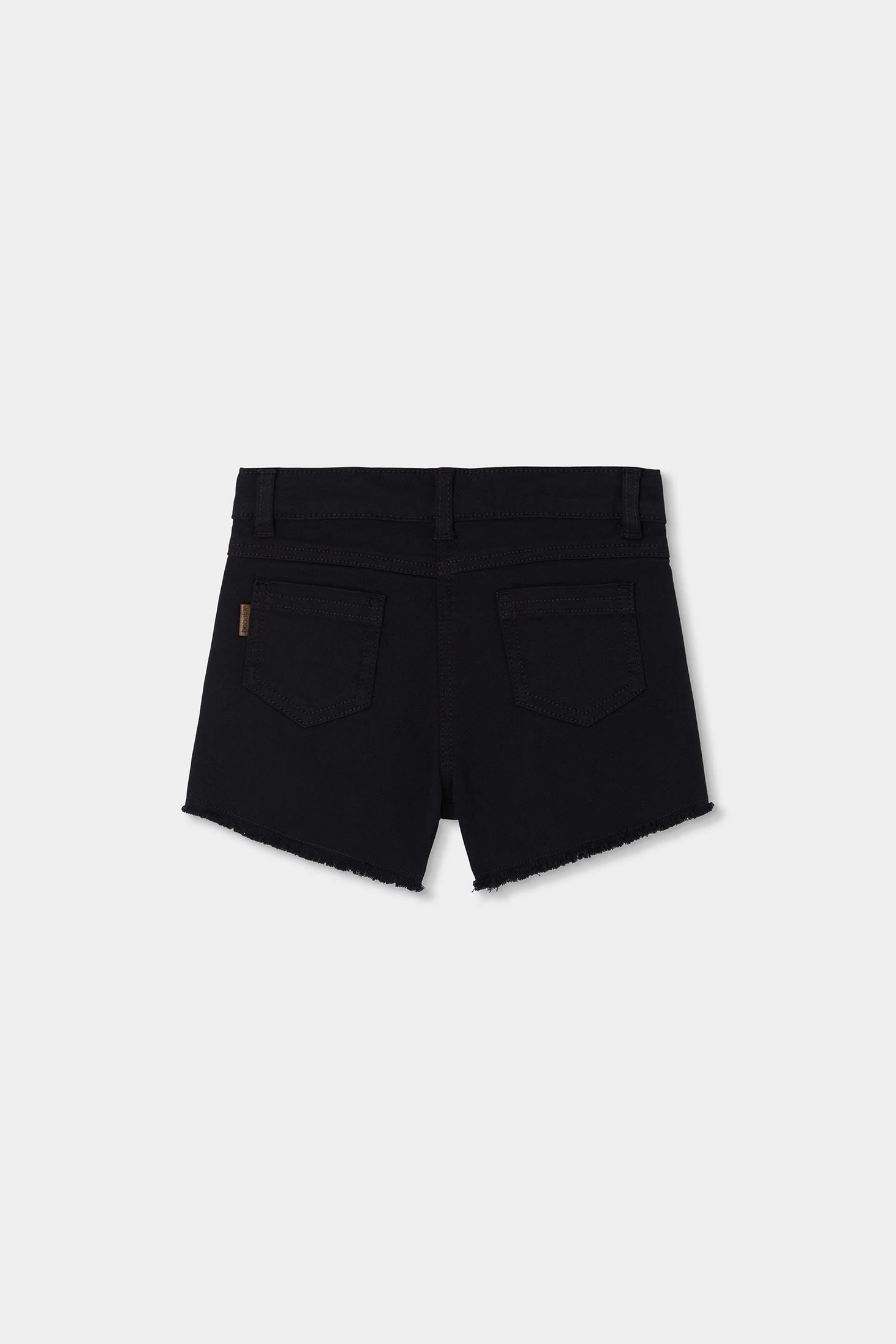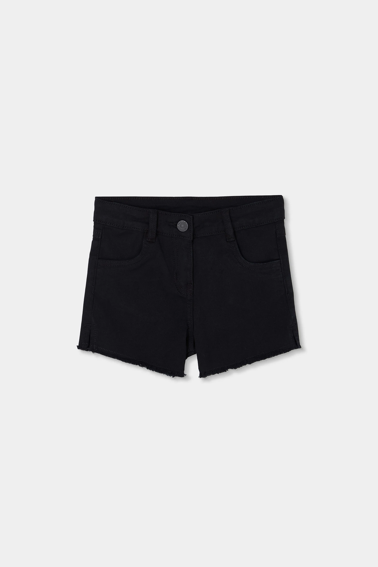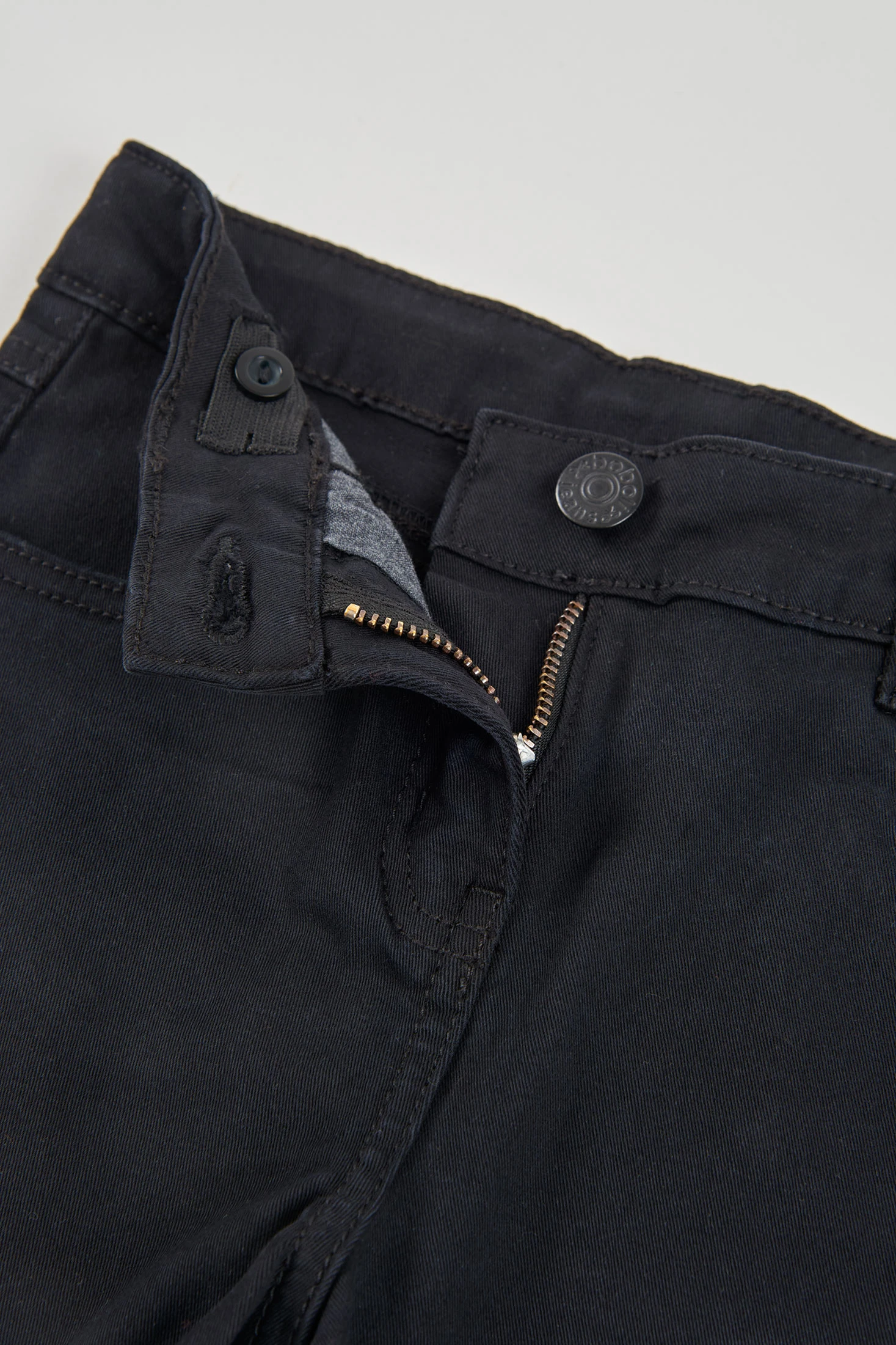 Calções de sarja elástica em preto para menina, perfeitos para um look casual e moderno. Fabricados em material resistente, são ideais para brincar e explorar. O design inclui bolsos frontais e traseiros para maior praticidade. A cor preta facilita a combinação com múltiplos estilos e cores. Disponíveis em tamanhos desde os 12 meses até aos 14 anos, adaptam-se ao crescimento da menina. Peça básica e versátil para qualquer guarda-roupa infantil.