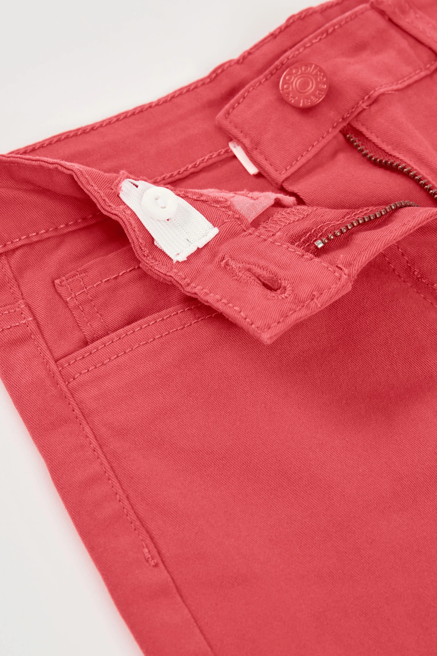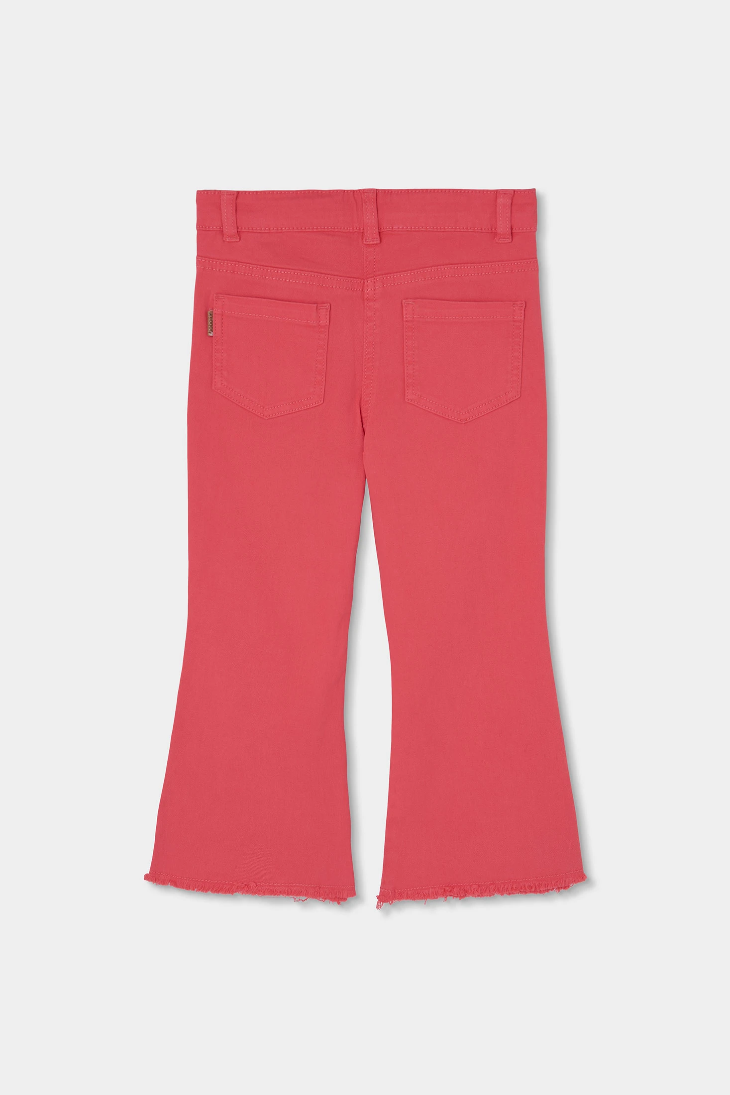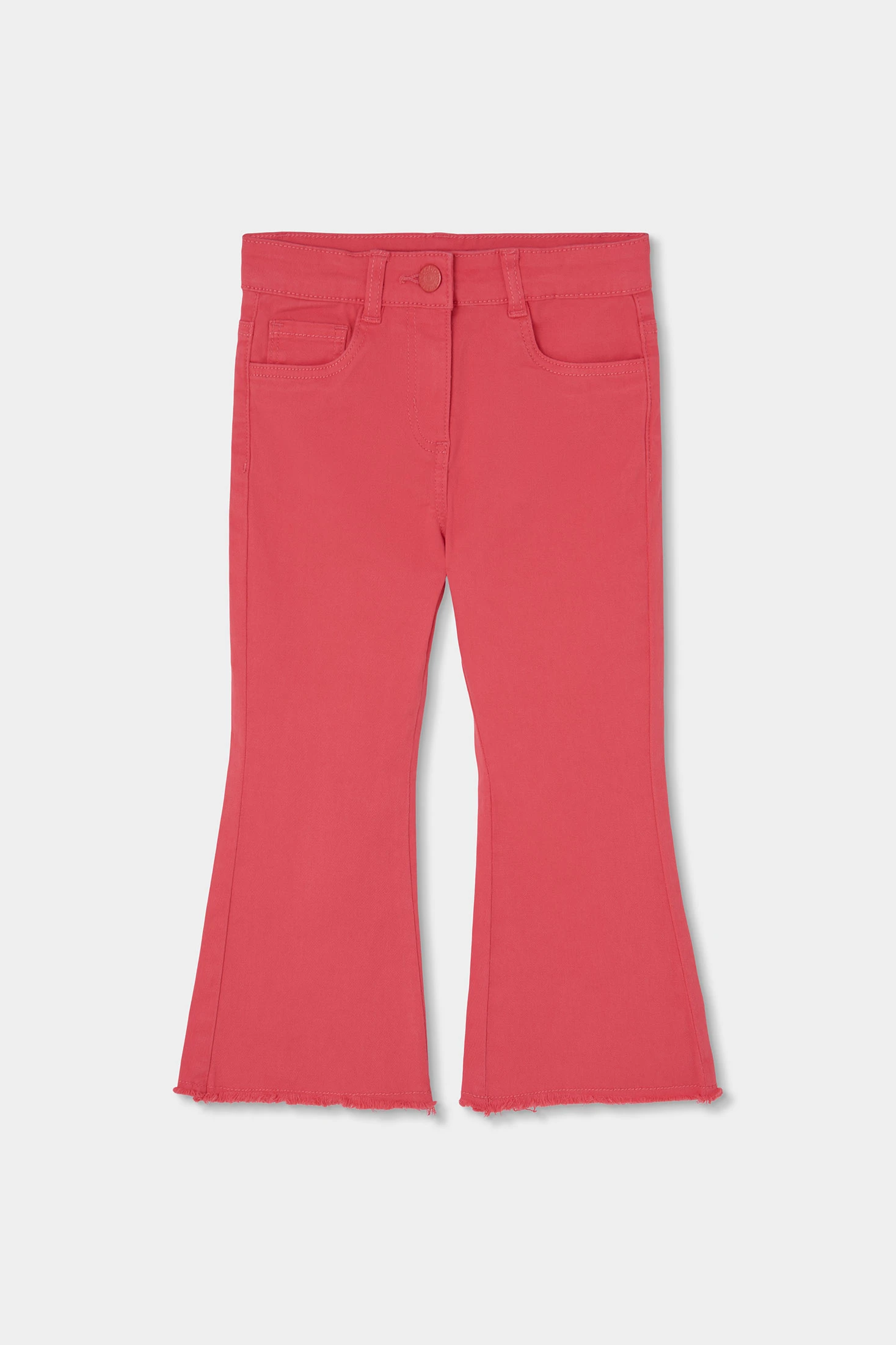 Calças de sarja elástica de menina em cor morango, confeccionadas em algodão, oferecendo conforto e suavidade. Desenhadas para meninas dos 12 meses aos 14 anos, apresentam um corte acampanado com bainhas desfiadas que lhe conferem um toque moderno. Os bolsos frontais e traseiros acrescentam funcionalidade, enquanto o fecho com botão torna-as práticas para uso diário. Ideais para combinar com t-shirts estampadas ou blusas lisas, estas calças são uma peça versátil para o guarda-roupa de qualquer menina, perfeitas para criar looks casuais e confortáveis.
