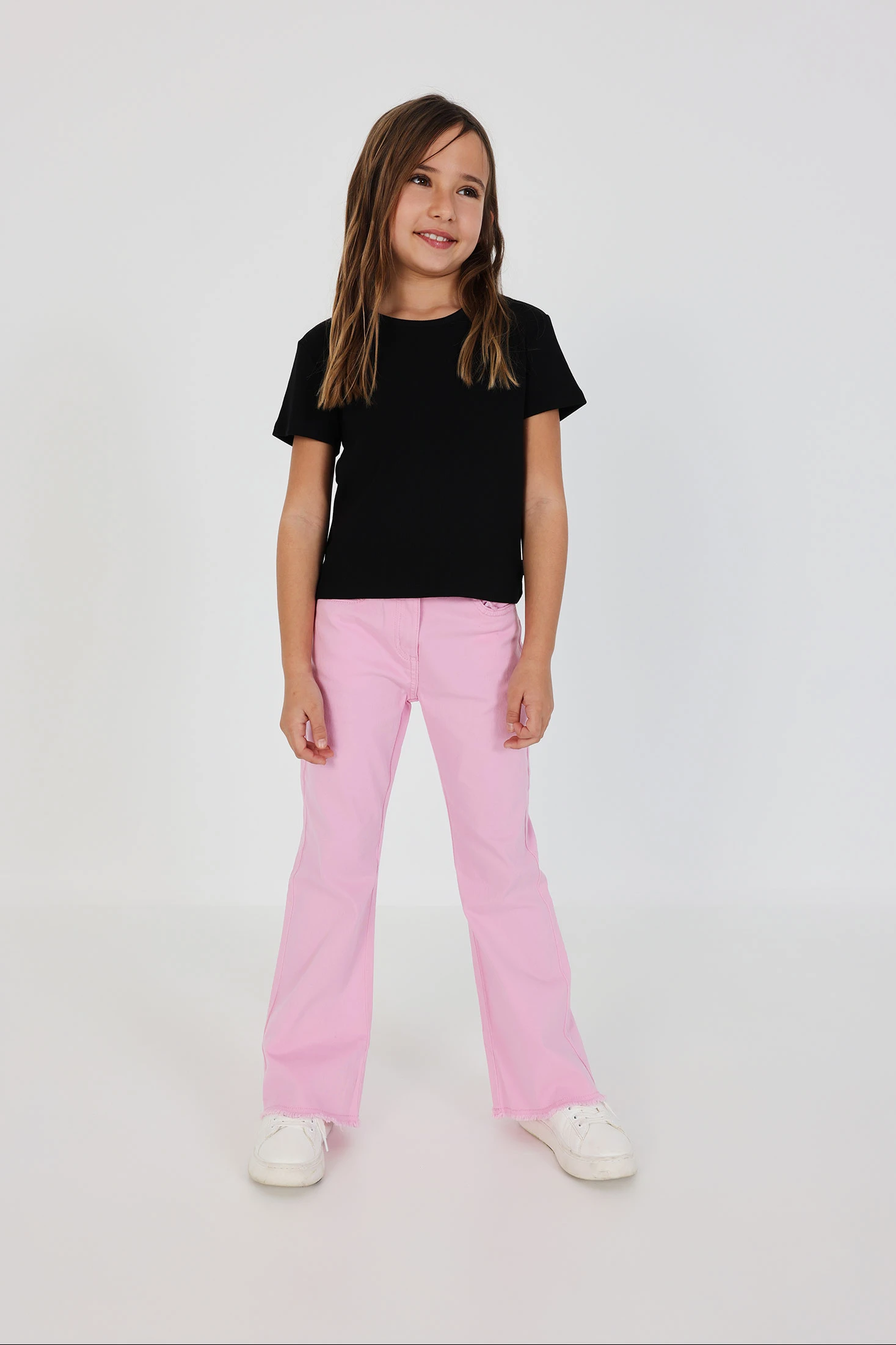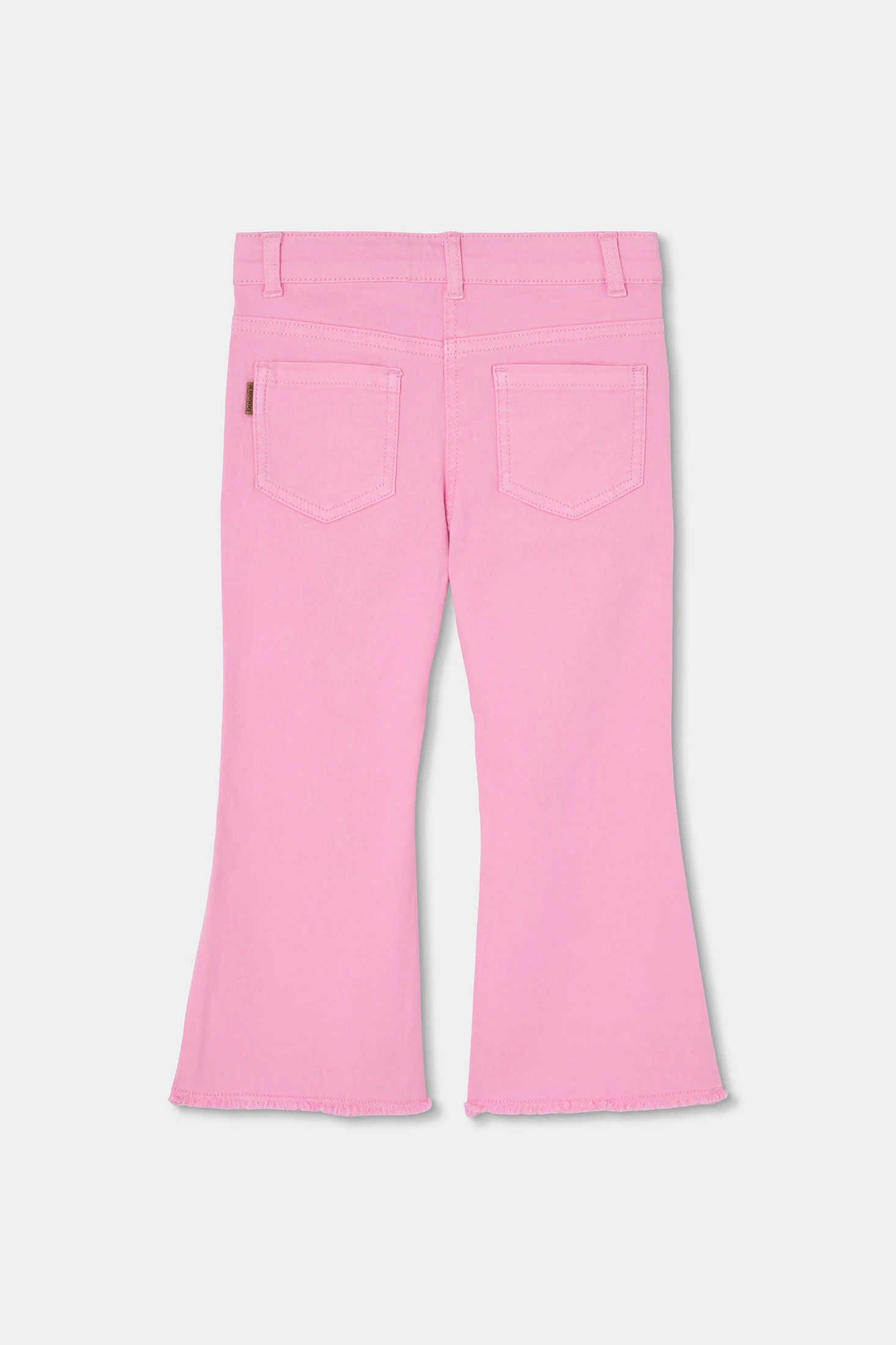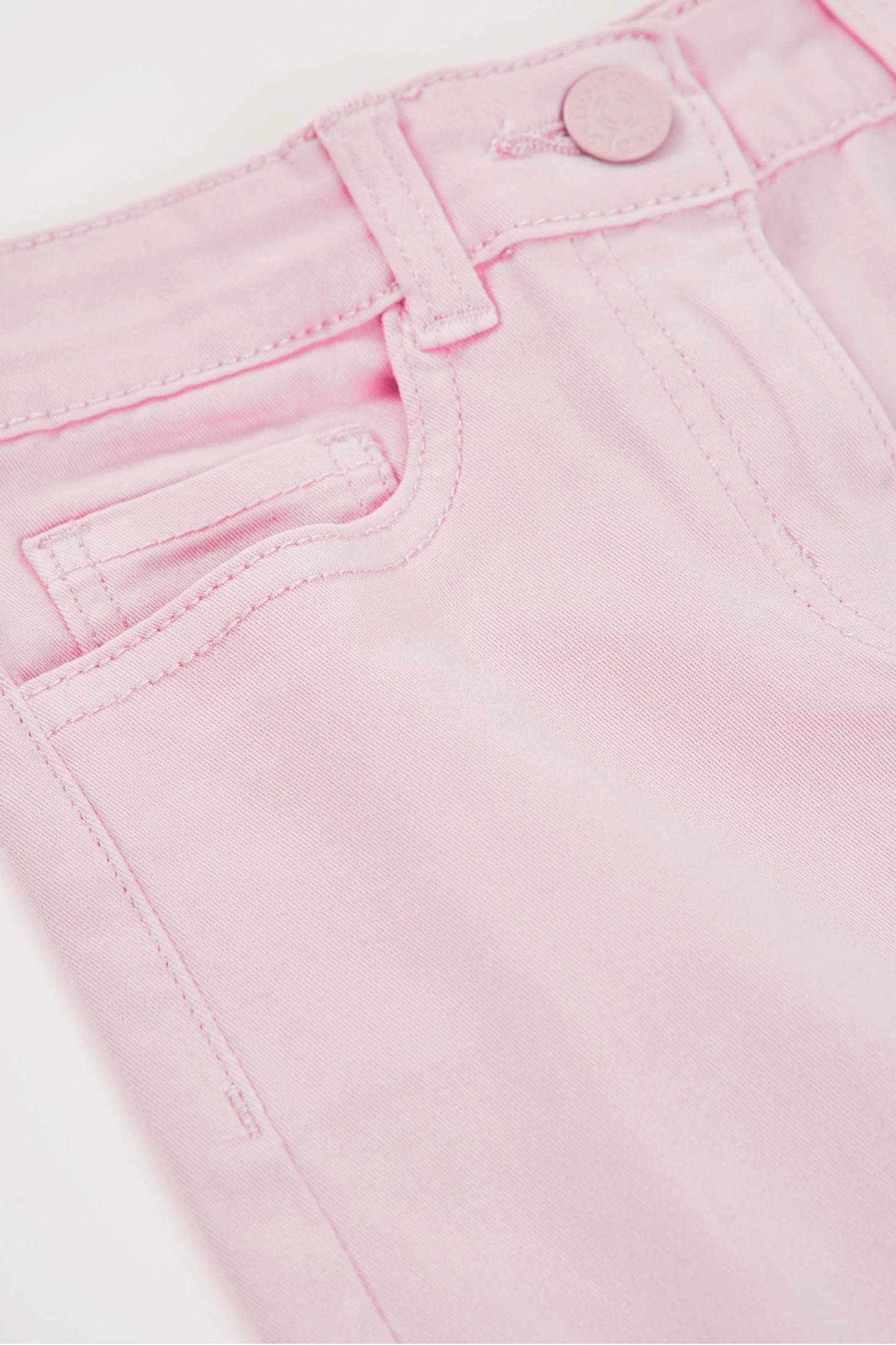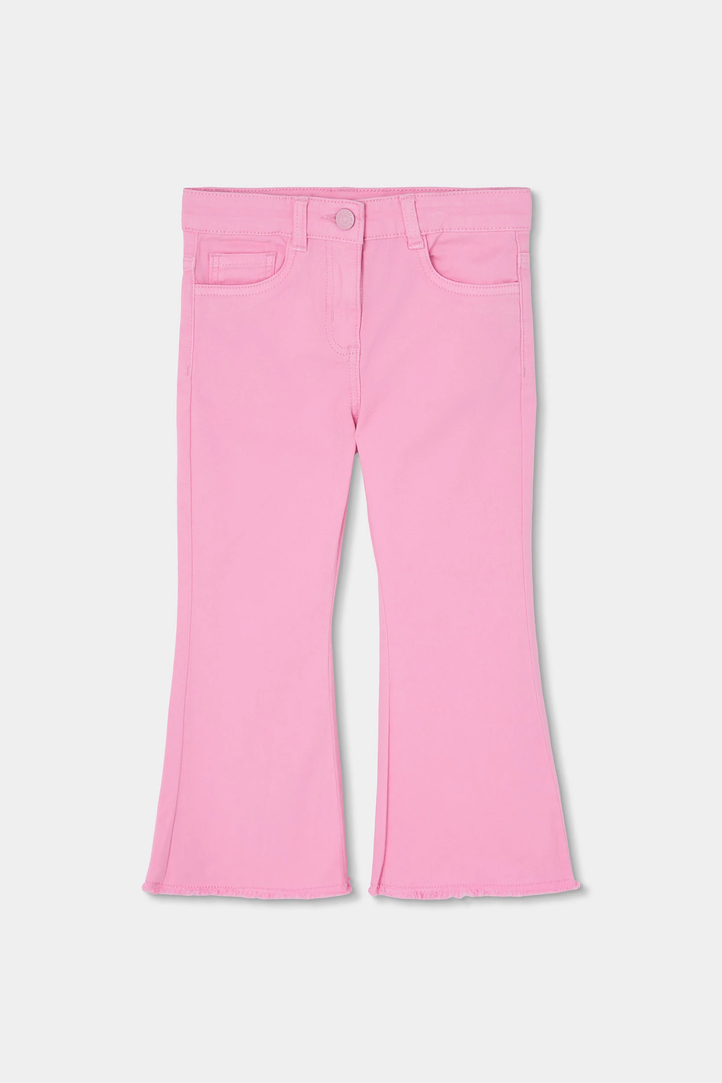 Calças de sarja elástica em cor rosa para menina, perfeitas para combinar em qualquer estação. O seu design liso e o corte ligeiramente evasê oferecem um toque moderno e versátil. O material proporciona conforto e flexibilidade, ideal para o uso diário. Os tamanhos disponíveis vão dos 12 meses aos 14 anos, adaptando-se ao crescimento das meninas. Uma peça funcional que pode ser facilmente combinada com diversas blusas ou casacos para criar um estilo encantador e confortável.