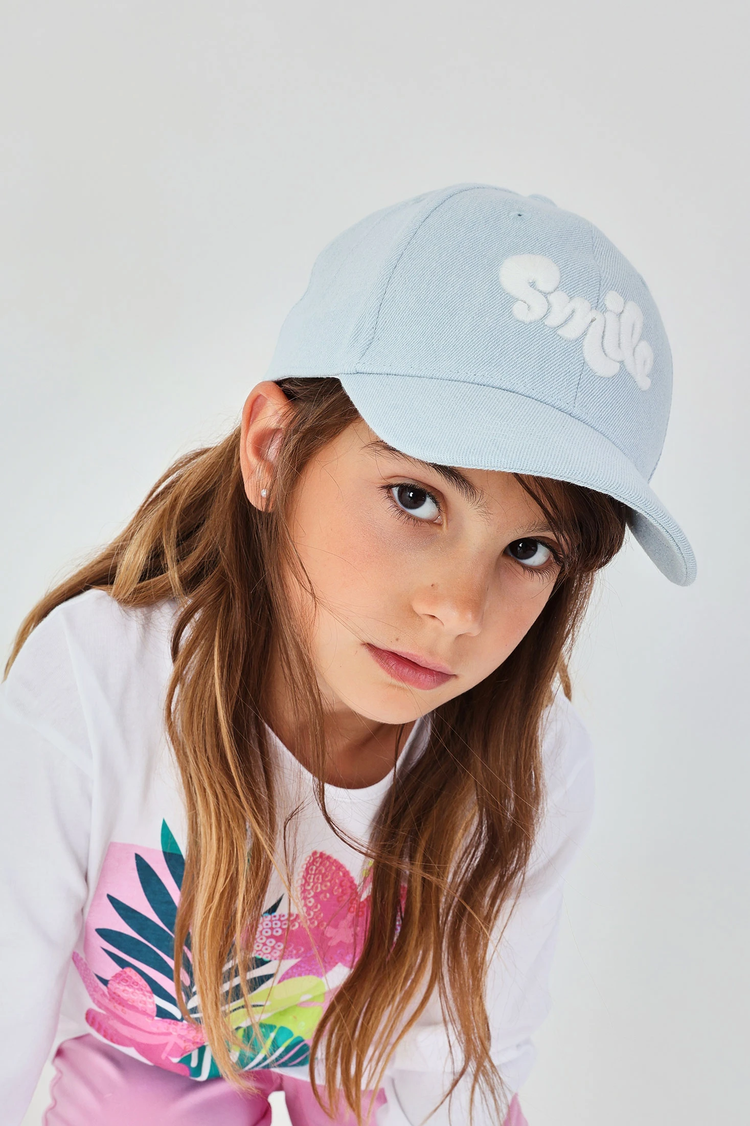 Boné de ganga para crianças, perfeito para adicionar um toque de estilo casual. Confeccionado em tecido de ganga, oferece conforto e durabilidade. O seu design em azul claro inclui a palavra "Smile" em letras na parte frontal, acrescentando um detalhe divertido. Ideal para proteger do sol enquanto complementa qualquer conjunto. Disponível em tamanhos desde 12 meses até 12 anos: S/48, M/50, L/52, XL/54. Uma opção estilizada para todas as estações.