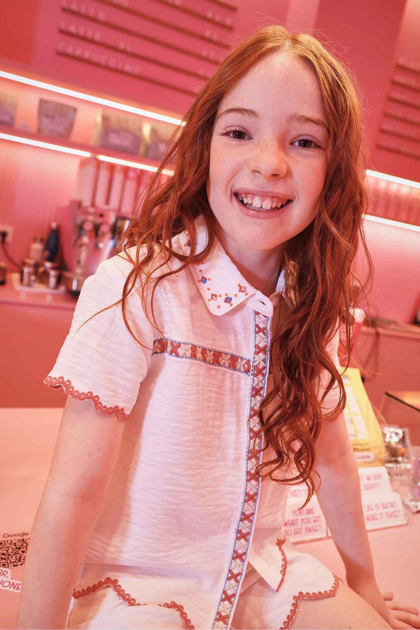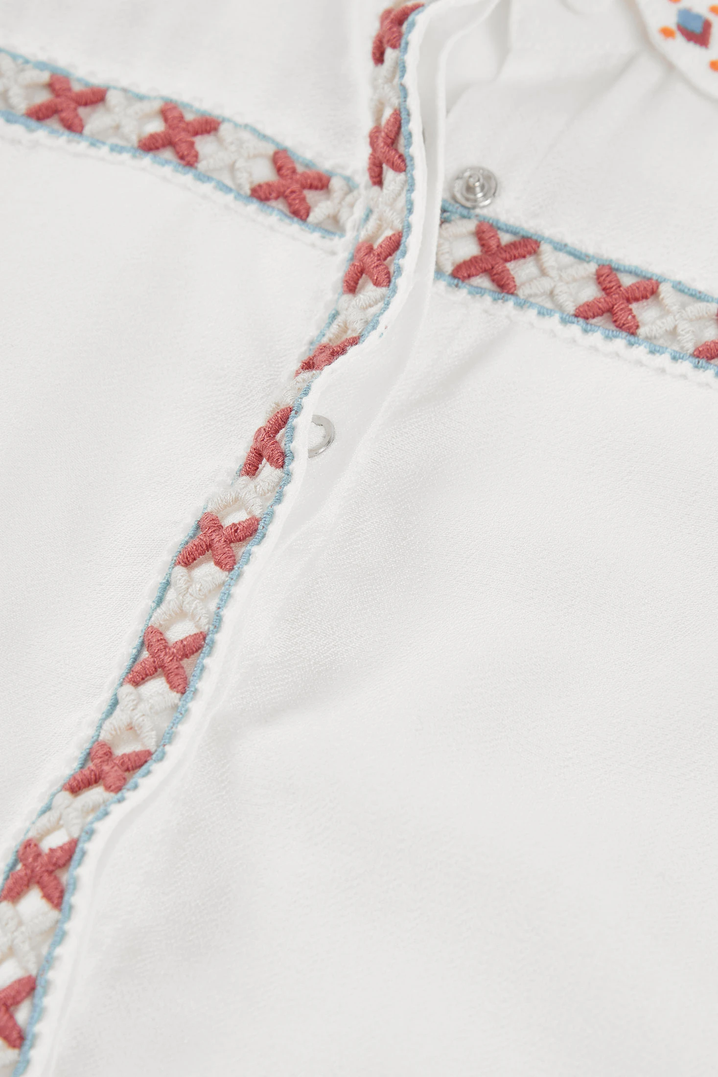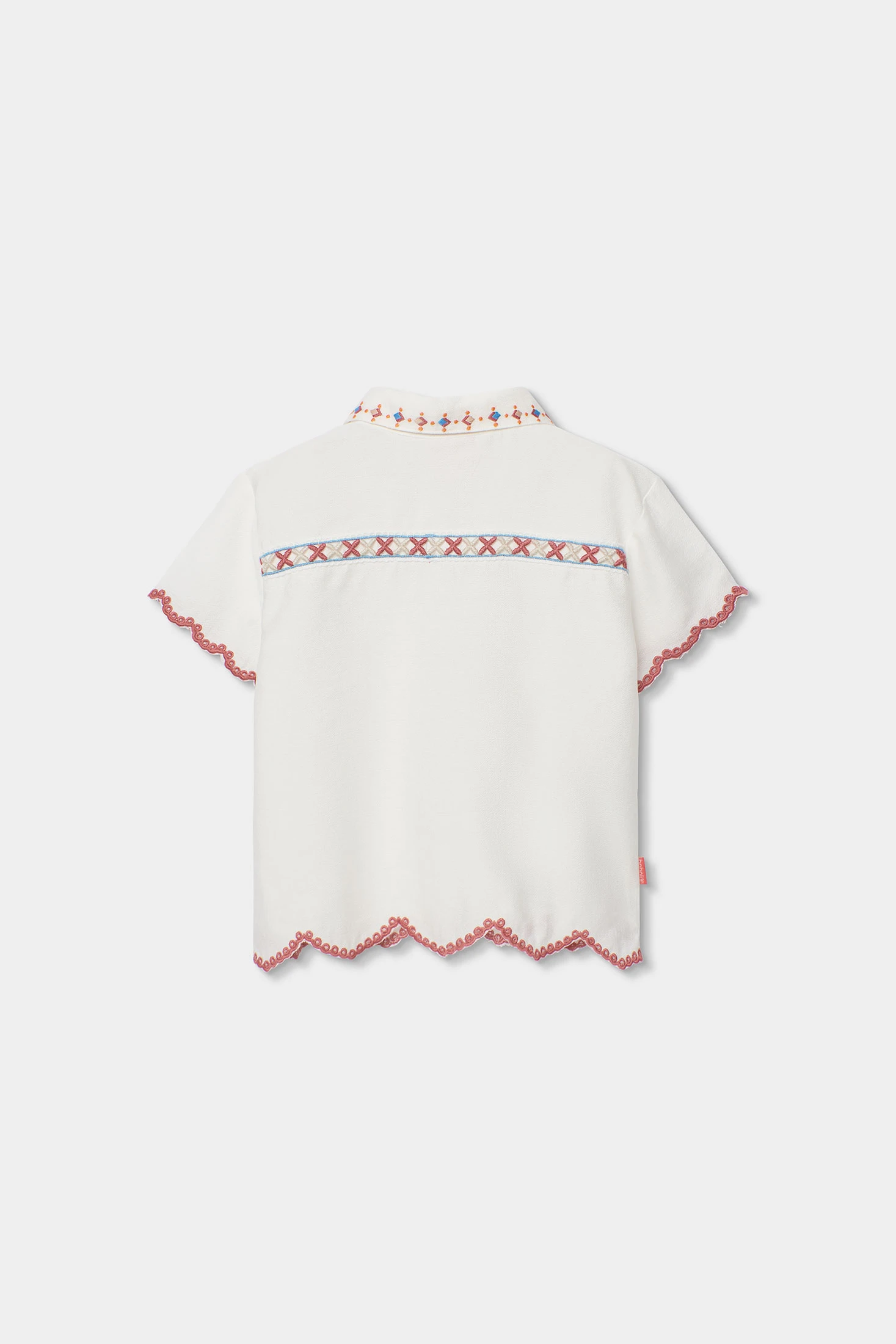 Camisa de tecido fantasia branca para menina, perfeita para ocasiões especiais. Apresenta detalhes de bordado colorido na gola e ao longo das bordas, com um delicado acabamento ondulado. As mangas curtas tornam-na ideal para climas quentes. Está disponível em tamanhos desde 12 meses até 10 anos, adaptando-se ao crescimento das pequenas. O seu design elegante permite combiná-la com saias ou calças para um look refinado e chique. Um toque de estilo e frescura para o guarda-roupa de qualquer menina.