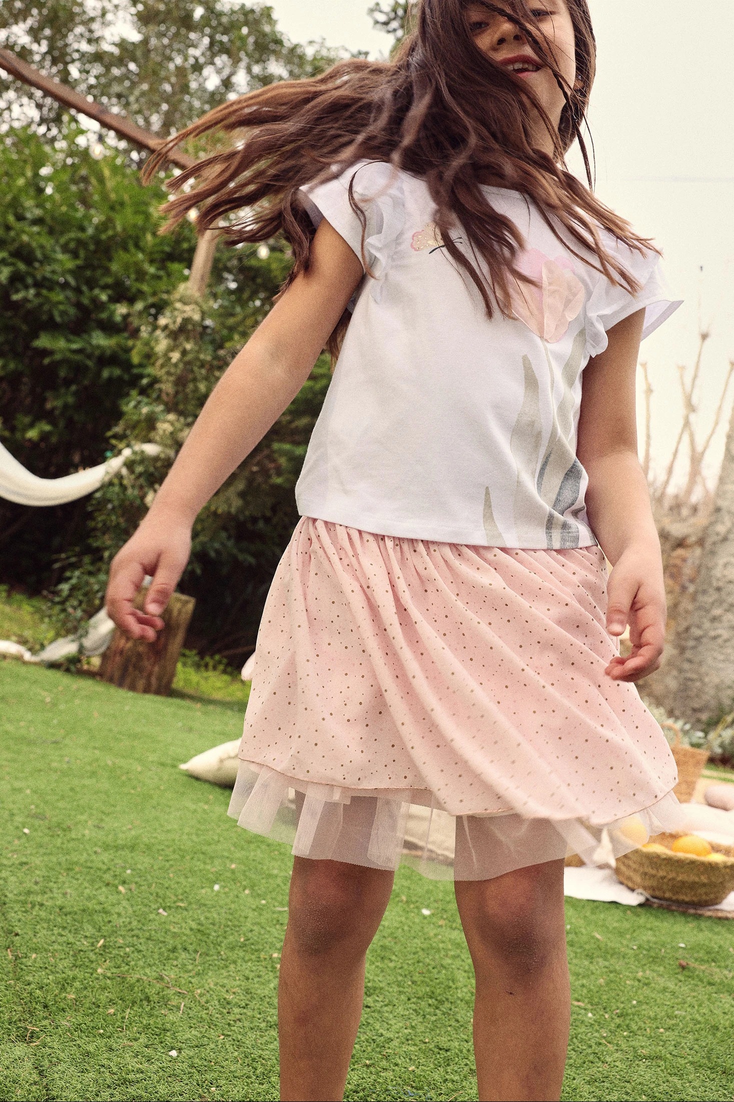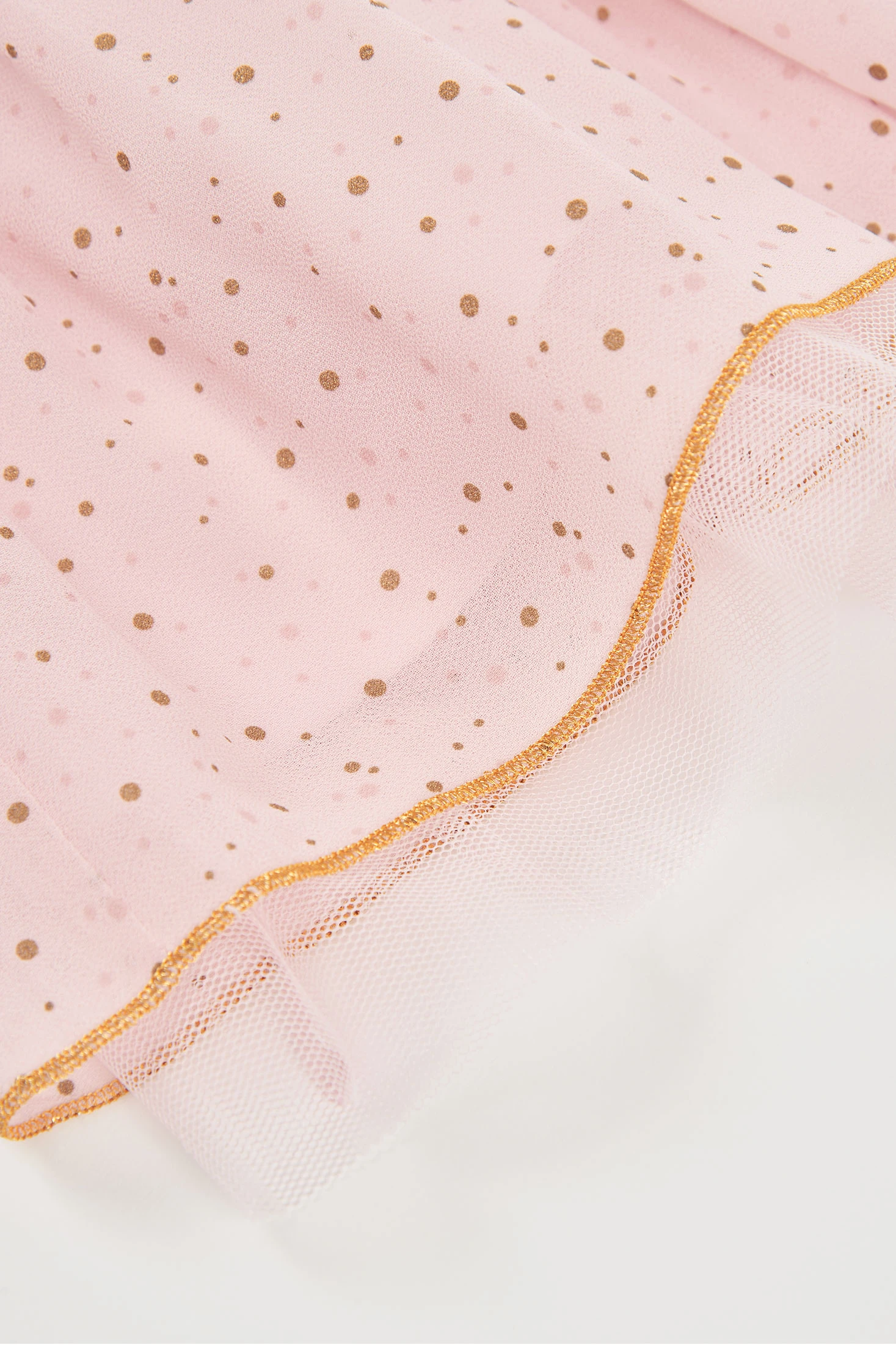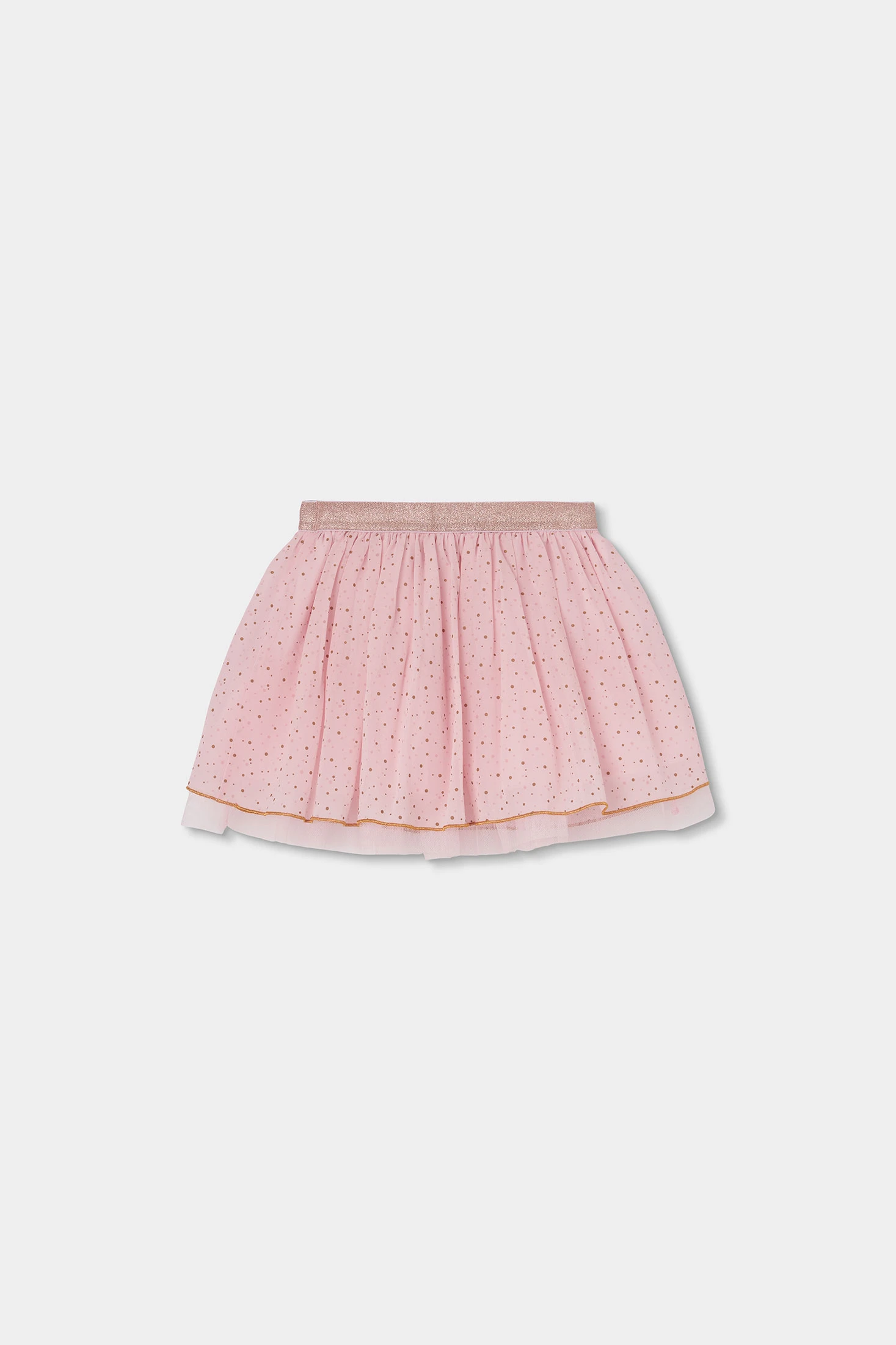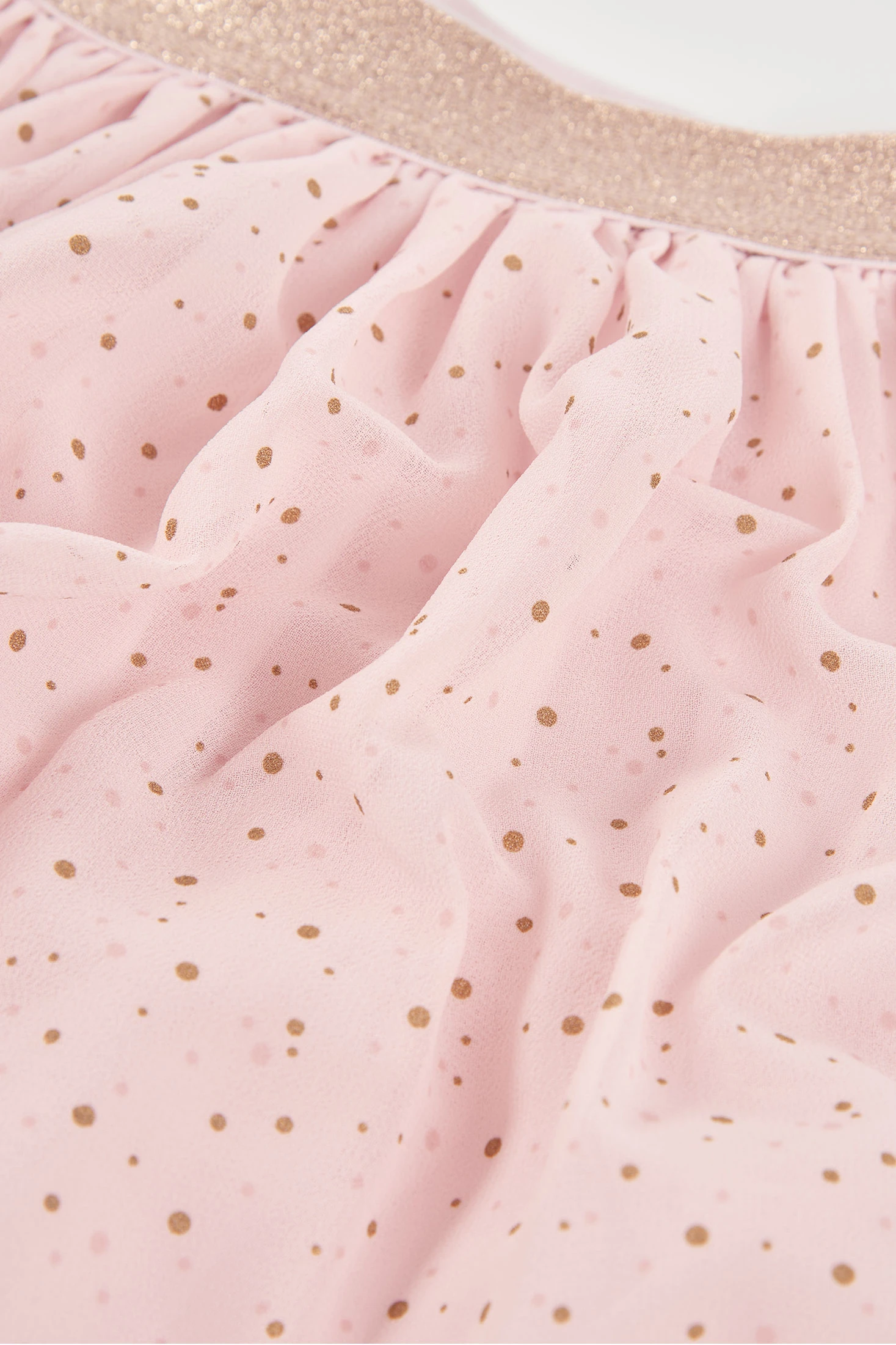 Saia de chiffon estampada rosa ideal para meninas de 12 meses a 10 anos. O seu design leve e vaporoso apresenta um suave tom rosa com pequenos motivos de pontos dourados, perfeito para ocasiões especiais. O material de chiffon confere-lhe um toque elegante e movimento fluido, enquanto a cintura elástica assegura um ajuste confortável. Um debrum dourado subtil na bainha adiciona um acento especial, tornando-a uma peça especial para combinar com blusas e casacos.