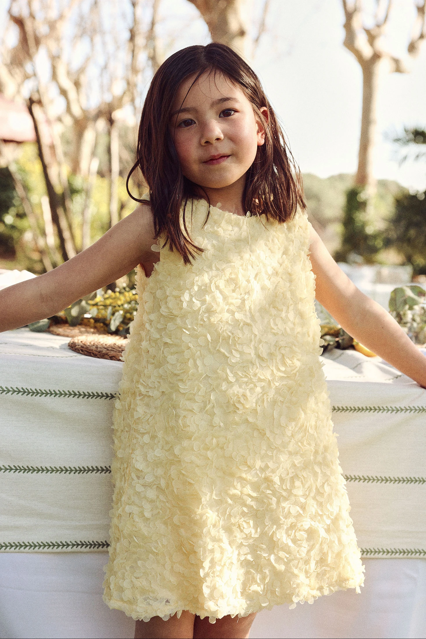 Vestido de tule amarelo ideal para meninas em ocasiões especiais. Com um design sem mangas e uma textura floral bordada por toda a superfície do vestido, oferece um estilo alegre e sofisticado. Feito de material leve, proporciona conforto e liberdade de movimento. Disponível em tamanhos desde 12 meses até 10 anos. A sua chamativa cor amarela e design texturizado fazem dele uma peça perfeita para festas e eventos, acrescentando um toque de elegância e frescura ao guarda-roupa de qualquer menina.