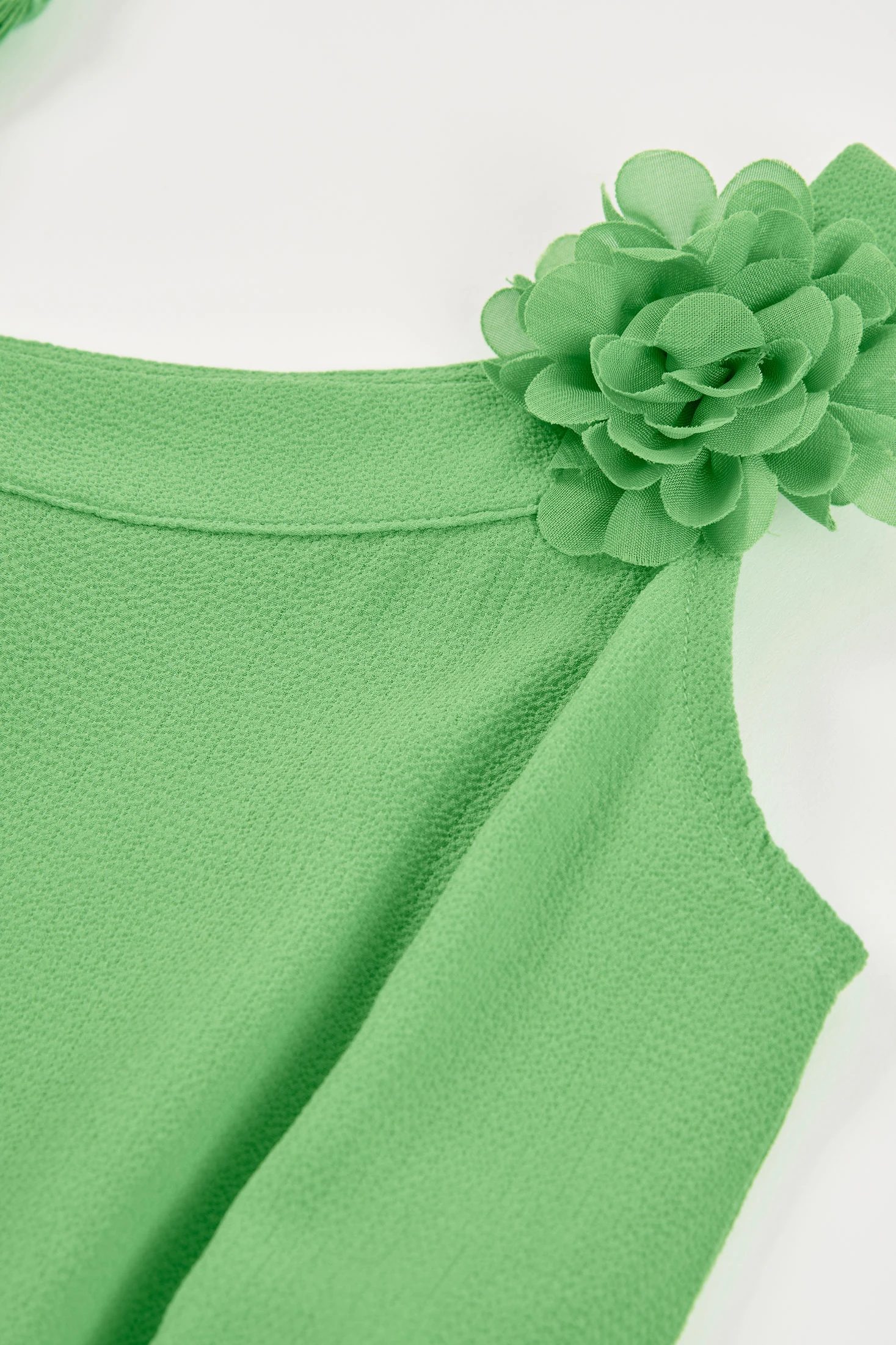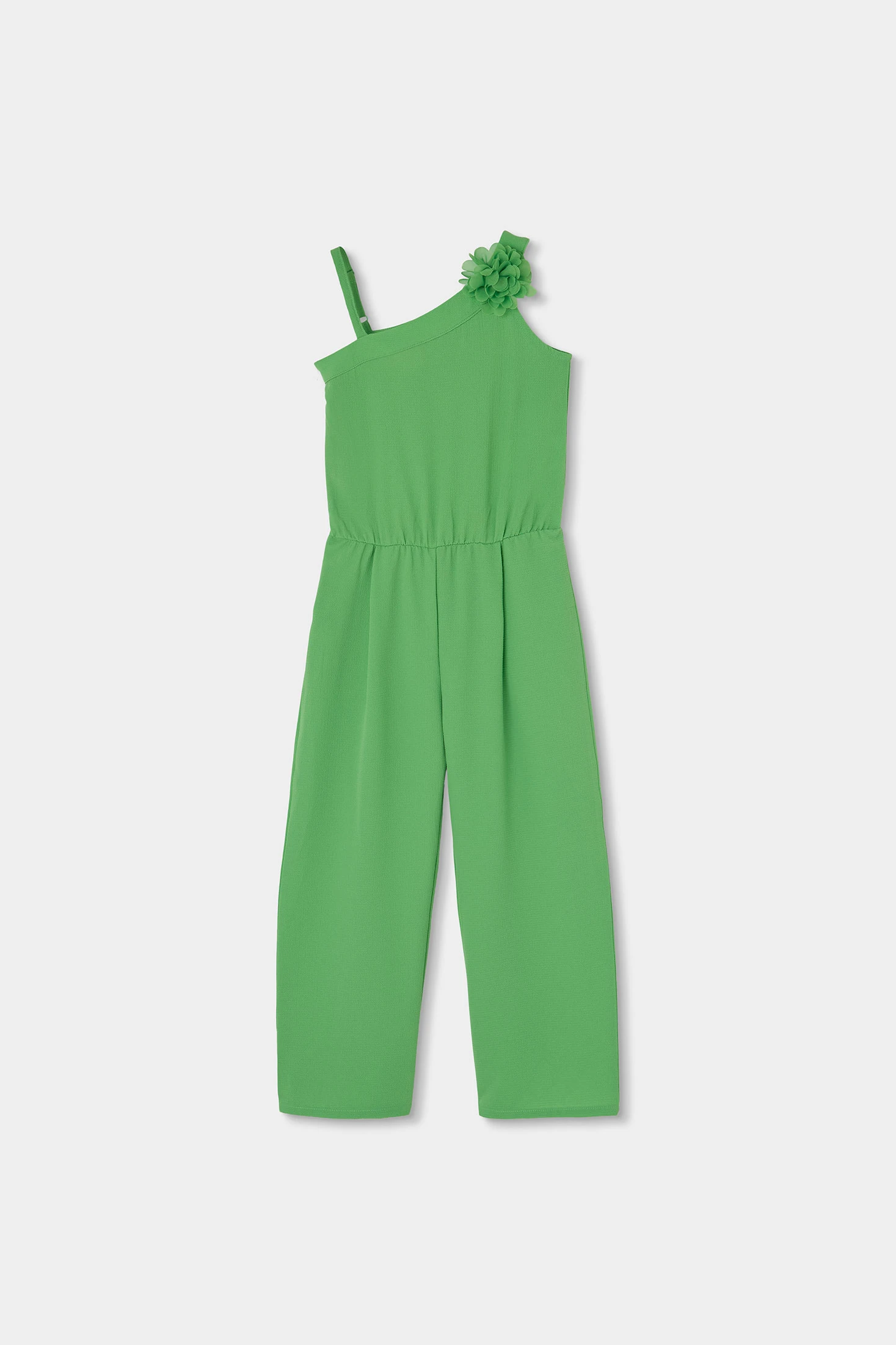 Macacão verde para menina, escolha chique e moderna, apresenta um design de uma única alça adornada com uma flor decorativa no mesmo tecido crepe verde, oferecendo um estilo único e fresco. Confeccionado num material de crepe suave e confortável, é ideal para o uso diário. Destinado a idades desde os 2 anos até aos 14 anos. A cintura elástica garante um ajuste perfeito, enquanto as pernas largas proporcionam liberdade de movimento. Perfeito para combinar com acessórios coloridos, é uma peça versátil para diferentes ocasiões.