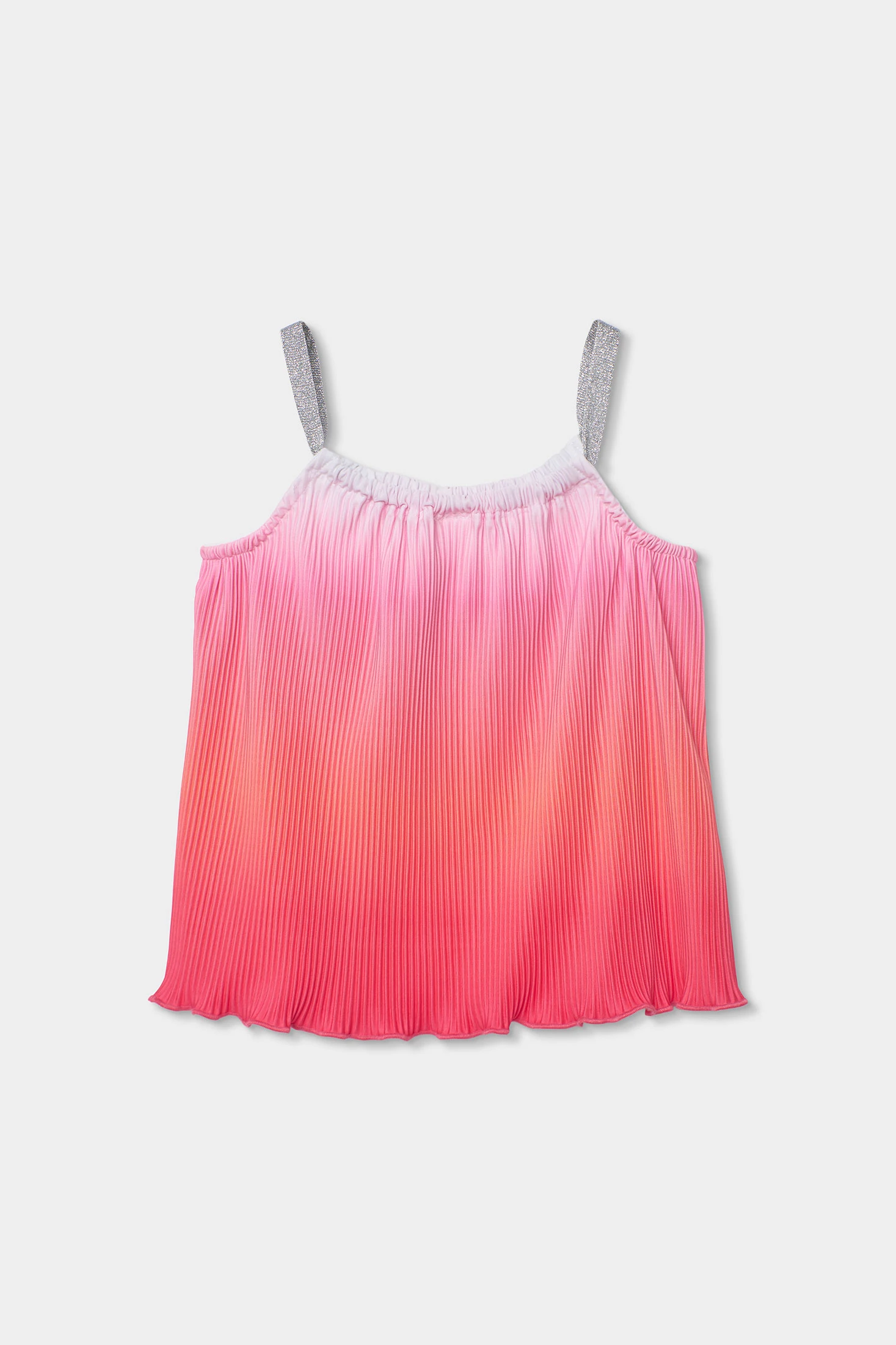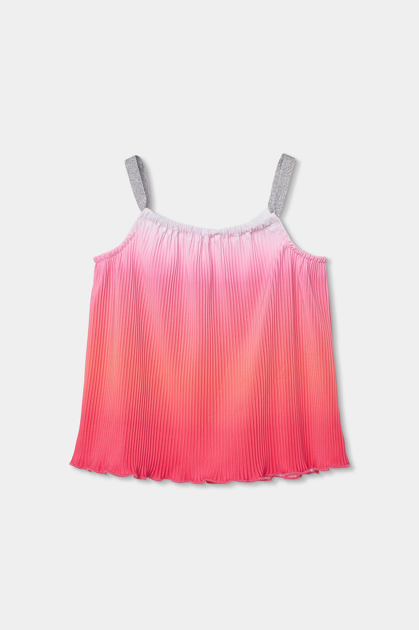 Top de chiffon em cor morango, ideal para meninas que procuram conforto e frescura nos seus trajes. O seu design plissado dá-lhe um ar elegante e leve, perfeito para ocasiões especiais ou para uso diário durante o verão. Alças brilhantes acrescentam um toque de glamour, fazendo com que o top se destaque. Está disponível em tamanhos de 2 a 14 anos, permitindo que seja uma opção versátil para diferentes idades. Combina perfeitamente com jeans ou saias, tornando-o uma peça imprescindível no guarda-roupa de qualquer menina.
