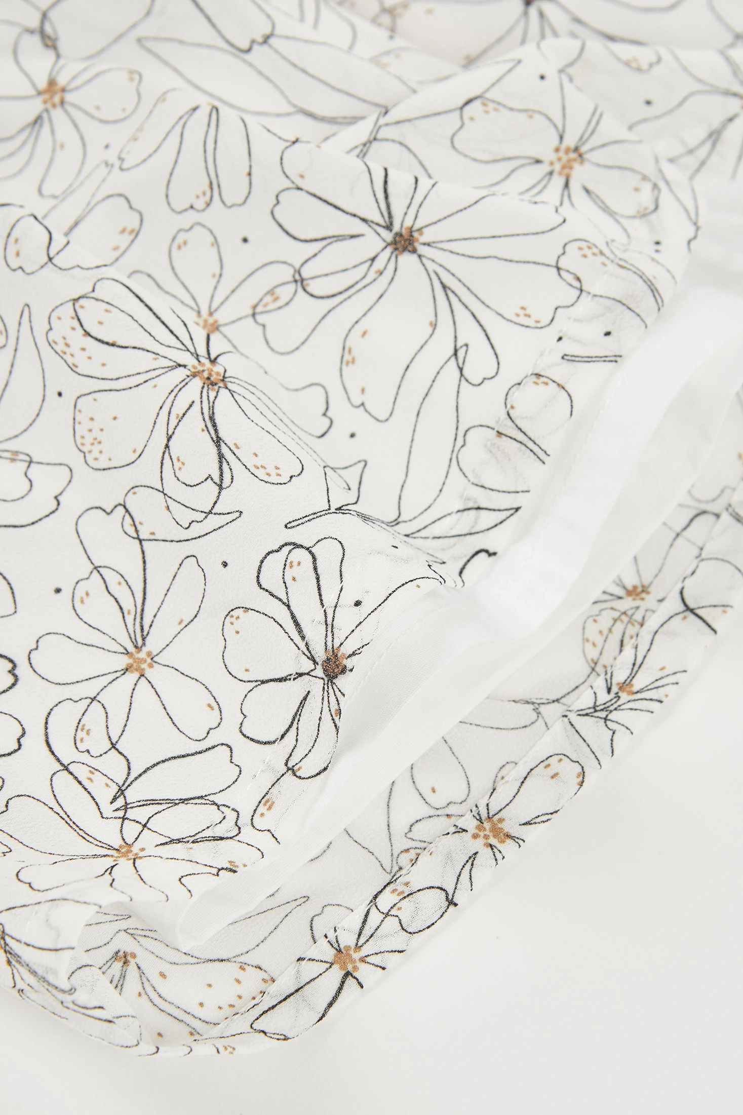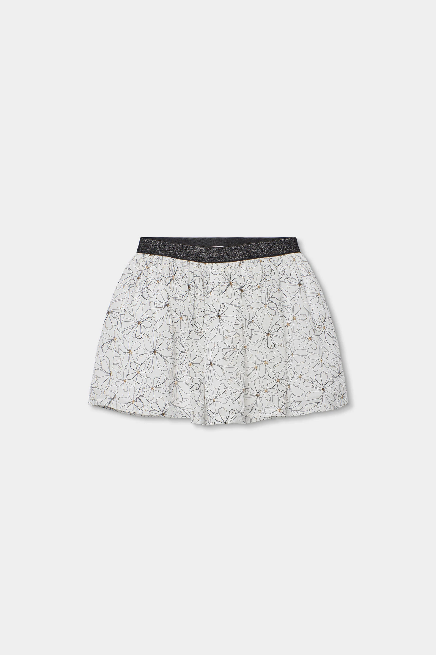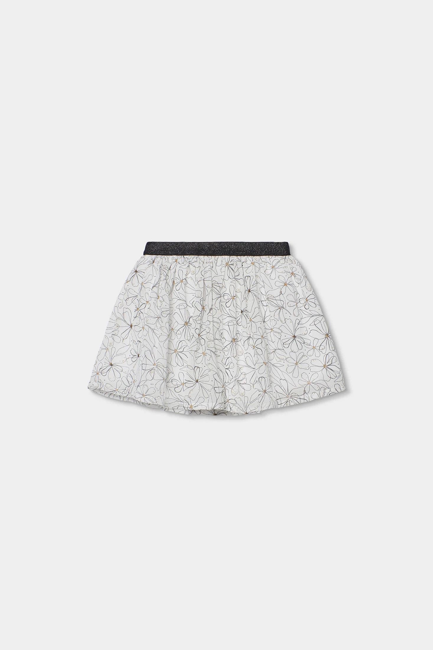 Saia branca estampada para menina com delicado design floral em traços finos e detalhes dourados que acrescentam um toque elegante. Possui cós elástico preto com brilho, proporcionando um ajuste confortável e prático. O seu corte evasê e tecido leve oferecem movimento e frescura. Ideal para combinar com t-shirts básicas, blusas ou casacos de malha, criando looks sofisticados e femininos..