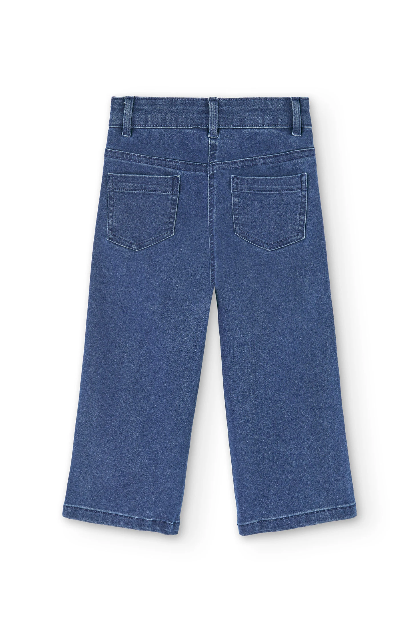 Calças em denim elástico para menina. De cor azul, apresentam um design liso com acabamento denim, ideal para um estilo casual e confortável. São confeccionadas num tecido denim flexível, com uma composição de 80% algodão e 20% poliéster, que proporciona conforto e um ajuste agradável para o dia a dia. Uma peça versátil e prática, perfeita para combinar com diferentes looks infantis.