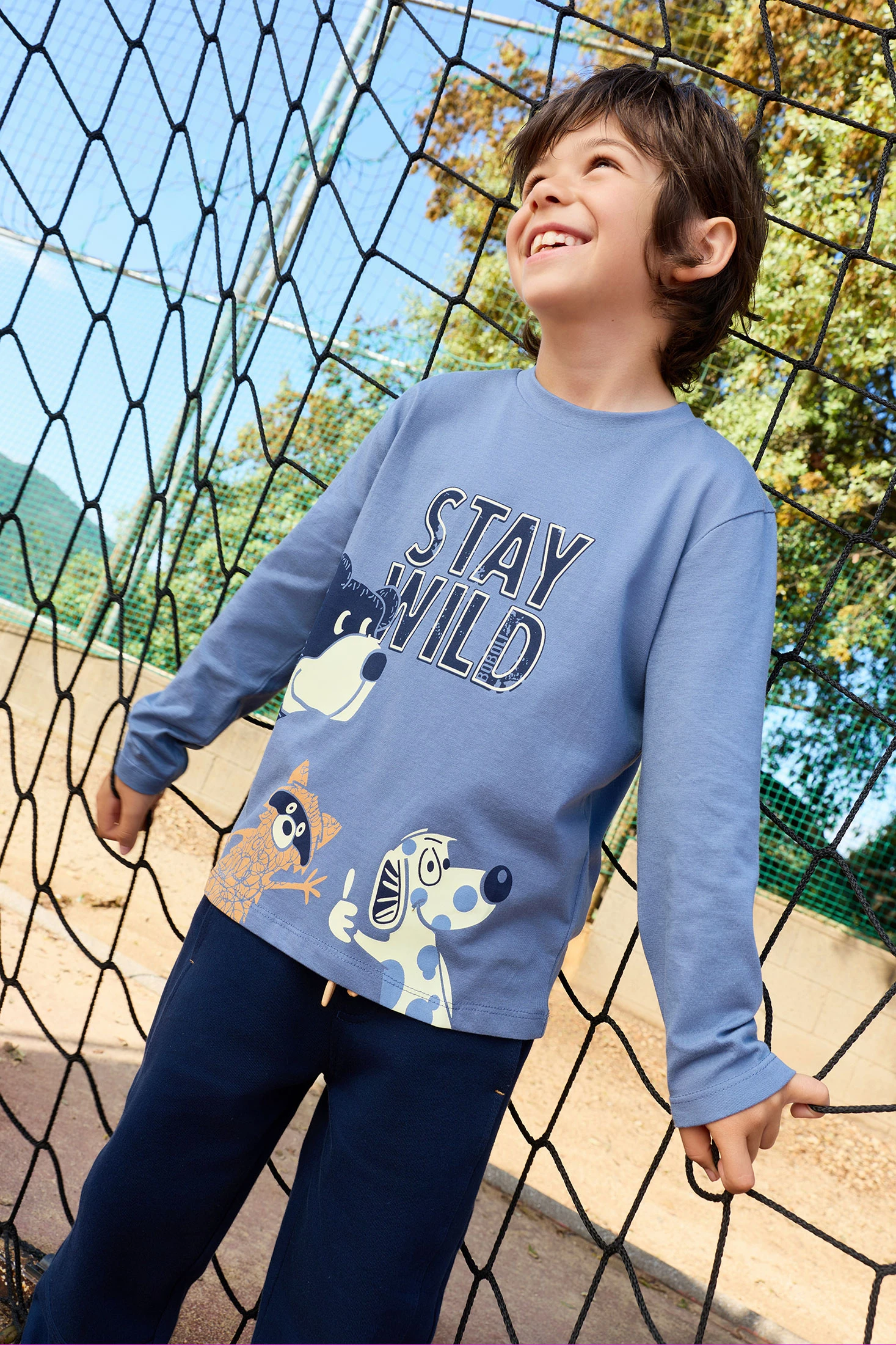 Camiseta de algodão para menino ideal para as temporadas de outono e inverno, proporcionando conforto e calor com o seu tecido suave. A sua estampa de animais e a frase "STAY WILD" no peito acrescentam um toque de diversão e aventura. A cor azul escura é versátil, o que permite combiná-la facilmente com diferentes conjuntos. Disponível em tamanhos que vão desde os 12 meses até os 8 anos, é perfeita para o uso diário. O seu design de gola redonda facilita a sua colocação e garante que os mais pequenos estejam sempre na moda.