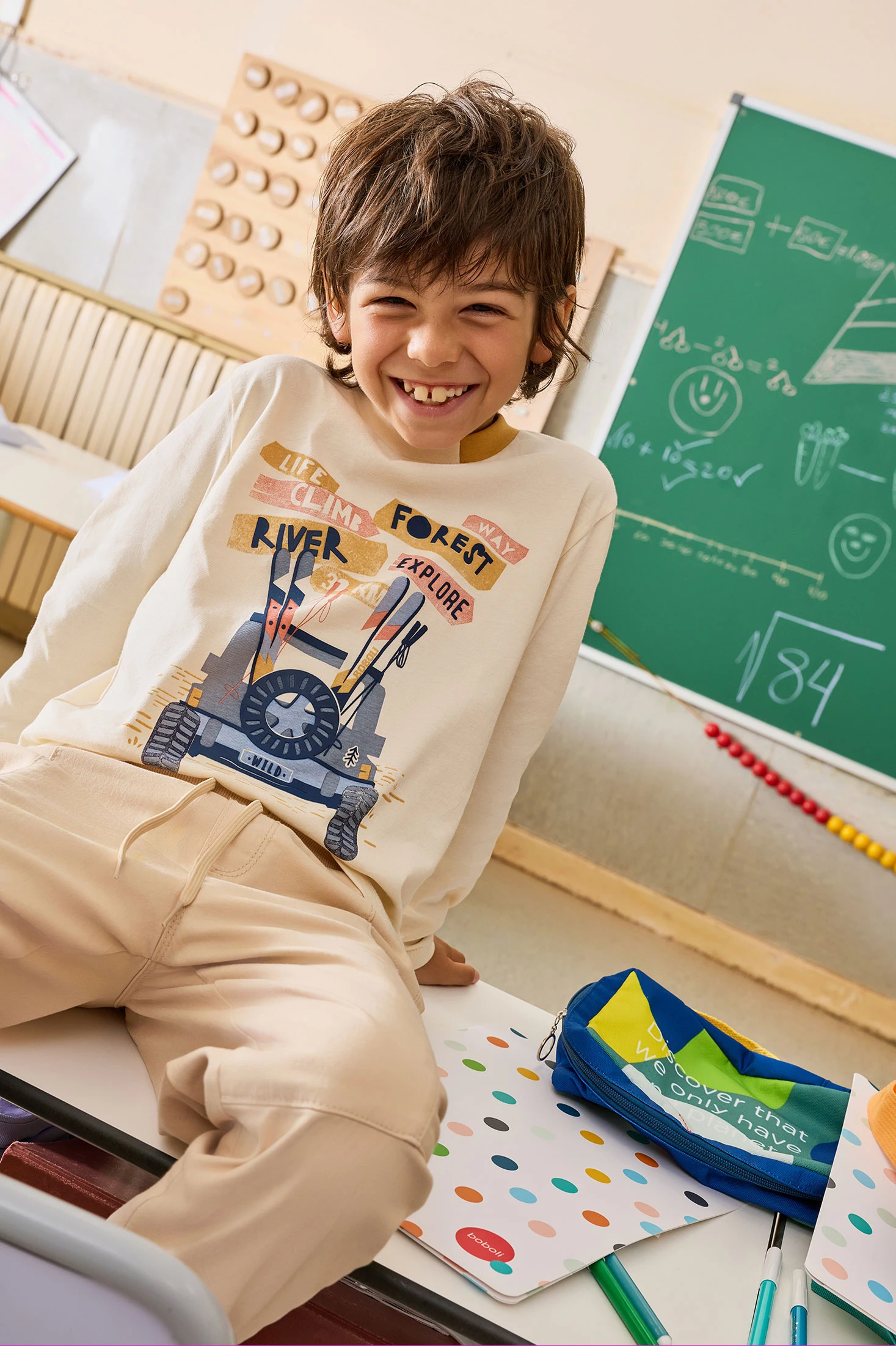 T-shirt de malha para menino em cru, uma escolha encantadora para a roupa do teu pequeno. Confeccionada em malha suave, assegura conforto e liberdade de movimento, sendo ideal para usar em qualquer estação. O seu design conta com divertidos motivos de animais em tons contrastantes, proporcionando um toque lúdico e adorável. Perfeita para combinar com jeans ou calças casuais, está disponível em tamanhos desde 12 meses até 10302140 anos. Uma peça essencial para manter o teu bebé confortável e com estilo!
