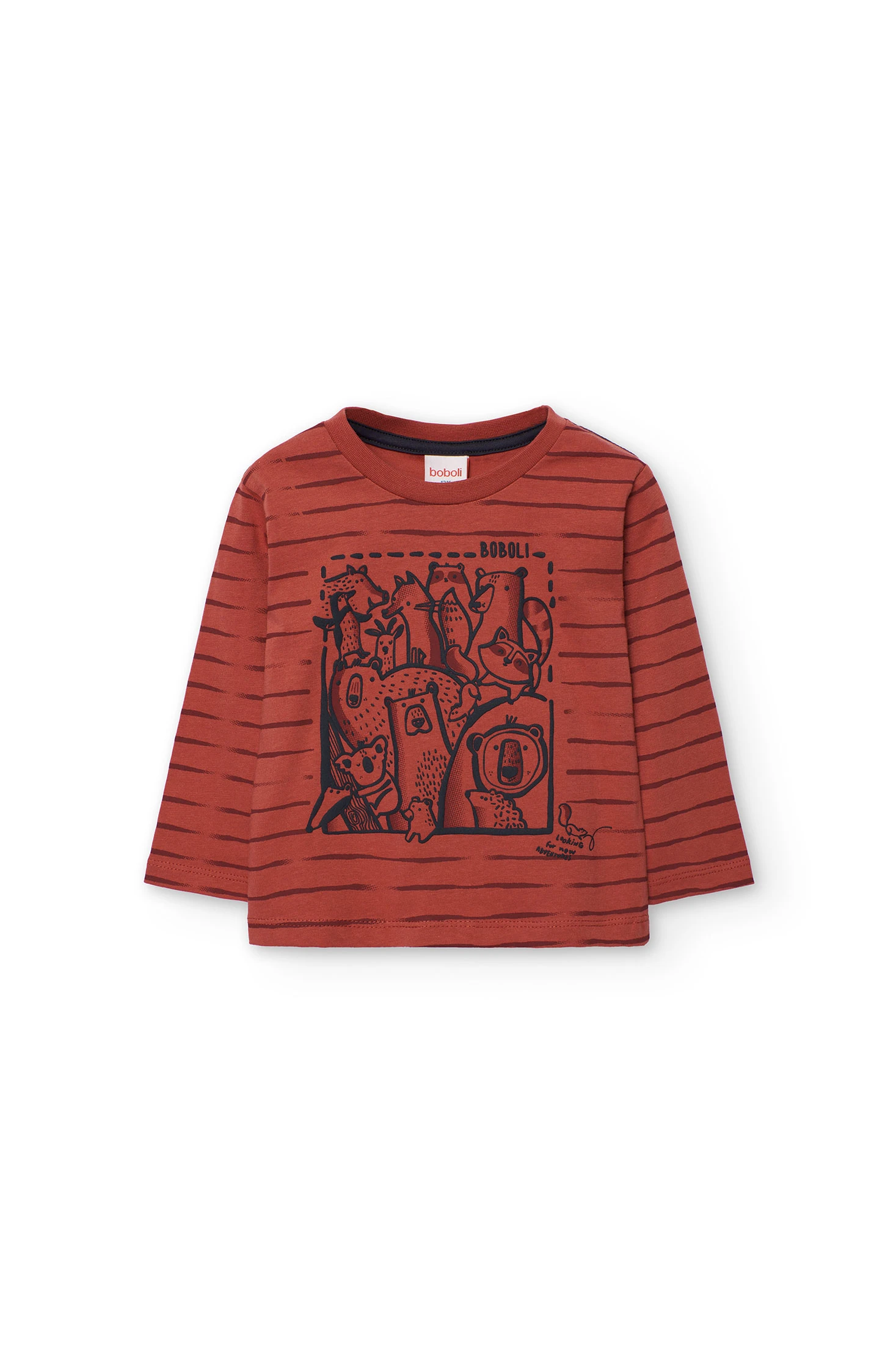 Camiseta de malha para menino num vibrante tom laranja com um divertido estampado de animais na parte frontal, ideal para adicionar um toque lúdico ao guarda-roupa infantil. Confeccionada num tecido suave e confortável, é perfeita para os meses de outono e inverno, assegurando frescura e estilo. Gola redonda que facilita a sua colocação e uso diário. Disponível em tamanhos desde 12 meses até 10 anos, esta camiseta é versátil e combina facilmente com calças leves para qualquer ocasião.