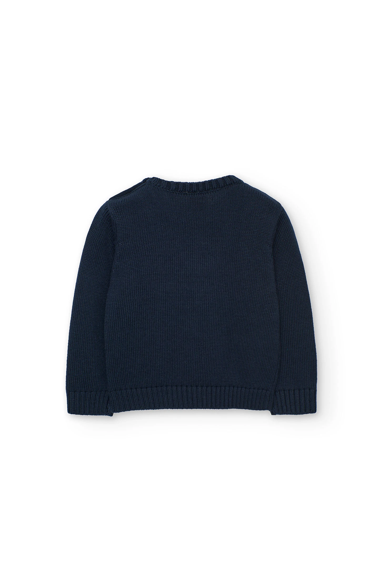 Camisola de malha em azul-marinho para menino, que apresenta um elegante detalhe de urso na frente, ideal para manter o teu pequeno protegido durante o outono e inverno. Confeccionada com materiais suaves e de alta qualidade, oferece conforto durante todo o dia. Disponível em tamanhos desde 12 meses até 10 anos, é uma opção versátil que combina facilmente com calças de cores neutras ou jeans. Perfeita para o uso diário, esta camisola adiciona um toque de estilo náutico ao guarda-roupa infantil.
