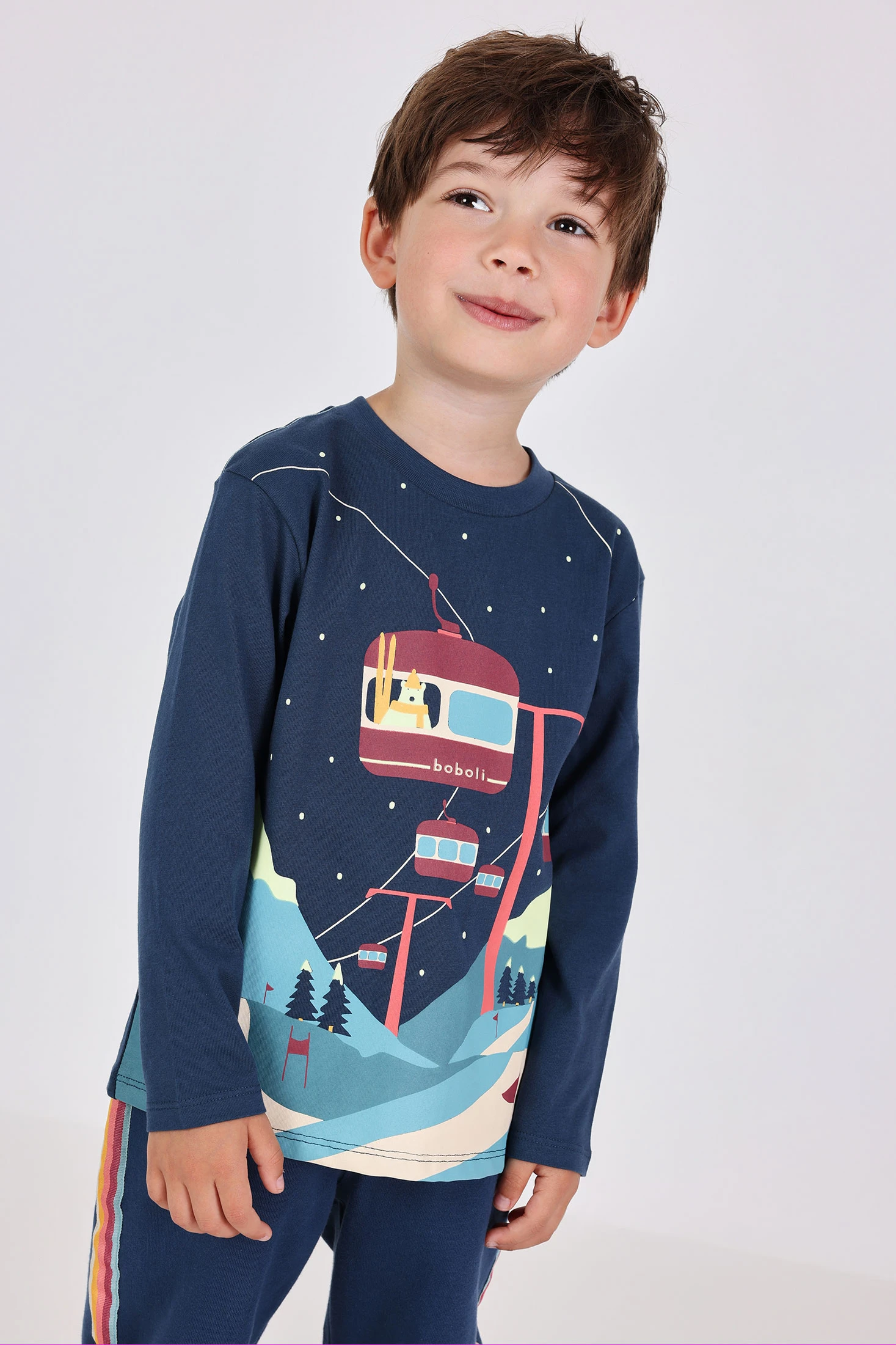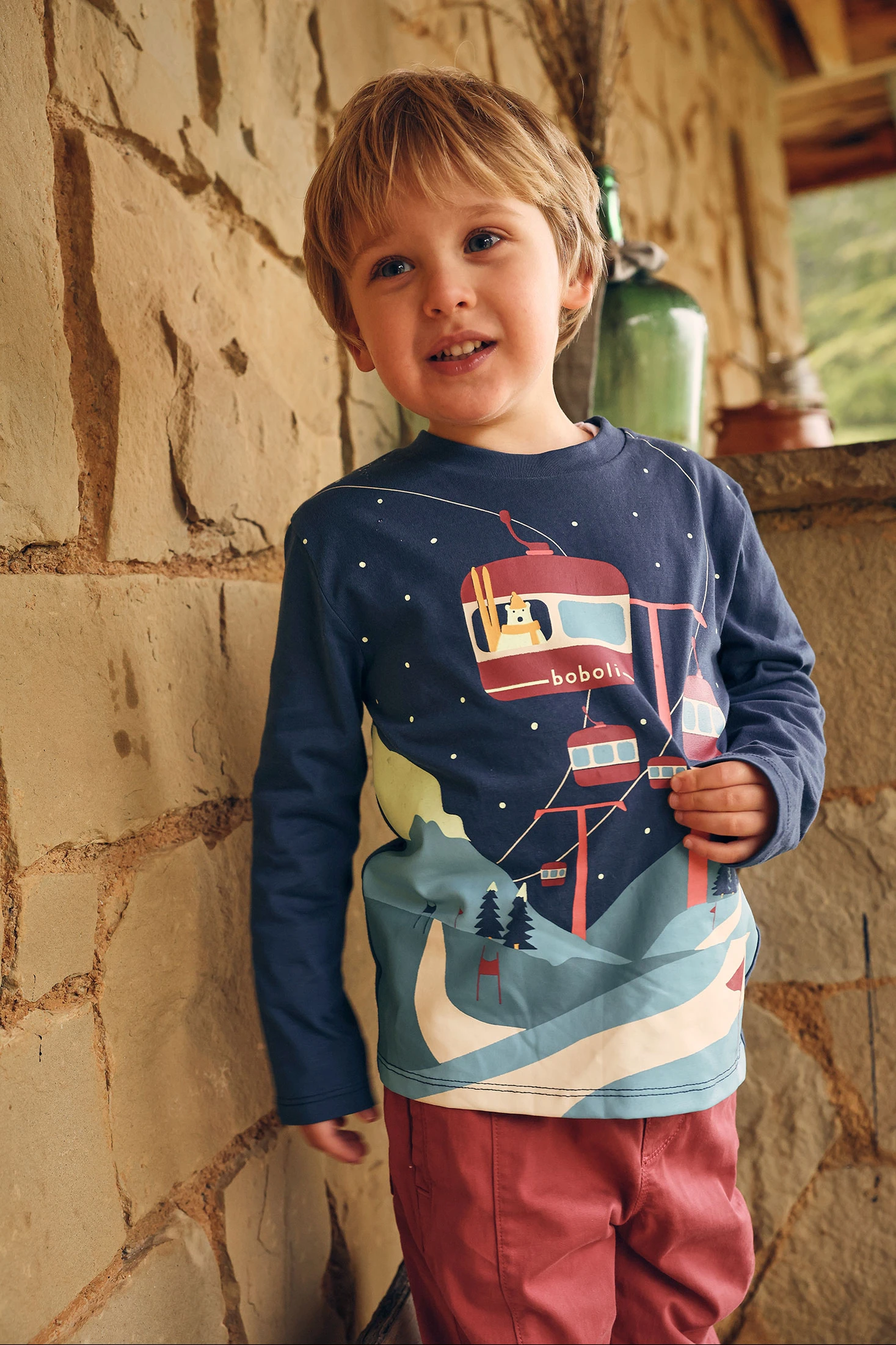 T-shirt de malha azul para menino destaca-se pelo seu encantador design de um teleférico numa paisagem nevada, que adiciona um toque divertido e moderno ao vestuário infantil. Feita de algodão de malha suave, esta peça oferece conforto e calor durante o outono e inverno. Com a sua gola redonda e manga comprida, é perfeita para combinar com jeans ou calças casuais. Disponível em tamanhos dos 12 meses aos 10 anos, adapta-se ao crescimento do seu pequeno. Ideal para manter as crianças aquecidas nos dias frios enquanto estão na moda.