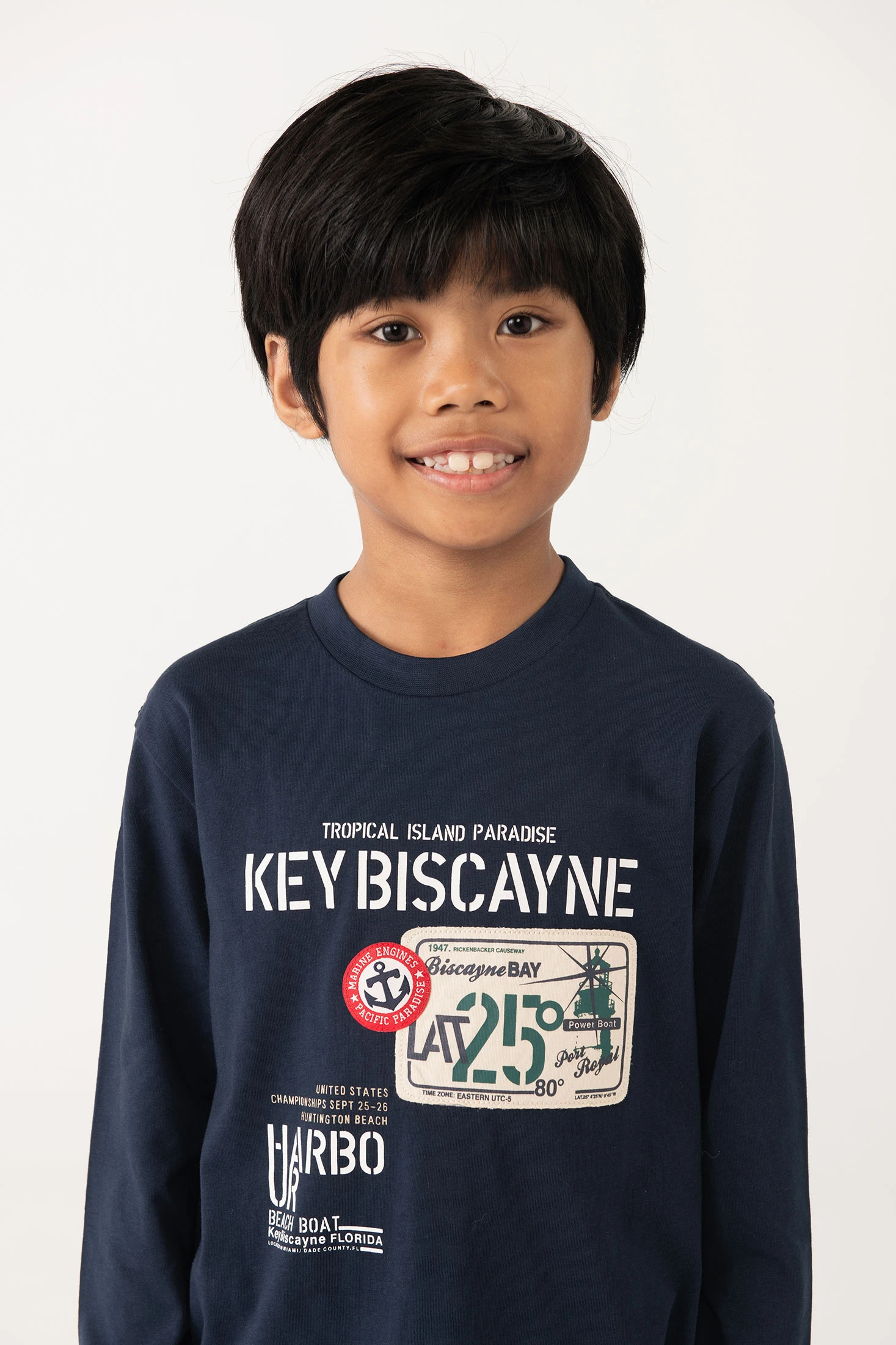 T-shirt de malha azul-marinho para criança, peça essencial para o outono e inverno. Confeccionada com um tecido suave que oferece o máximo conforto, o design inclui texto e gráficos que trazem um toque moderno e atrativo. Conta com gola redonda e mangas compridas, ideal para manter os pequenos aquecidos nos dias mais frescos. Disponível em tamanhos desde 2 até 14 anos, a sua versatilidade torna-a perfeita para combinar com jeans ou calças, adaptando-se a múltiplos estilos e ocasiões.